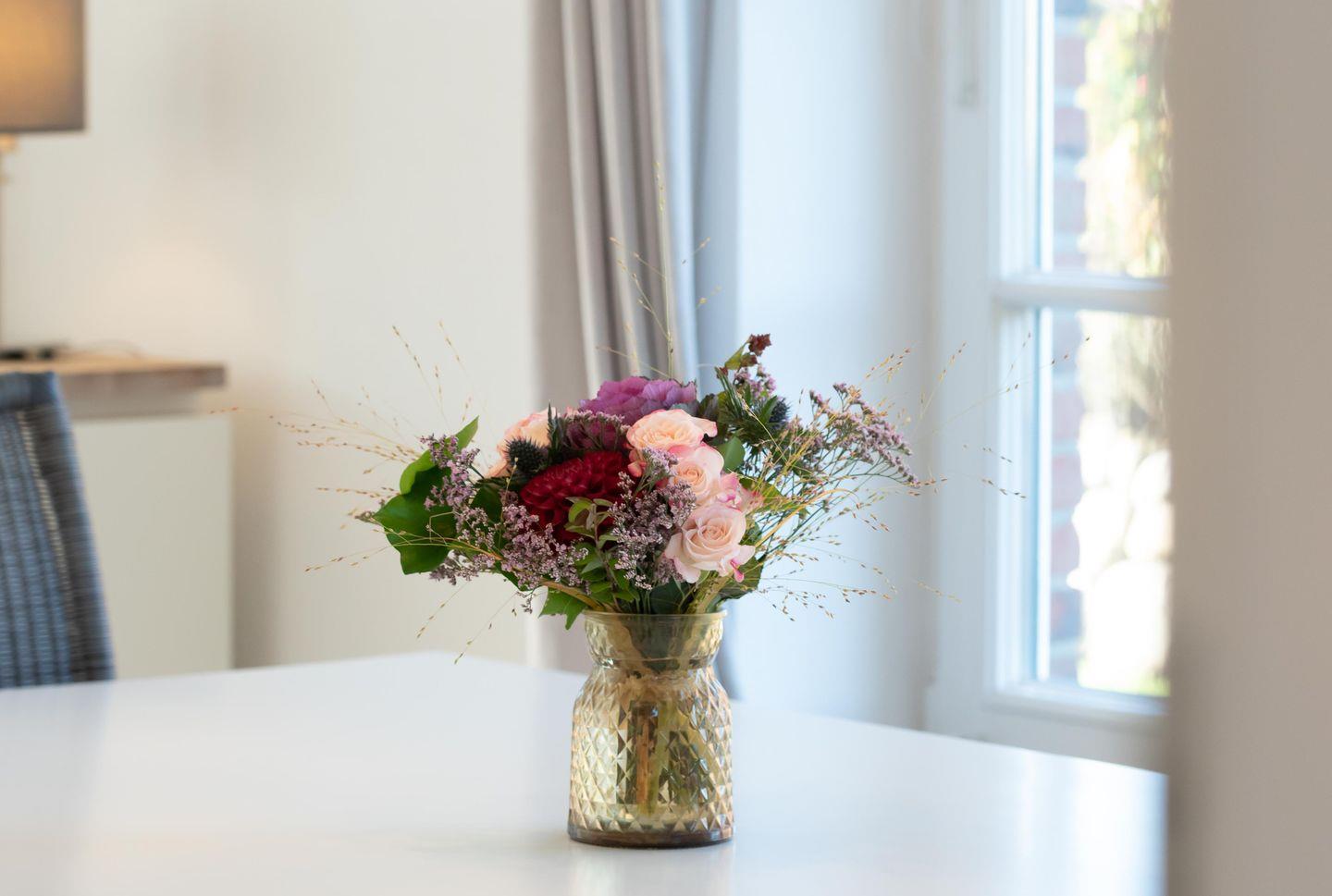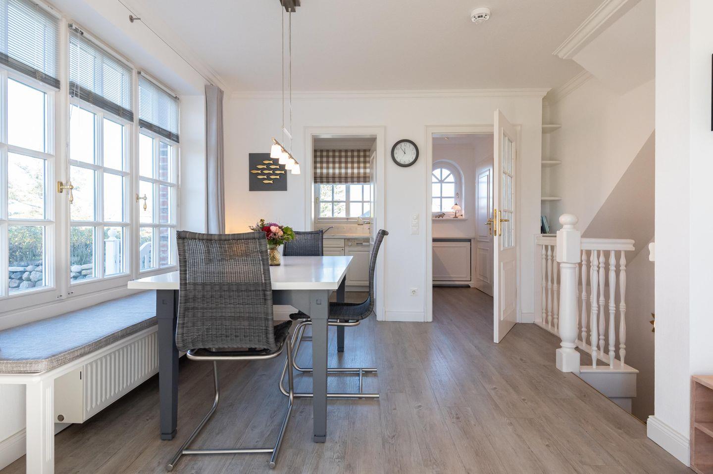 Im lichtdurchfluteten Erdgeschoss befindet sich ein kleiner Flur mit Garderobe und Schuhschrank und die gut ausgestattete Küche mit direktem Durchgang zum Wohn- und Essbereich: