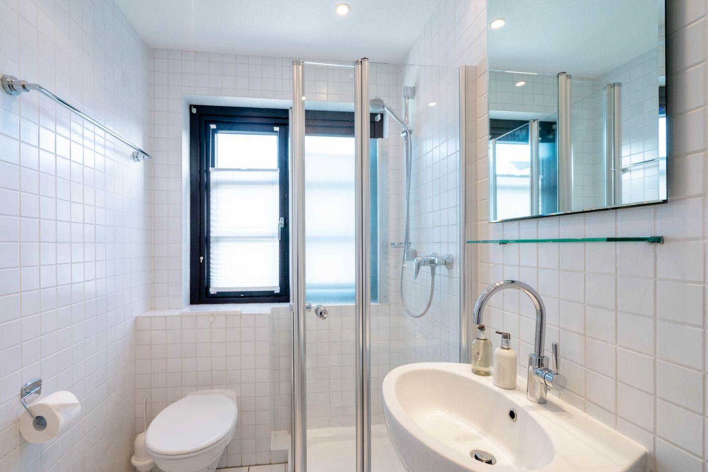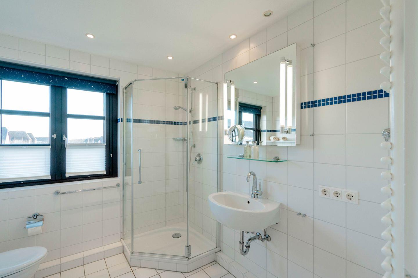 Im Erdgeschoss befindet sich das erste Duschbad/WC. Obergeschoss auf einer Ebene mit den beiden Doppelschlafzimmern finden Sie ein weiteres Duschbad mit WC. Ferner befindet sich im Dachgeschoss ein Gäste-WC.