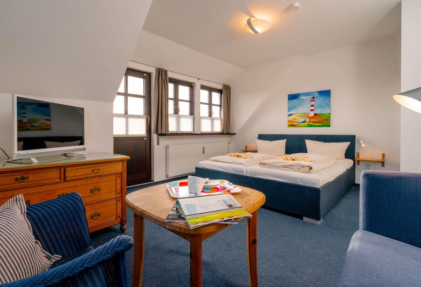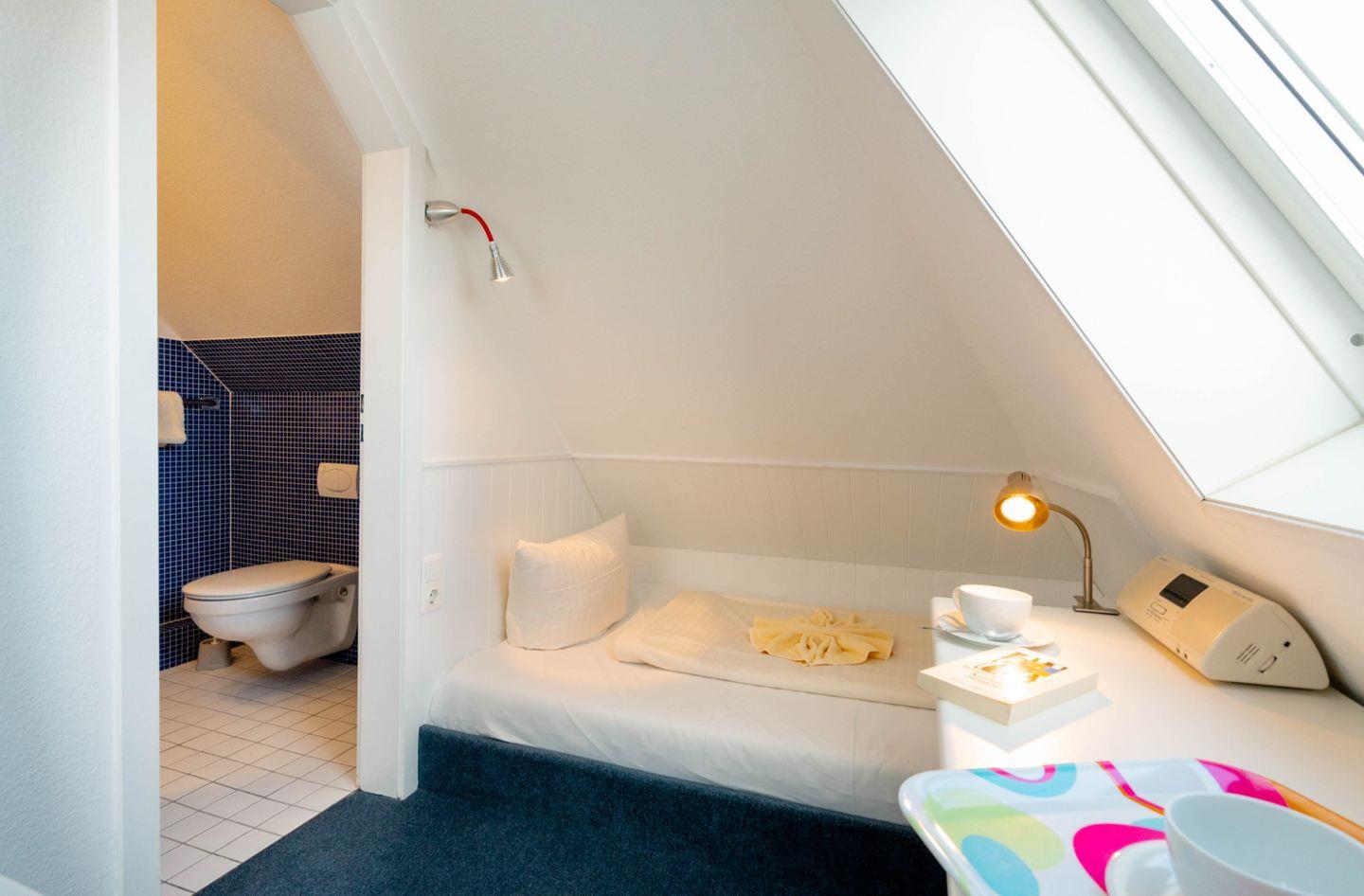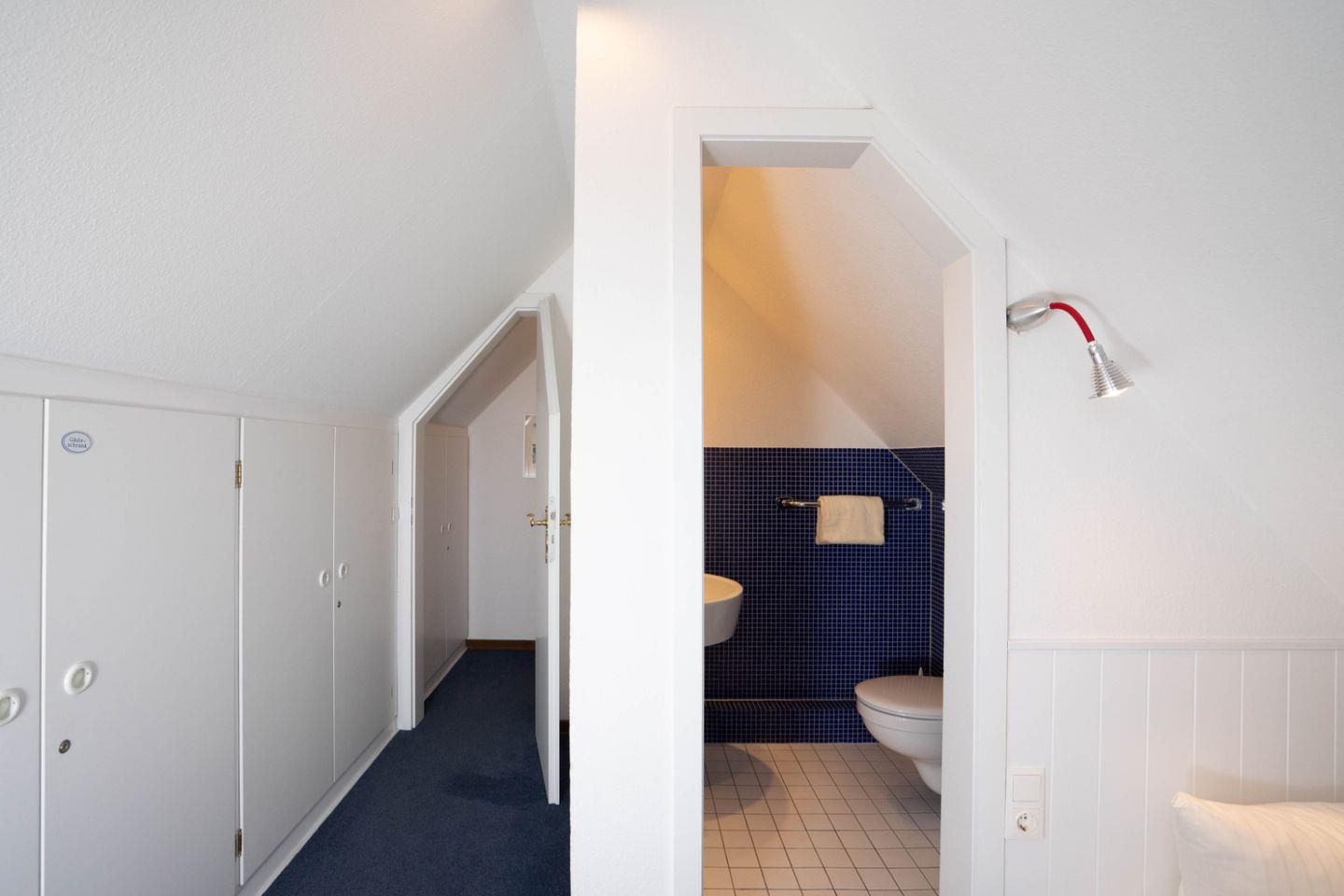 Das Hausteil bietet drei separate Schlafräume. Im Obergeschoss des Hauses befinden sich zwei Schlafzimmer, von denen eines mit einem Boxspringbett (durchgehender Topper) ausgestattet ist und von dem aus Sie darüber hinaus Zugang zu einem eigenen Süd-Balkon genießen. Das andere Schlafzimmer verfügt über zwei Einzelbetten. Zudem befindet sich im Dachgeschoss des Hauses ein Schlafraum mit einen französischem Bett.