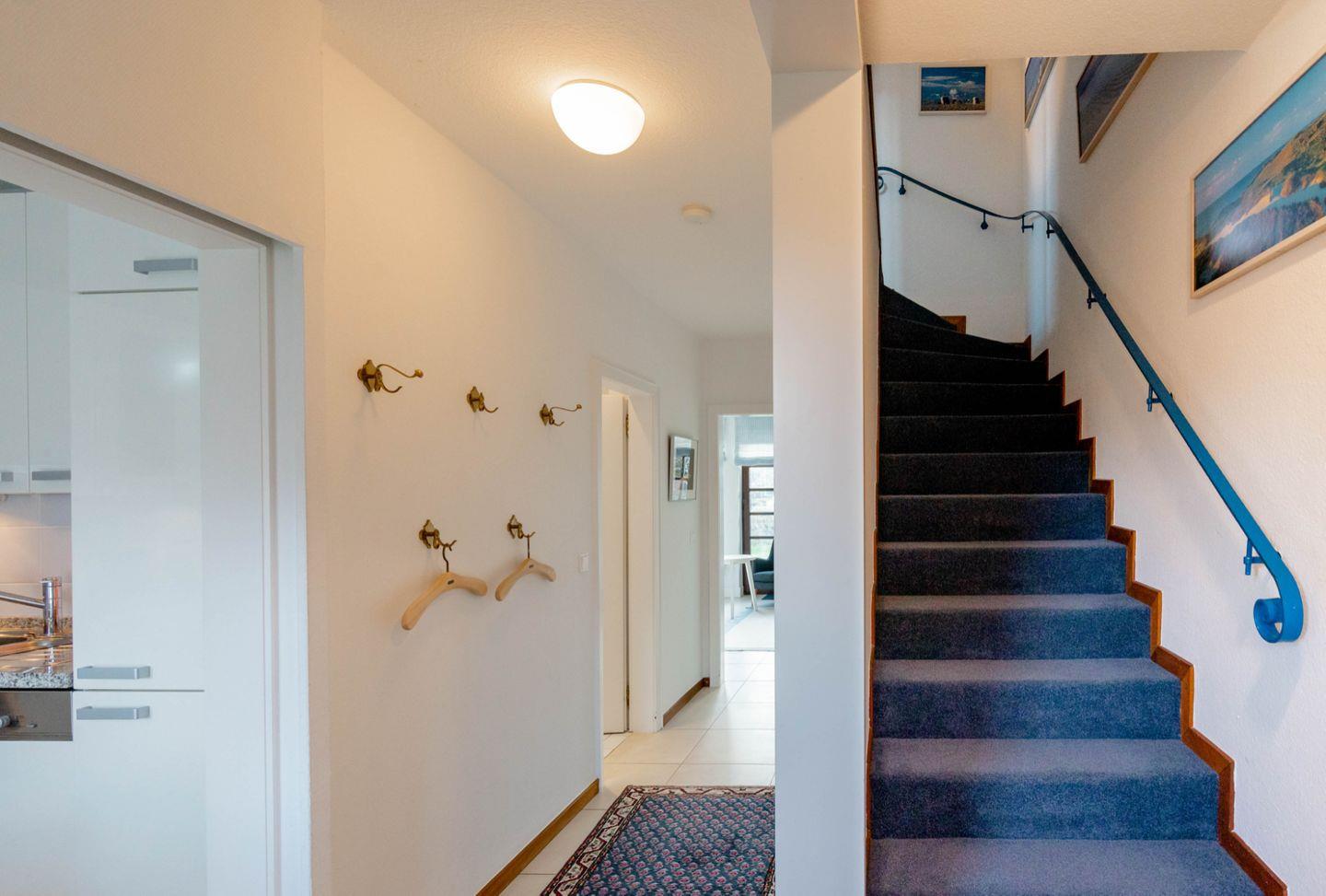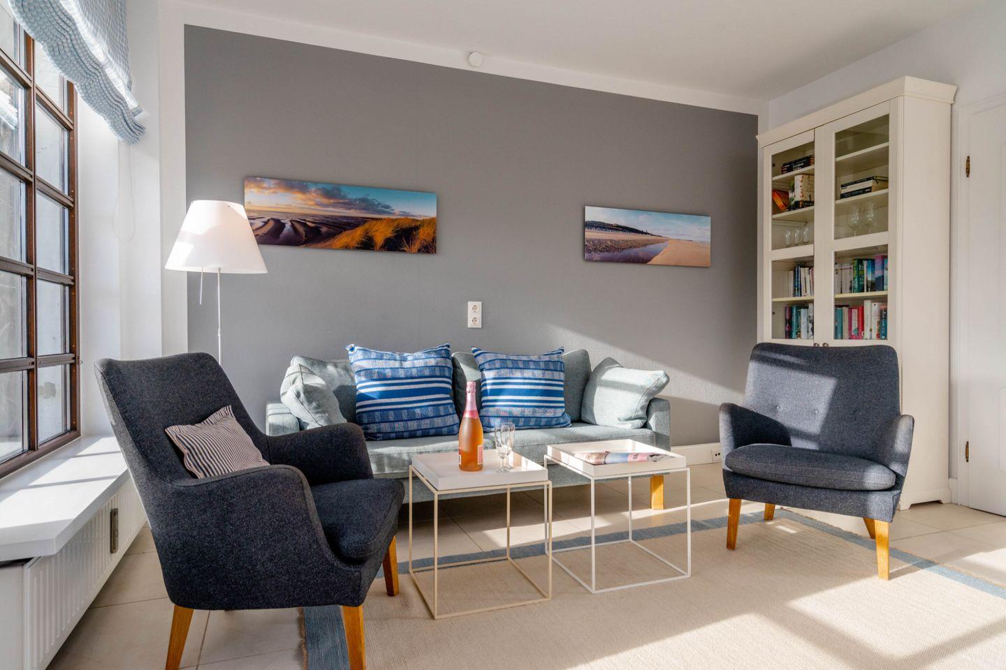 Der in maritimen Farbtönen gehaltene Wohnbereich im Erdgeschoss mit der gemütlichen Sitzecke eignet sich ideal, um sich ausgiebig zu erholen.