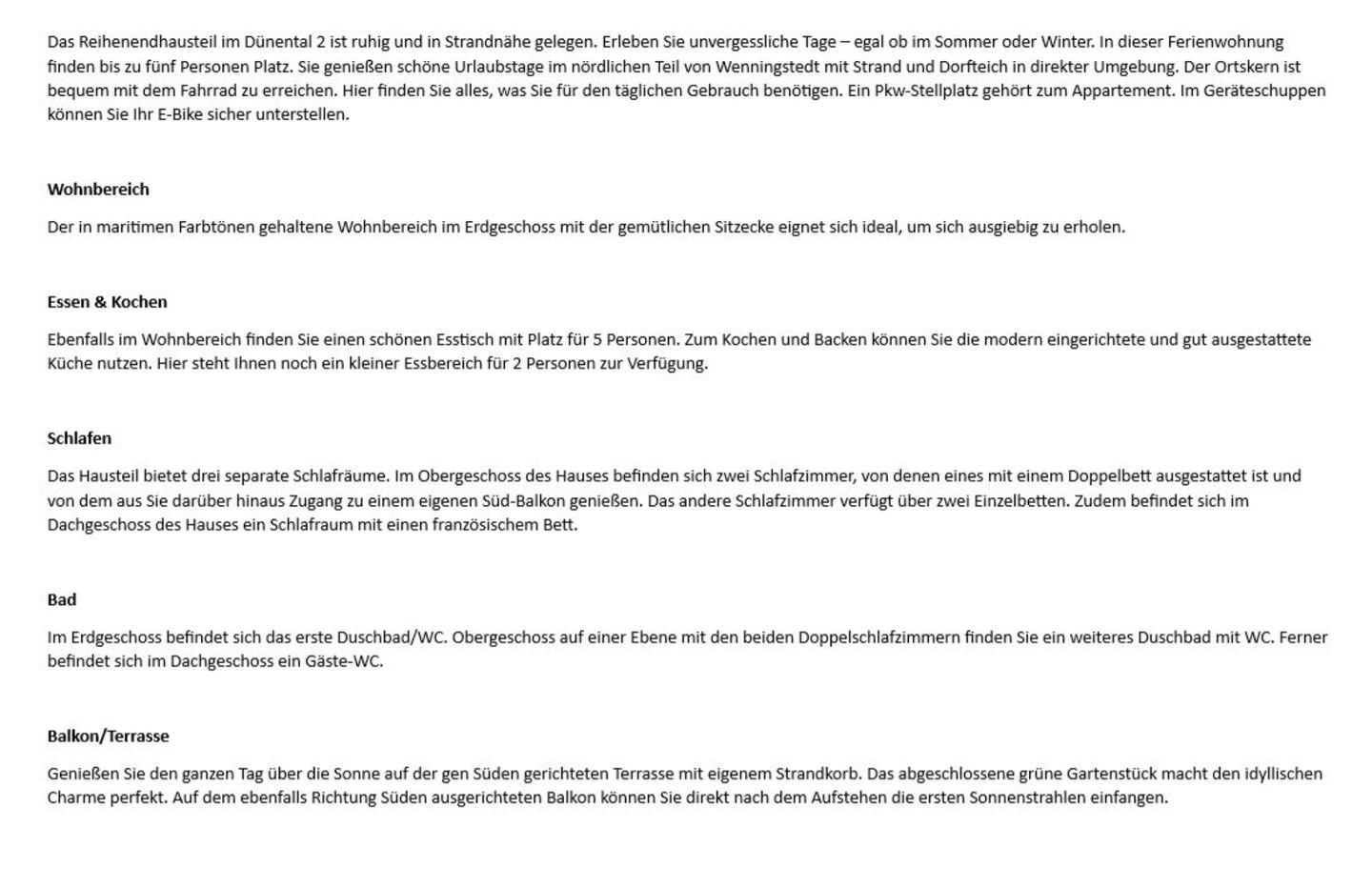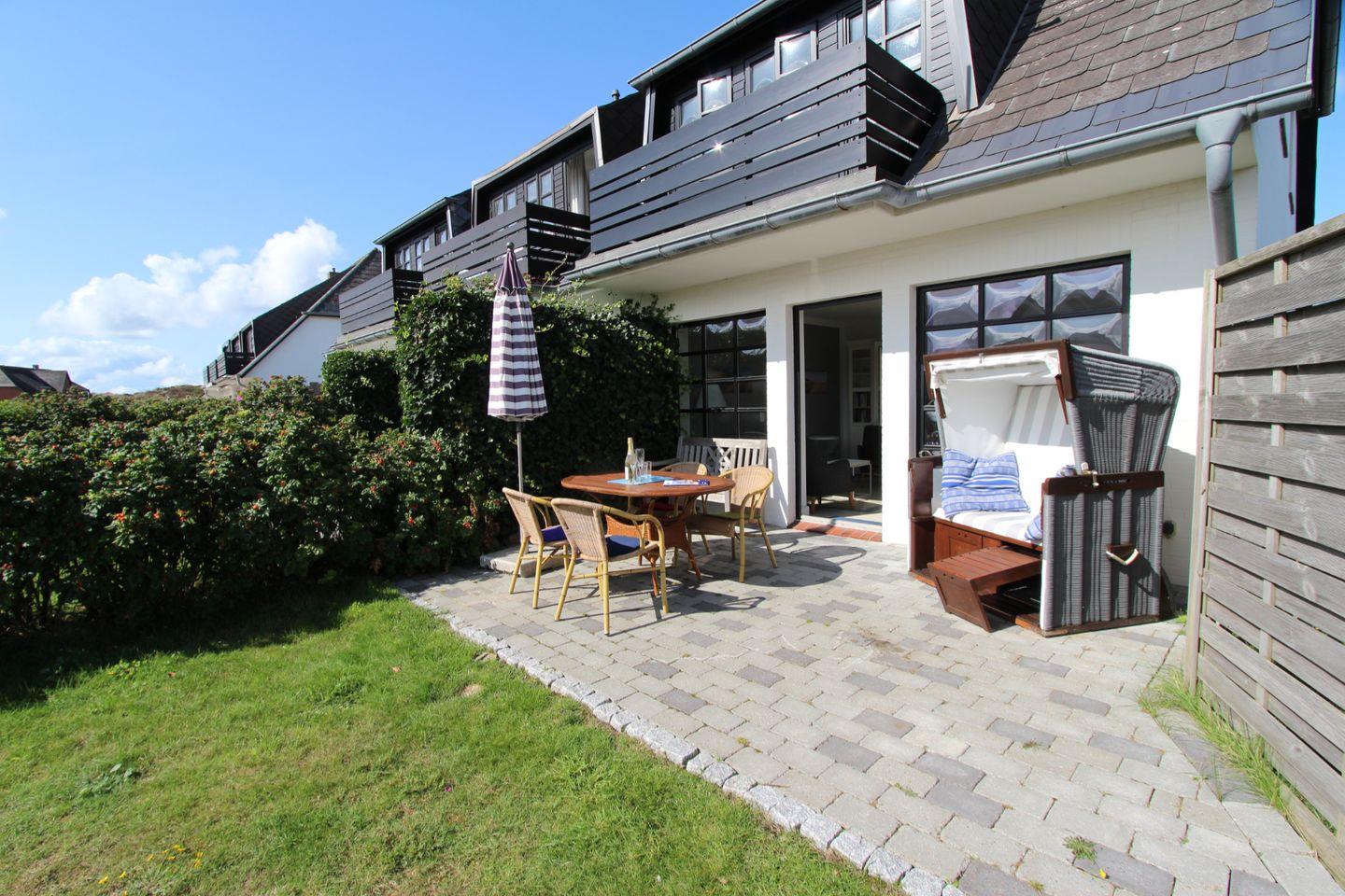 Das Reihenendhausteil im Dünental 2 ist ruhig und in Strandnähe gelegen. Erleben Sie unvergessliche Tage – egal ob im Sommer oder Winter. In dieser Ferienwohnung finden bis zu fünf Personen Platz. Sie genießen schöne Urlaubstage im nördlichen Teil von Wenningstedt mit Strand und Dorfteich in direkter Umgebung. Der Ortskern ist bequem mit dem Fahrrad zu erreichen. Hier finden Sie alles, was Sie für den täglichen Gebrauch benötigen. Ein Pkw-Stellplatz gehört zum Appartement. Im Geräteschuppen können Sie Ihr E-Bike sicher unterstellen.