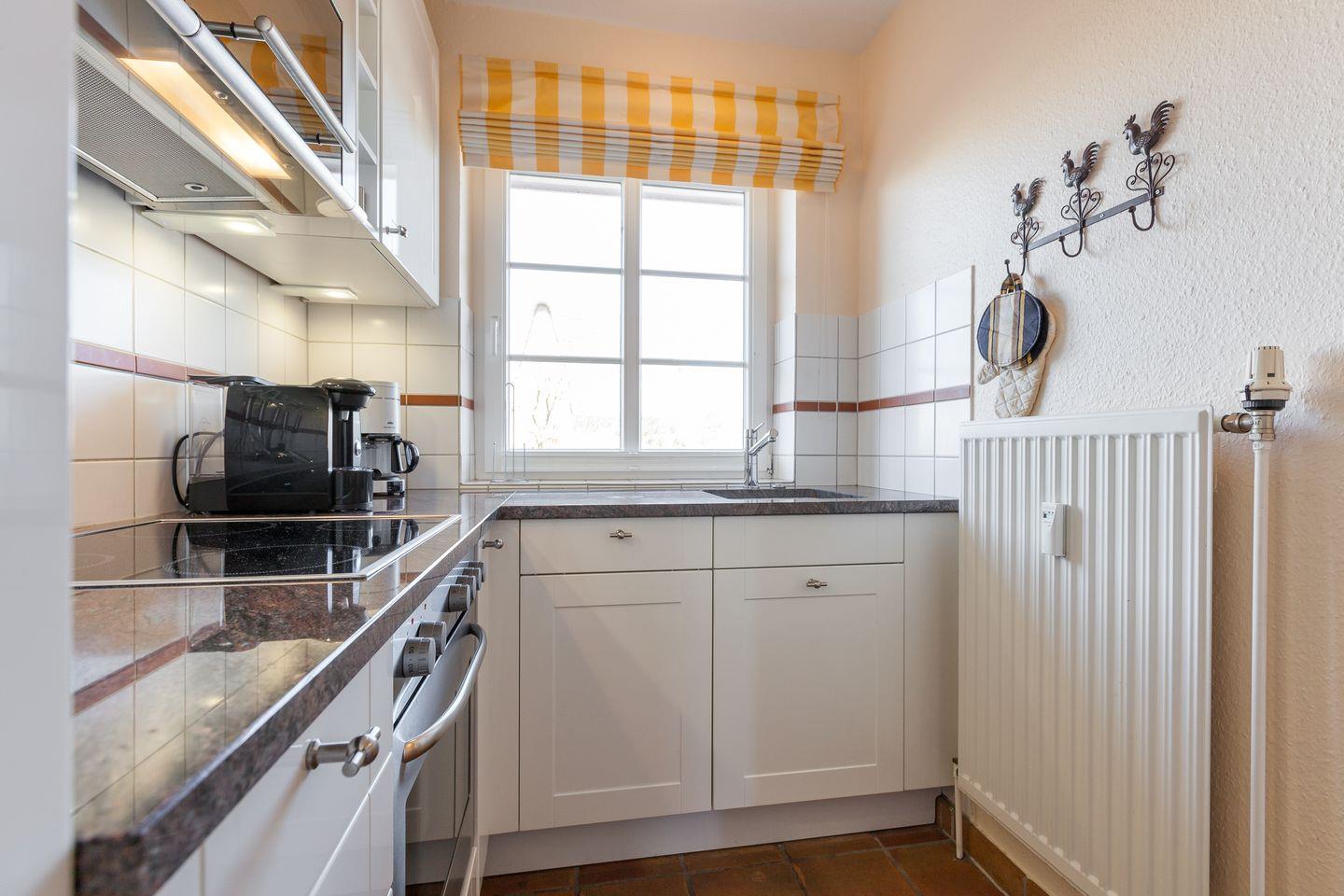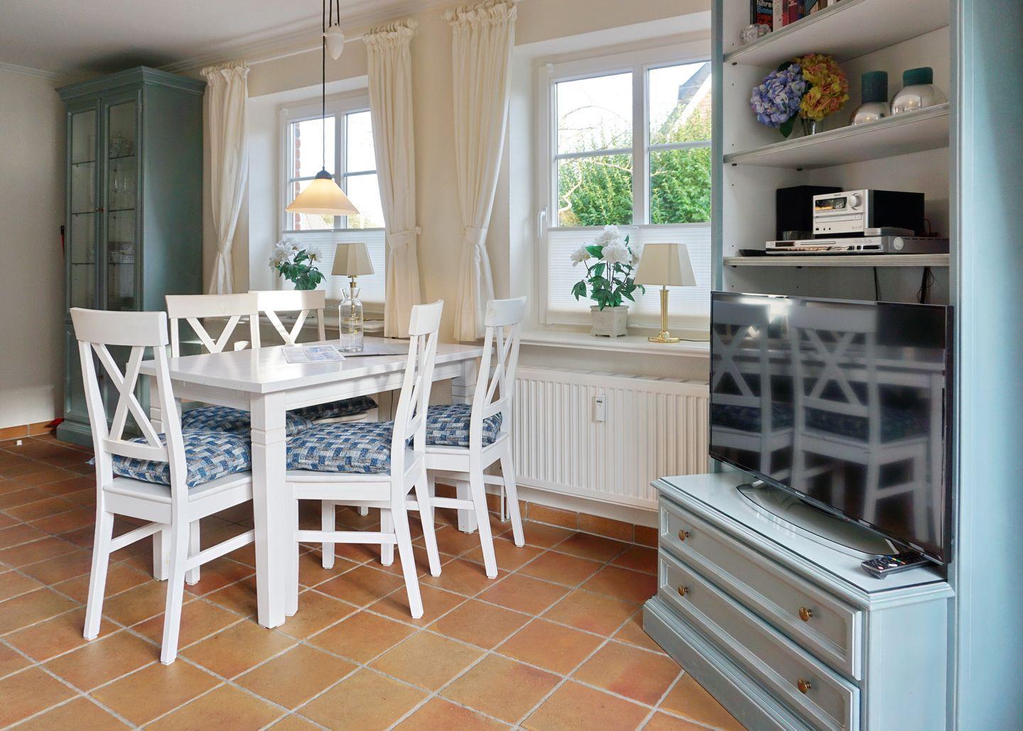 EG: Großzügiger, heller Wohnraum mit Flat-TV, DVD/CD-Player und Radio. Gemütliche Ess-Ecke. Separate, kleine Küche mit Backofen, Geschirrspüler und Microwelle [&] Tassimo Maschine. Gäste-WC. Hübsch angelegter Garten in Südausrichtung, zu genießen auf Ihrer geschützten Terrasse mit Strandkorb und Gartenmöbeln (ca. von April-Oktober).