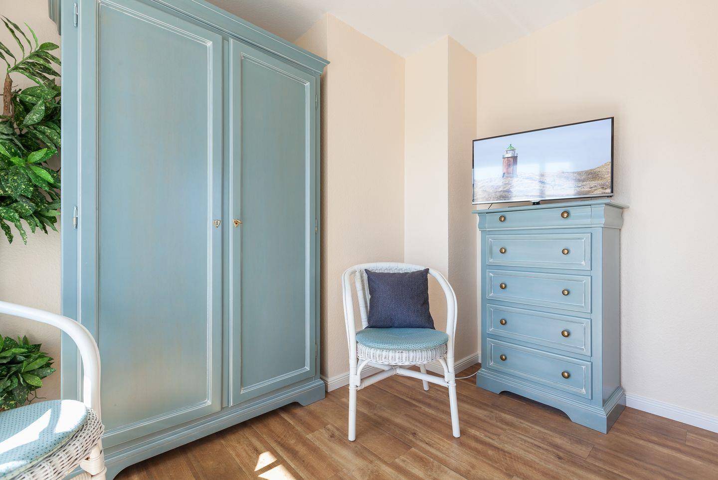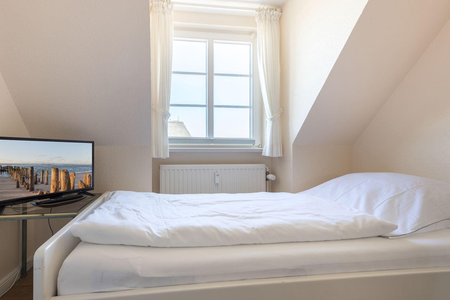 OG: Schöner Masterbedroom mit Doppelbett (ca. 1,8x2m), TV und kleinem Südbalkon. Bad mit Dusche und WC. Ein weiterer kleiner Schlafraum mit Einzelbett (ca. 0,9x1,8m).