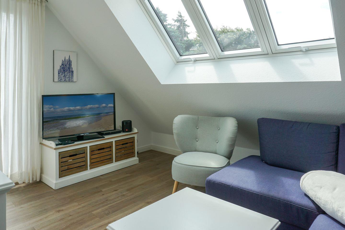 Obergeschoss: Wohnbereich mit Flatscreen-TV, Wlan Anschluss, Radio, Blu-ray-Player,