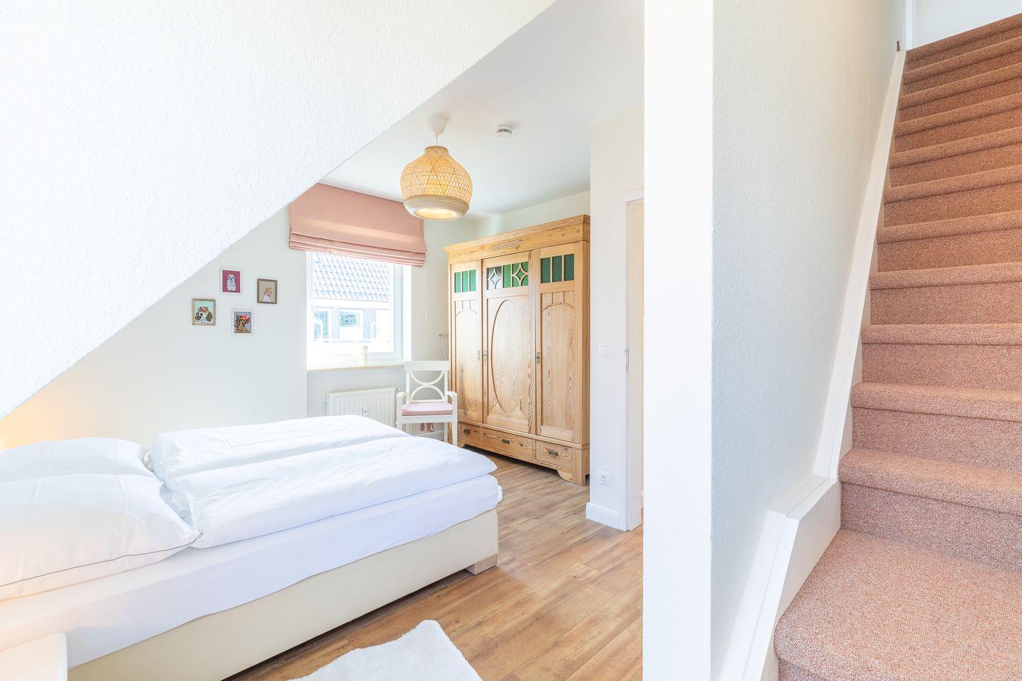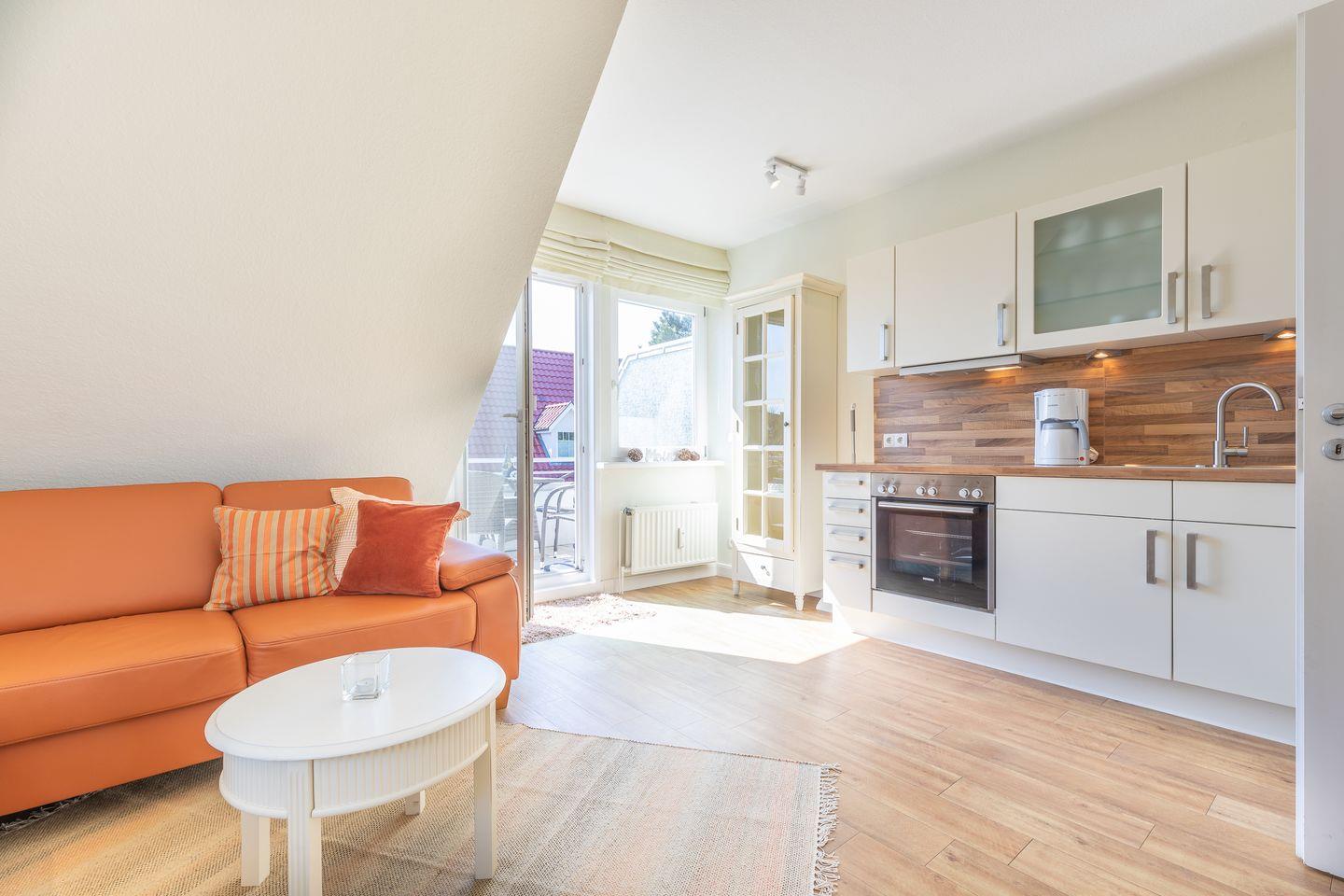 Obergeschoss: Wohnraum mit Flatscreen TV, W-Lan, offener Ess- und Küchenbereich mit Geschirrspüler und Backofen, Kaffeemaschine, Dusche/WC, Balkon mit Gartenmöbeln, Gäste-WC, ein Raum mit einem Doppelbett (180x200cm), Waschmaschine