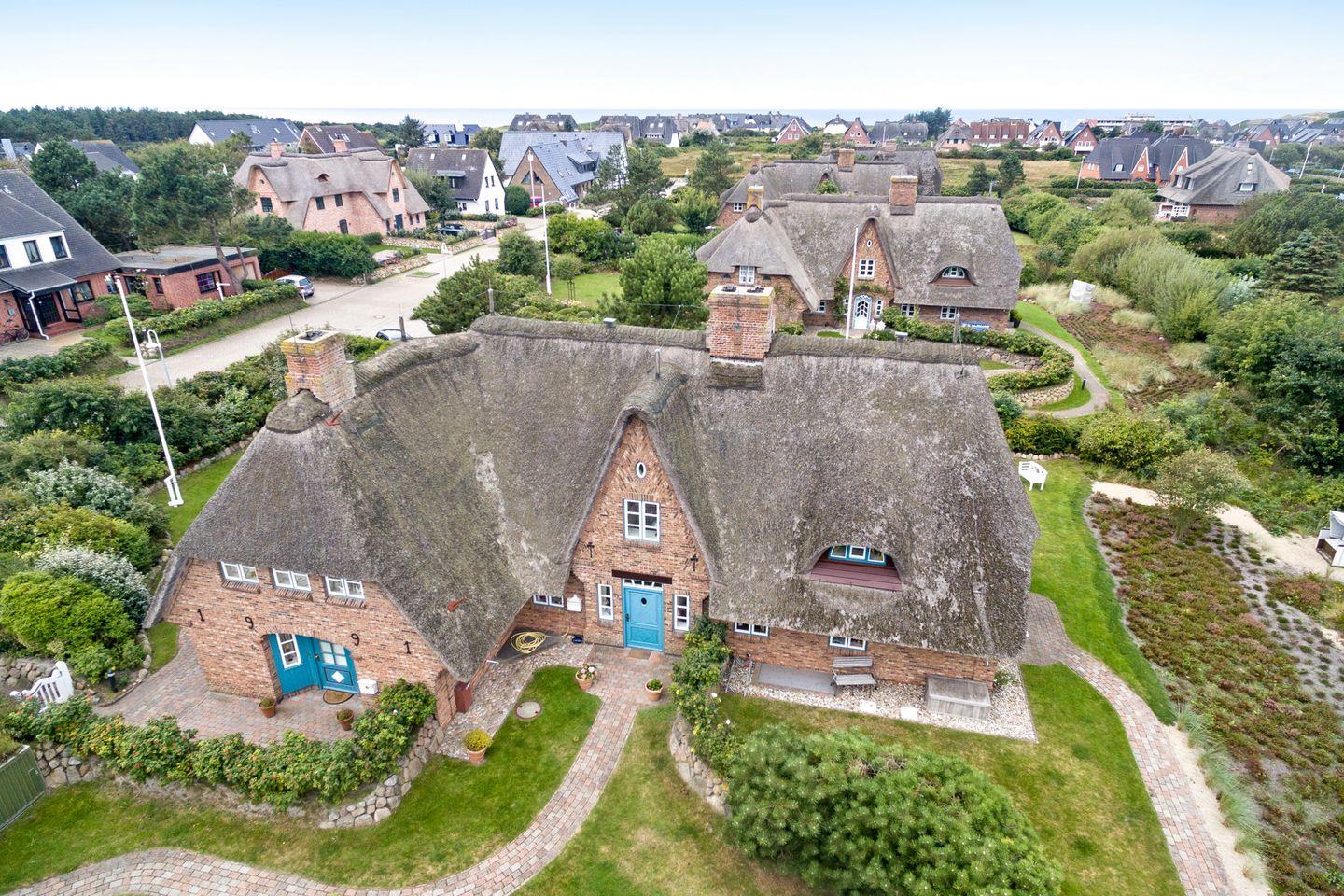 In zentraler Lage Wenningstedts gelegenes, heimeliges Reet-Mittelhausteil mit eigenem Garten. Auf ca. 148 qm Nutzfläche im Erd-, Ober- und Untergeschoss für bis zu 5 Personen.