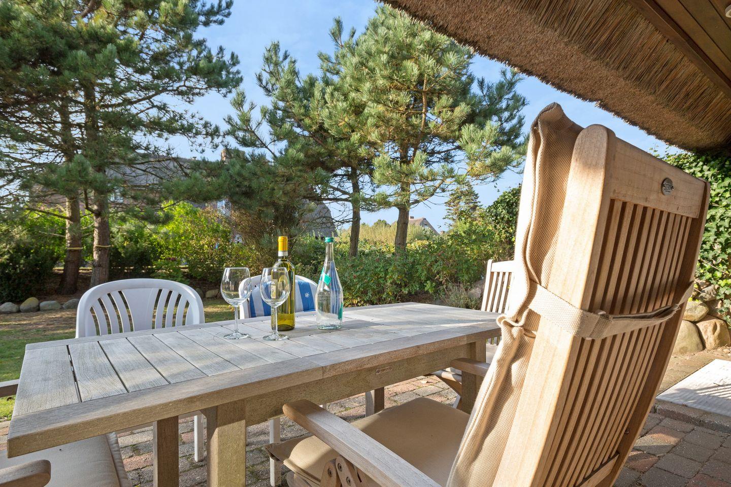 Sylt Open Air genießen Sie am besten in Ihrem sehr schön angelegten, eigenen Garten. Wenn im Osten die Sonne aufgeht, können Sie bereits im Windschatten des Hauses entspannt den Tag genießen. Durch die Westausrichtung können Sie auch noch am Nachmittags in Ihrem Strandkorb die Sylter Sonne ausgiebig genießen.