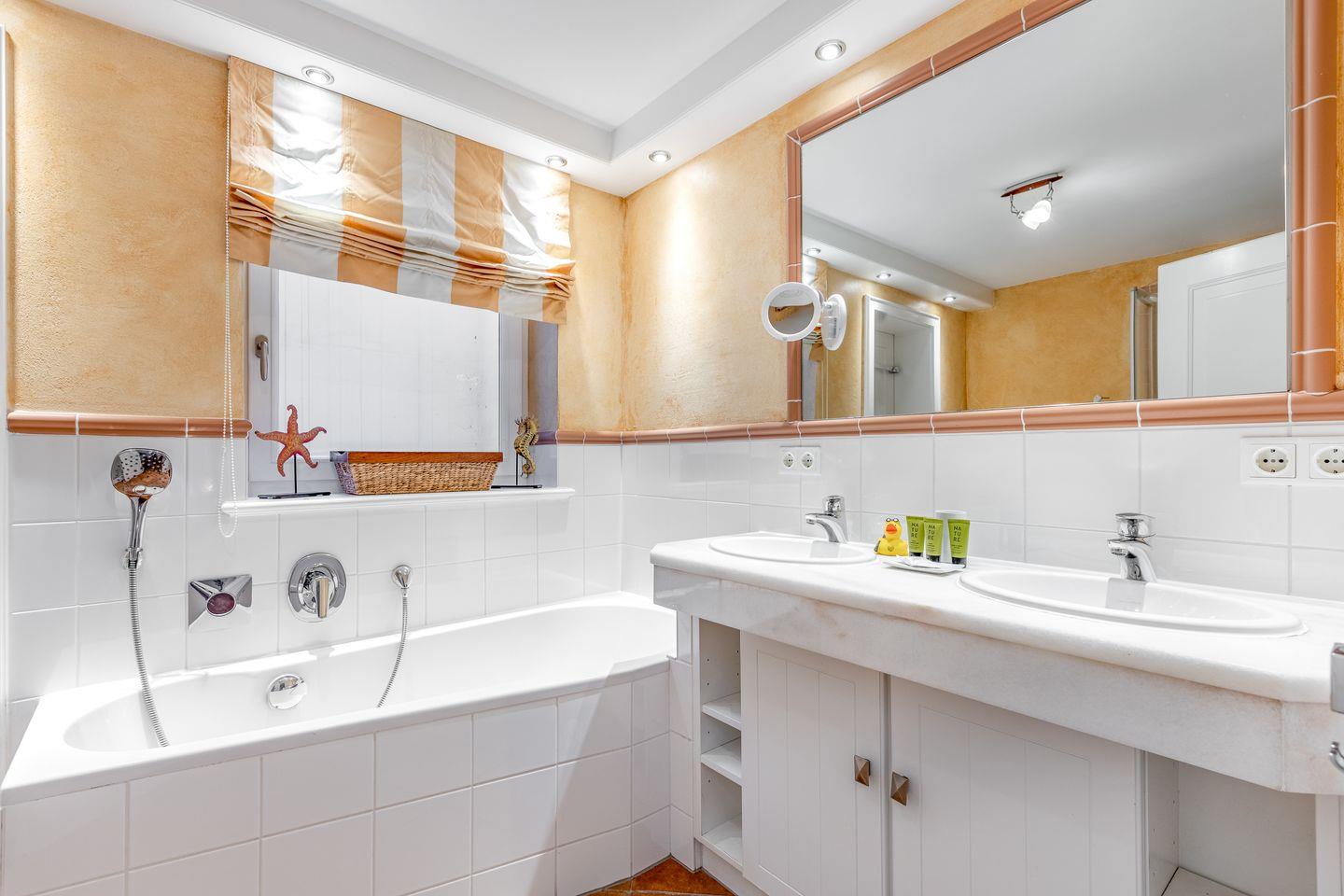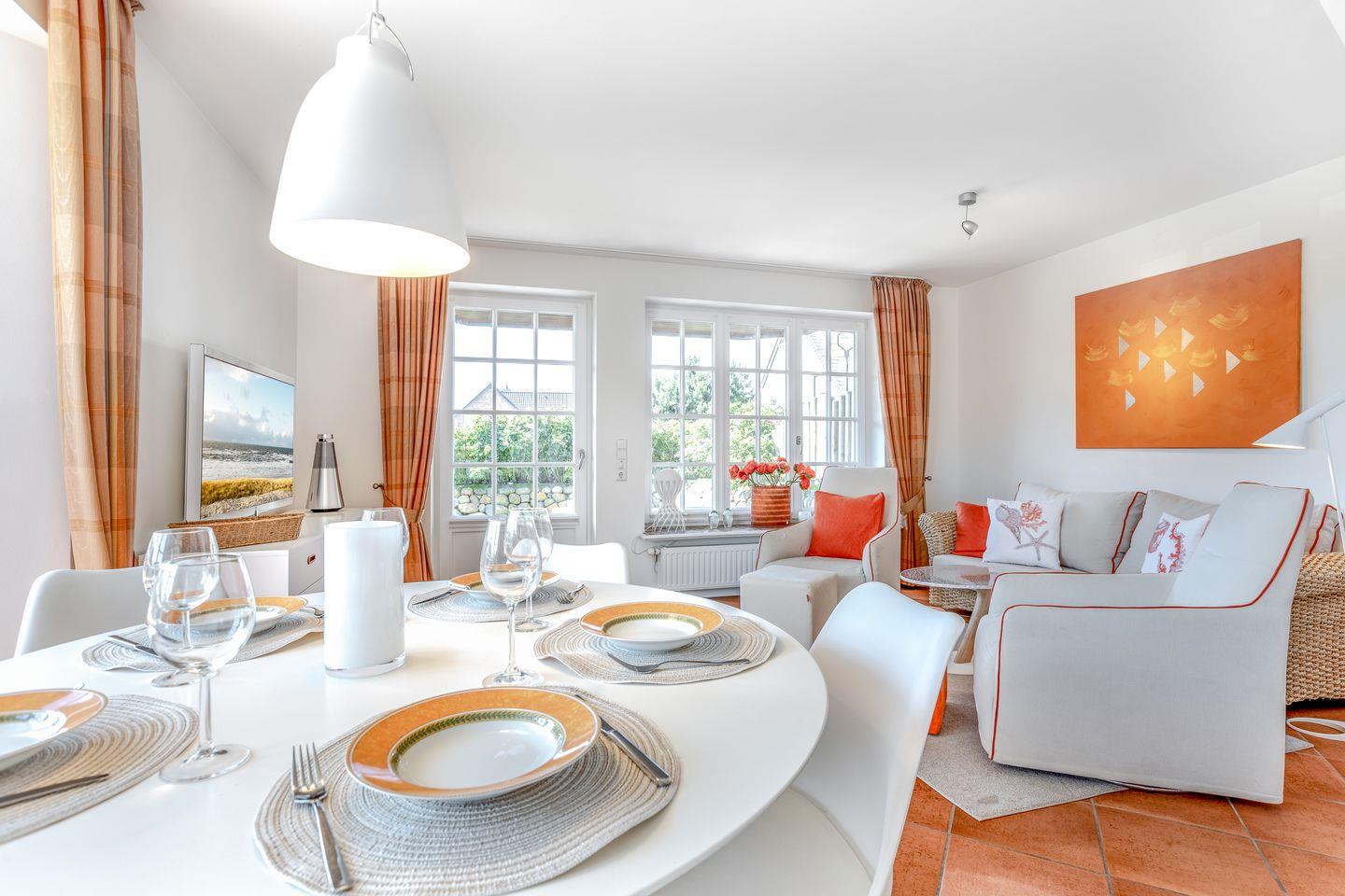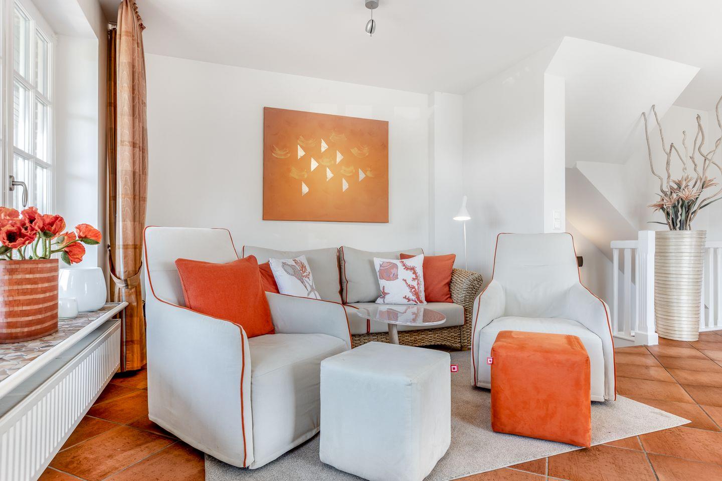 Erdgeschoss: Sehr geschmackvoll und farblich gekonnt aufeinander abgestimmte Möblierungen, Farben und Stoffe. Loewe Individual 46 Zoll Flatscreen-TV und externer Lautsprecher mit eingebautem Digitalrecorder, Hifi-Anlage und Telefon. DSL-Anschluss inkl. kostenloser und kabelloser Internetnutzung per W-Lan. Luxuriöse integrierte Küche mit Geschirrspüler und Backofen. Design-Gäste-WC. Sonnige West-Terrasse mit Rattan-Gartenmöbeln, Strandkorb (ca. von April-Oktober) und individuell regelbarem Heizstrahler.
