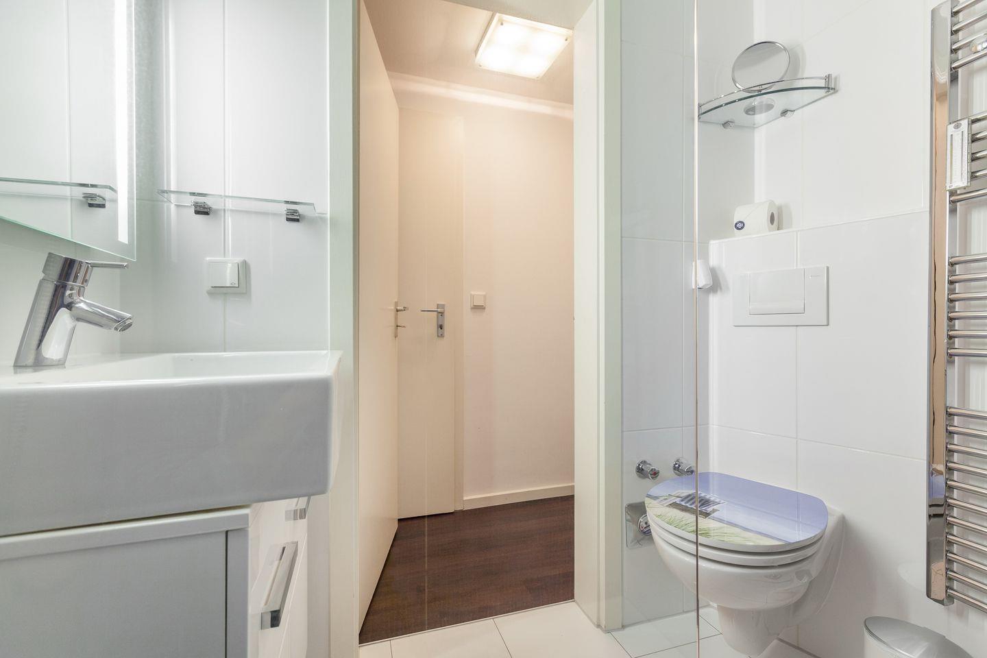 Im Untergeschoss der Wohnung finden Sie einen großen Raum mit Boxspringbett, viel Schrankplatz und einem 3D-Flatscreen TV. Auf gleicher Etage erwartet Sie ein Design-Badezimmer mit Dusche und WC.