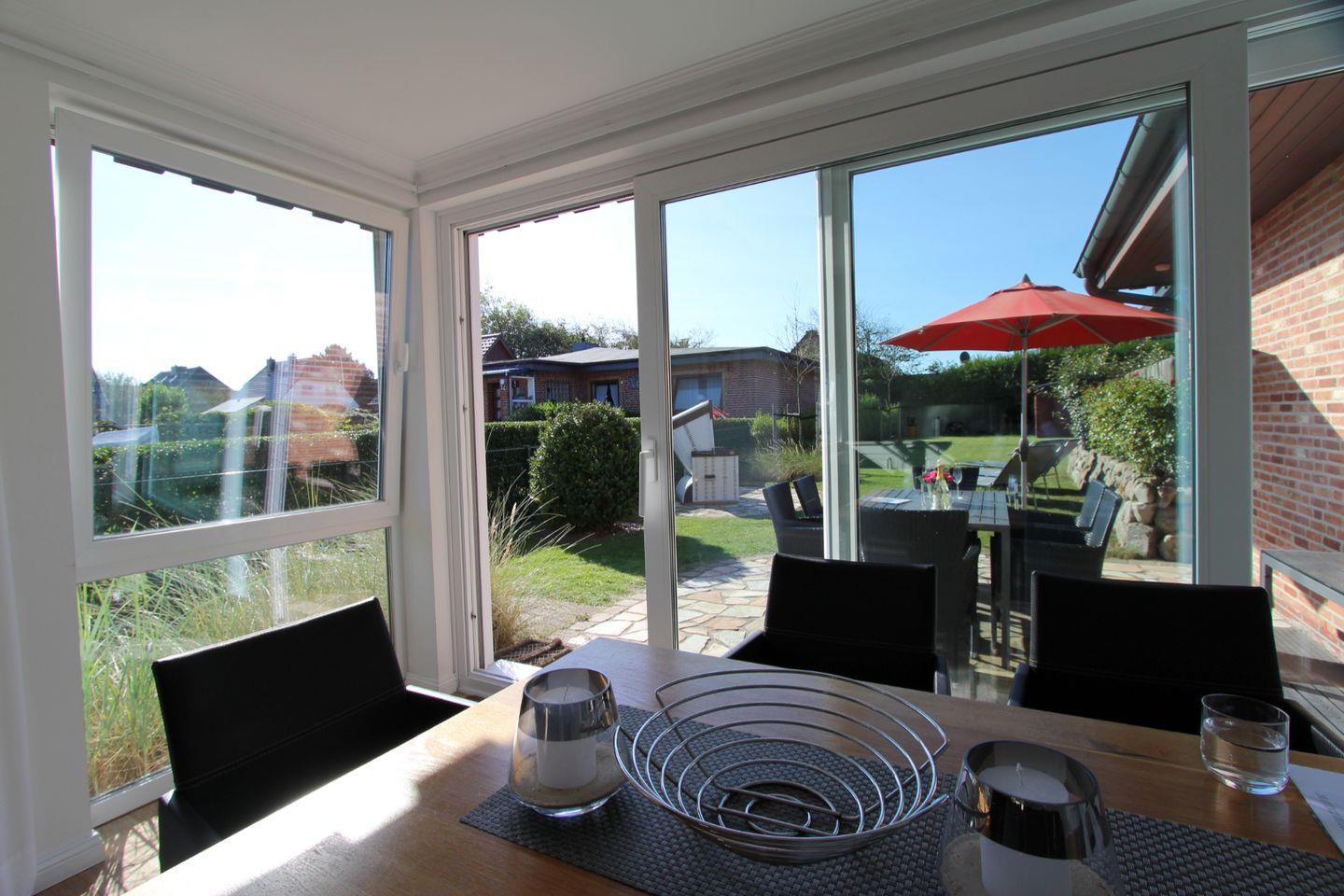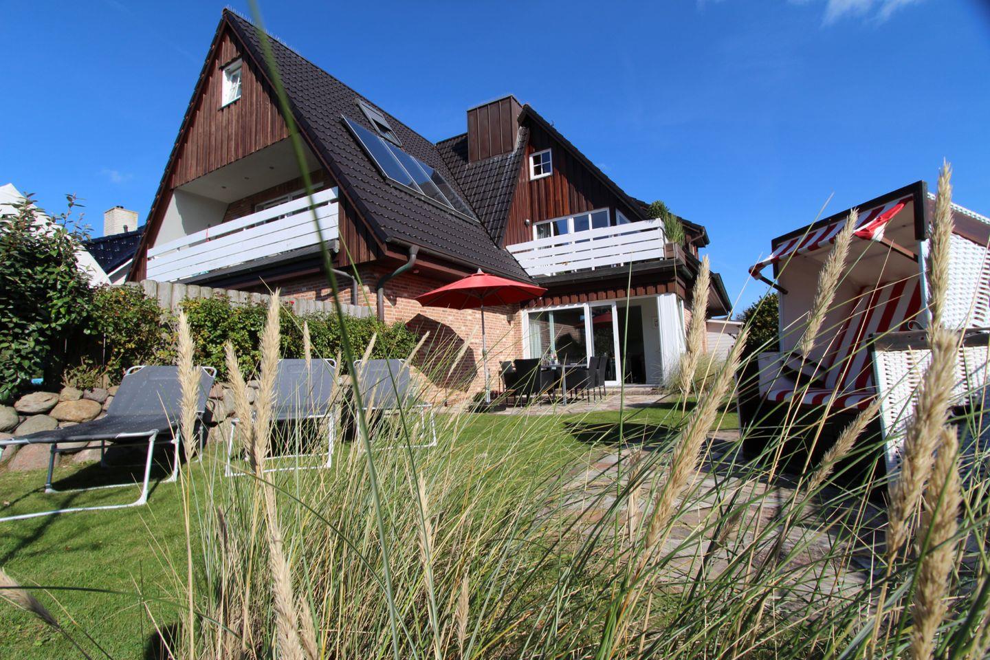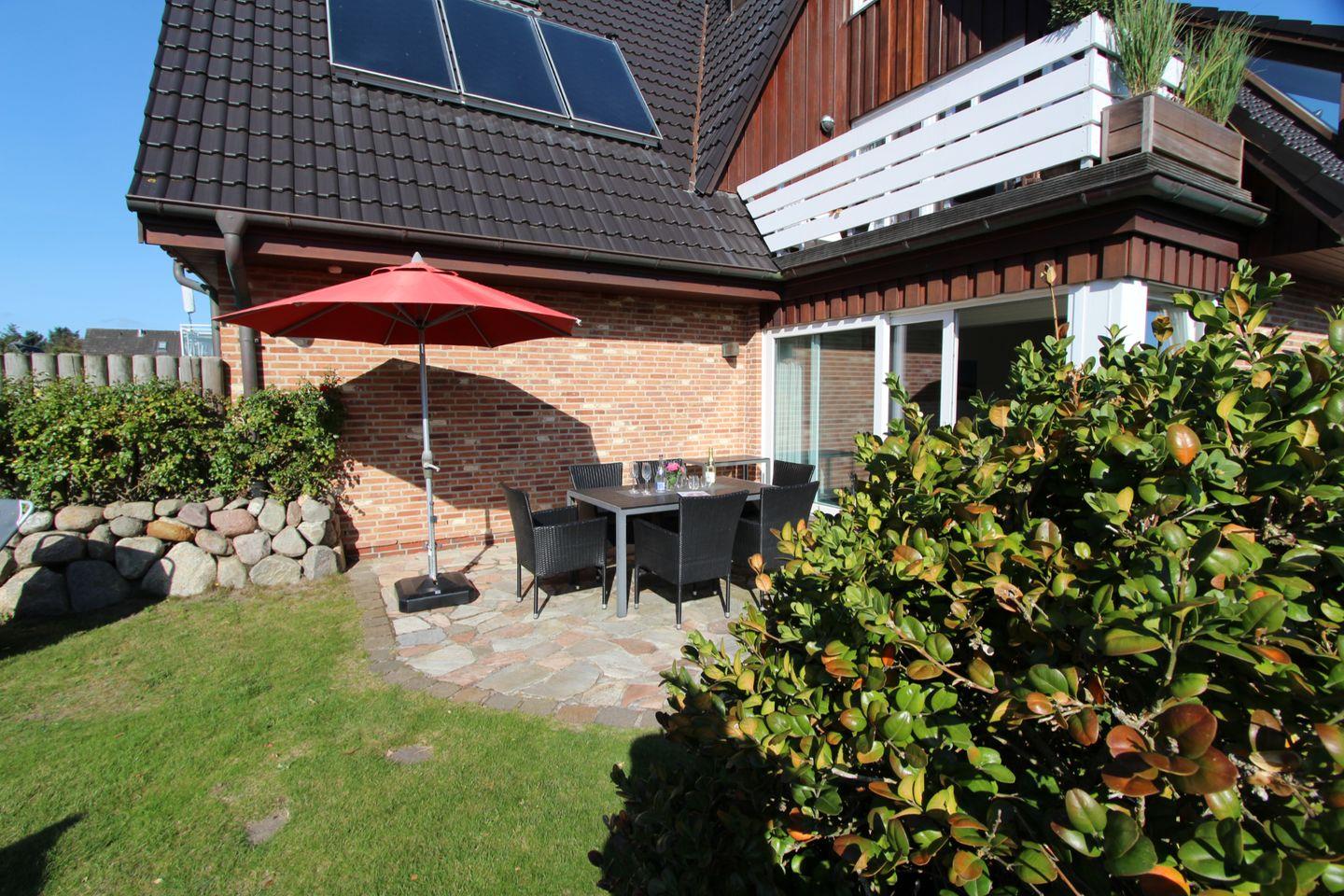 Vom Wohnbereich aus geht es in den Garten auf die Sonnenterrasse mit komfortablen Gartenmöbeln. Der Strandkorb lädt im schön angelegten Garten mit Süd-Lage zum Verweilen ein.