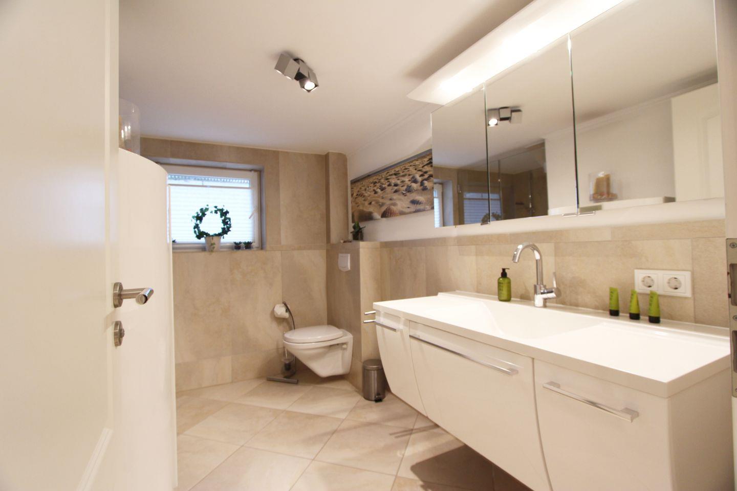 In der Wohnung befinden sich im Erdgeschoss und Untergeschoss jeweils ein Duschbad mit WC. Waschmaschine und Trockner stehen im Nebenraum im Keller für Sie bereit.