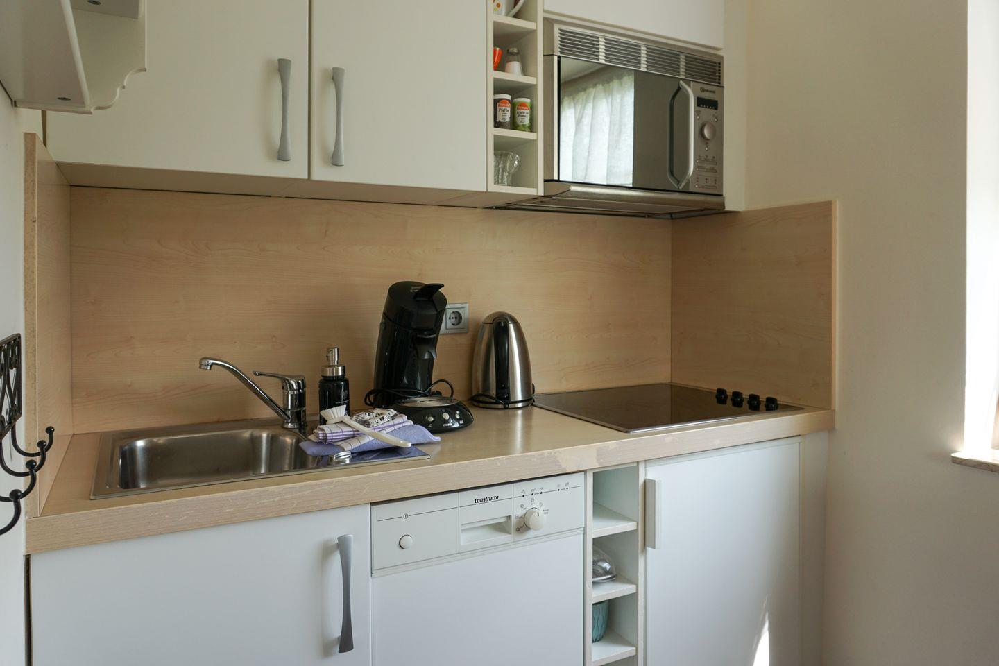 OG: heller Wohnraum mit Kabel-TV, integrierte Küche mit Backofen, Ceranfeld, Spülmaschine, Senseo Kaffeemaschine und Mikrowelle, Badezimmer mit Dusche/WC, zusätzlicher kleiner Raum, kleiner Süd-Balkon