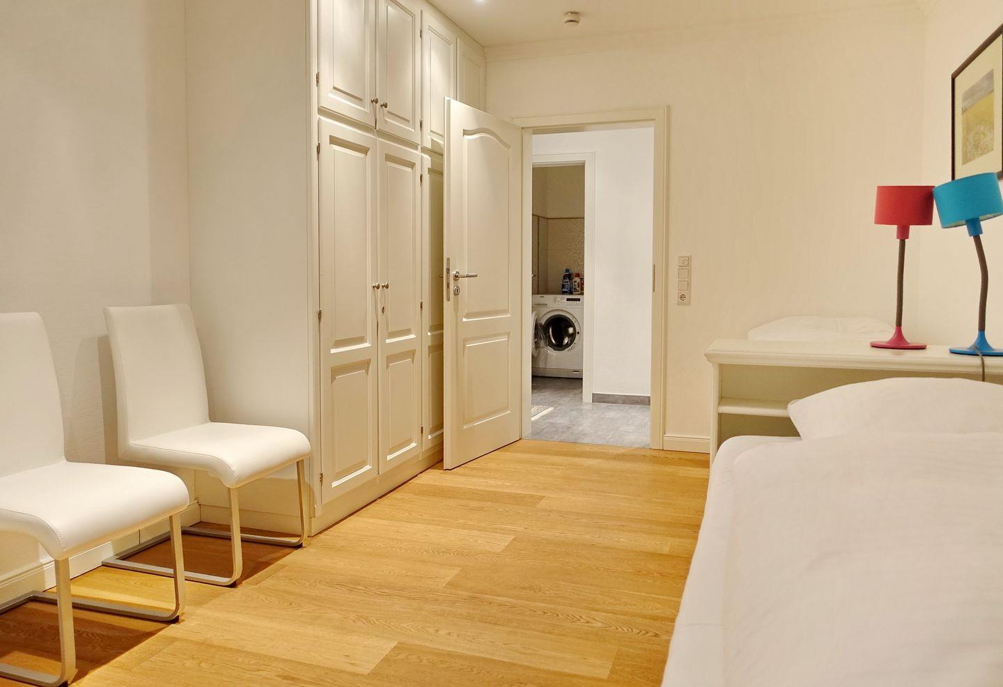 Im Untergeschoss glänzen die Räume durch hohe Decken und einem hellen, freundlichen Charme. Ein Schlafraum ist einem Doppelbett (180x200cm), sowie ein weiterer Raum mit Einzelbetten (90x200cm) ausgestattet. Mit einem Bad mit Whirlpool mit Dusche und separatem WC haben Sie viel Platz (insgesamt 170 qm). Hier findet sich für jeden die richtige Möglichkeit, sich zu erholen und zu entspannen.