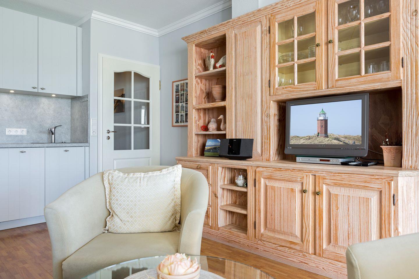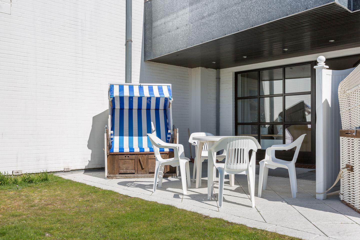 EG: schöner Wohnraum mit Kabel-TV, WLAN, CD-Player und Radio. Gemütliche Sitzecke. Integrierte Küche mit Mikrowelle und Geschirrspüler. 1 Schlafraum mit Doppelbett (180x200cm). Gäste-WC. Schöne Süd-Terrasse mit Strandkorb (ca. von April–Oktober).
