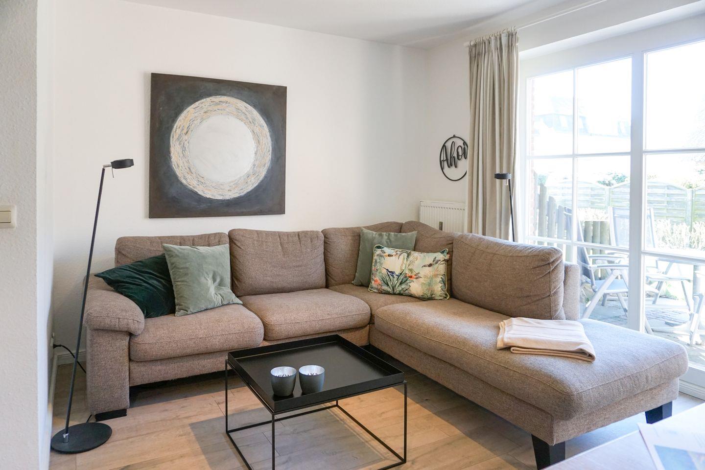 Von dort kommen Sie in die offene Küche (mit Mikrowelle-Backofen-Kombi, Weinkühlschrank, Geschirrspüler, Nespresso/Tchibo Kaffeemaschine) und das helle Wohnzimmer, wo die Sofaecke zum Entspannen einlädt. Die Westterrasse mit Strandkorb und Gartenmöbeln schließt sich direkt an (Gemeinschaftsgarten).