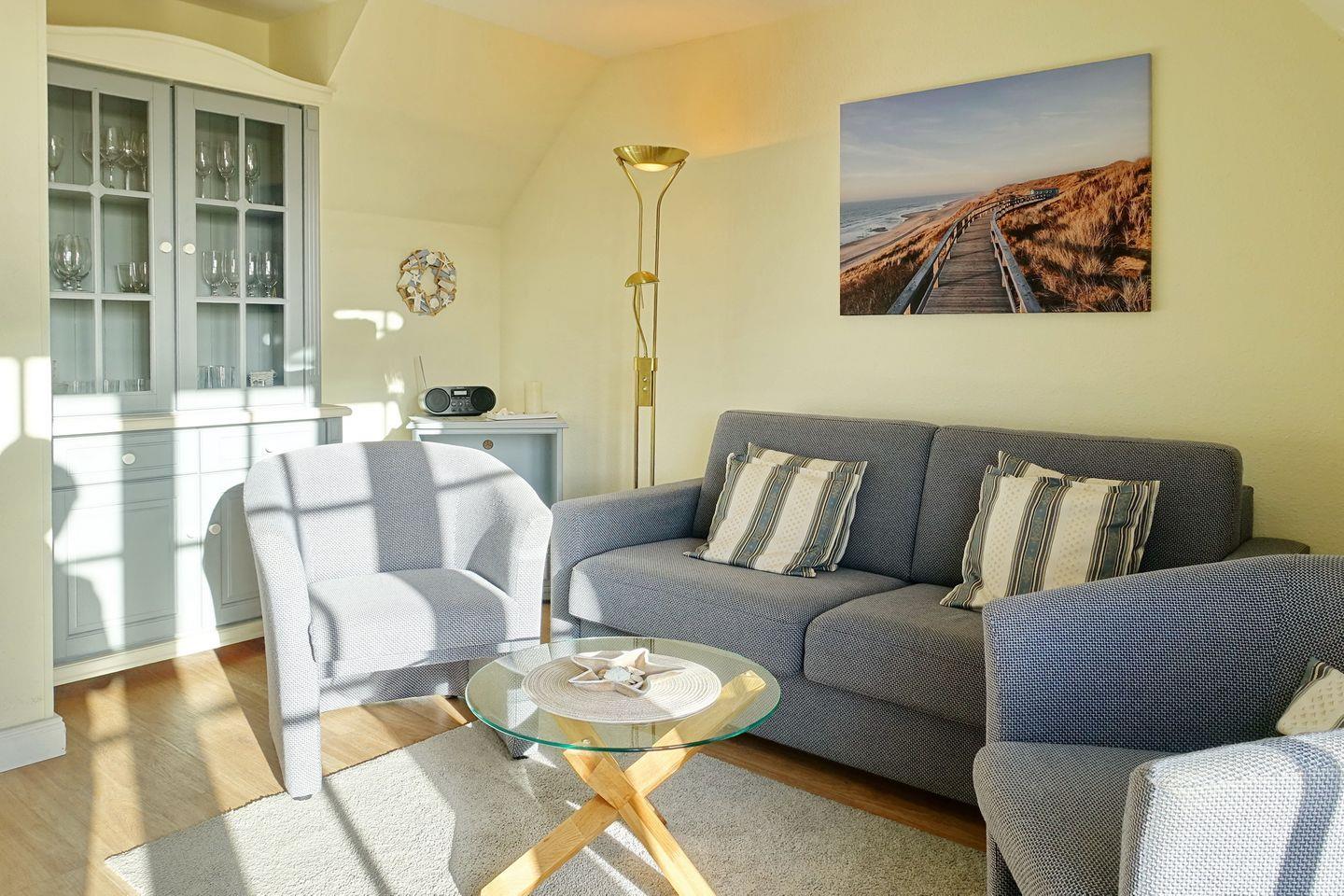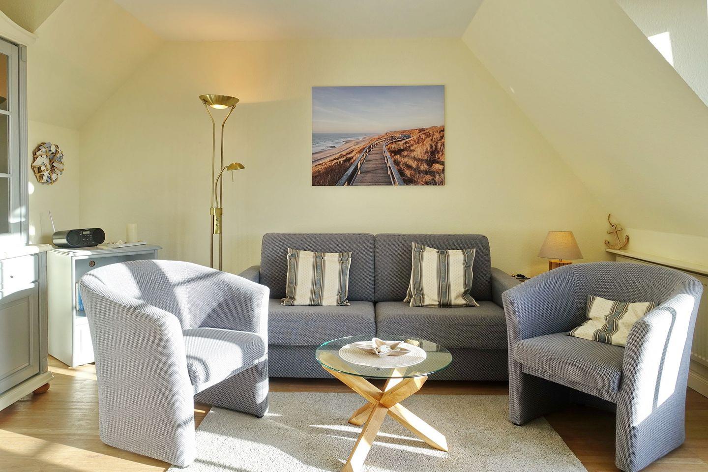 OG: Heller Wohnraum mit Schlafsofa (120 cm Liegefläche), Kabel-TV, WLAN, CD-Player und Radio. Schöne Essecke. Integrierte Küche mit Microwelle und Geschirrspüler. Modernes Bad mit Dusche/WC. Sonniger Süd-Balkon mit wunderschönem Dünenblick.