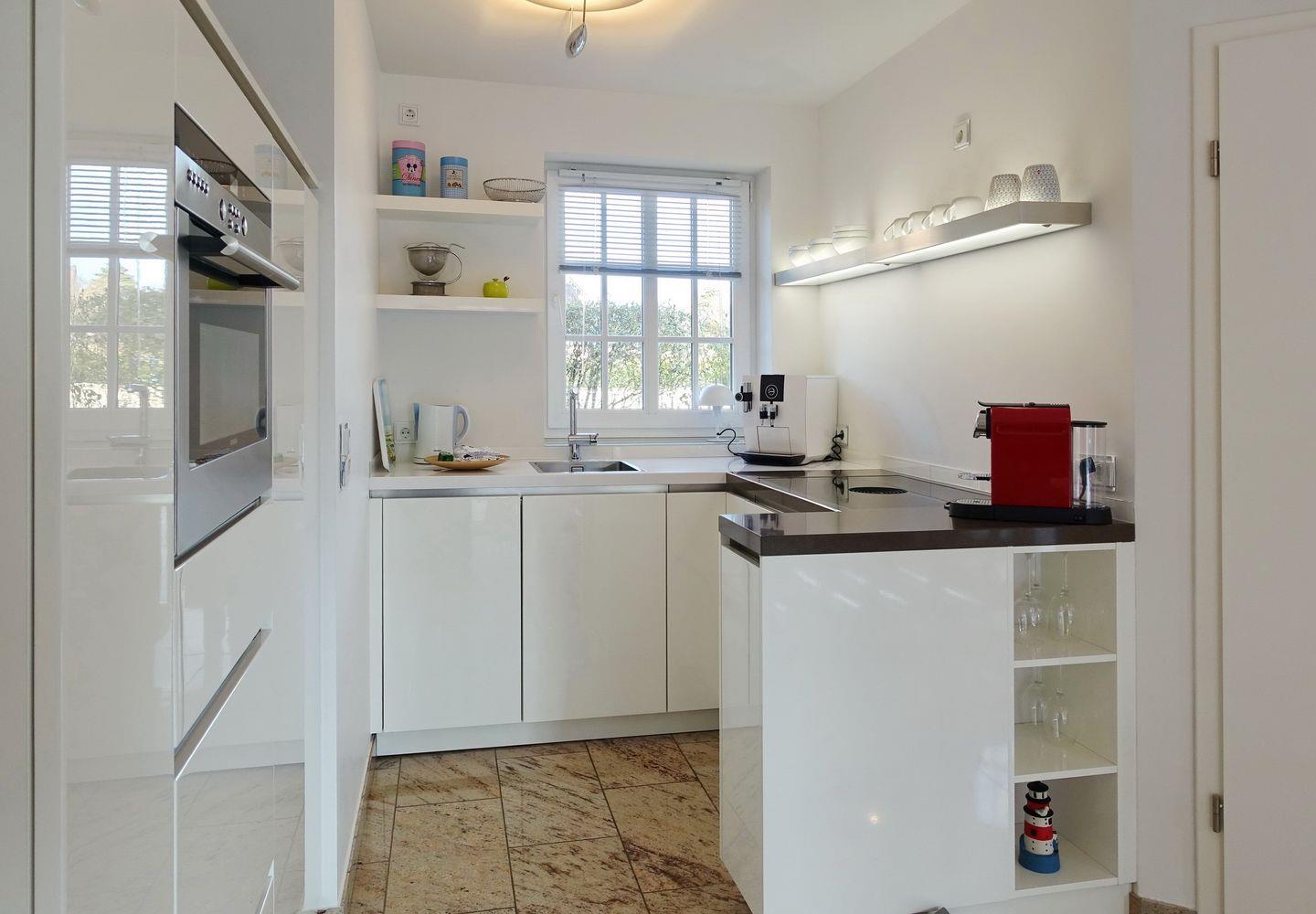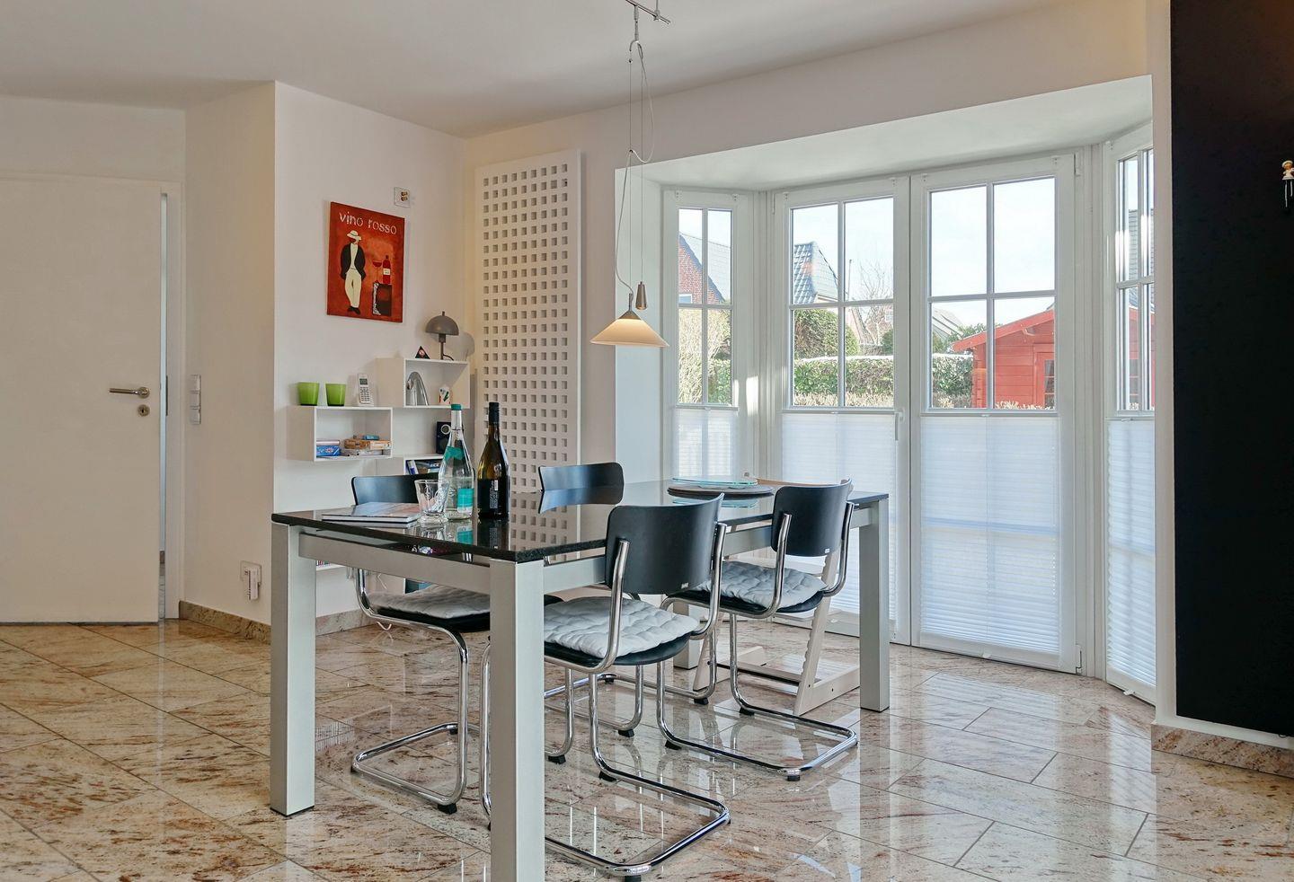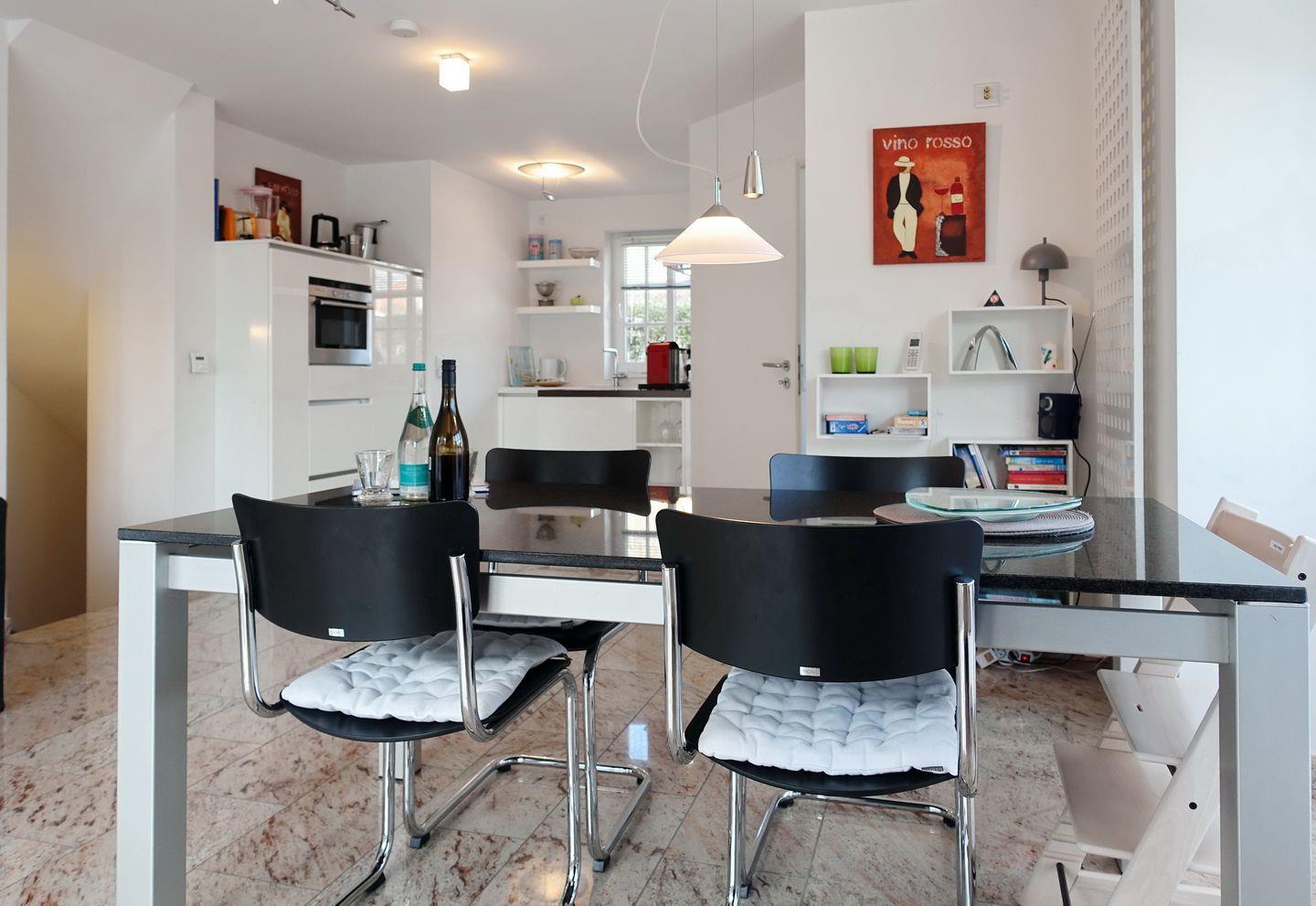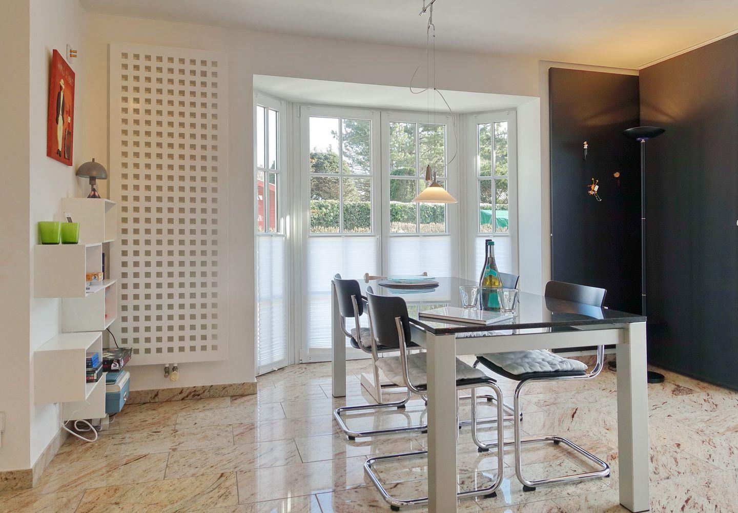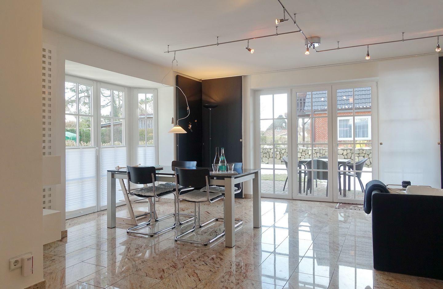 Erdgeschoss: Eleganter und sehr großzügiger Wohnraum, der durch Helligkeit, wertigen Granitboden (mit Fußbodenheizung) und geschmackvolle Möblierung besticht. Schöne Sitzecke im lichtdurchfluteten Erker. Flatscreen-TV mit Heimkinosystem, DVD-Player, Telefon, DSL-Anschluss, WLAN und Flatrate. Integrierte Küche mit Ceranherd, Backofen-Microwellenkombination, Geschirrspüler, Jura-Kaffeevollautomat und Nespresso-Maschine mit Starter-Kit an Kapseln. Gäste-WC. Sonnige Süd-Ost-Terrasse mit modernen Gartenmöbeln und Strandkorb (ca. von April - Oktober). Geschützter Parkplatz.