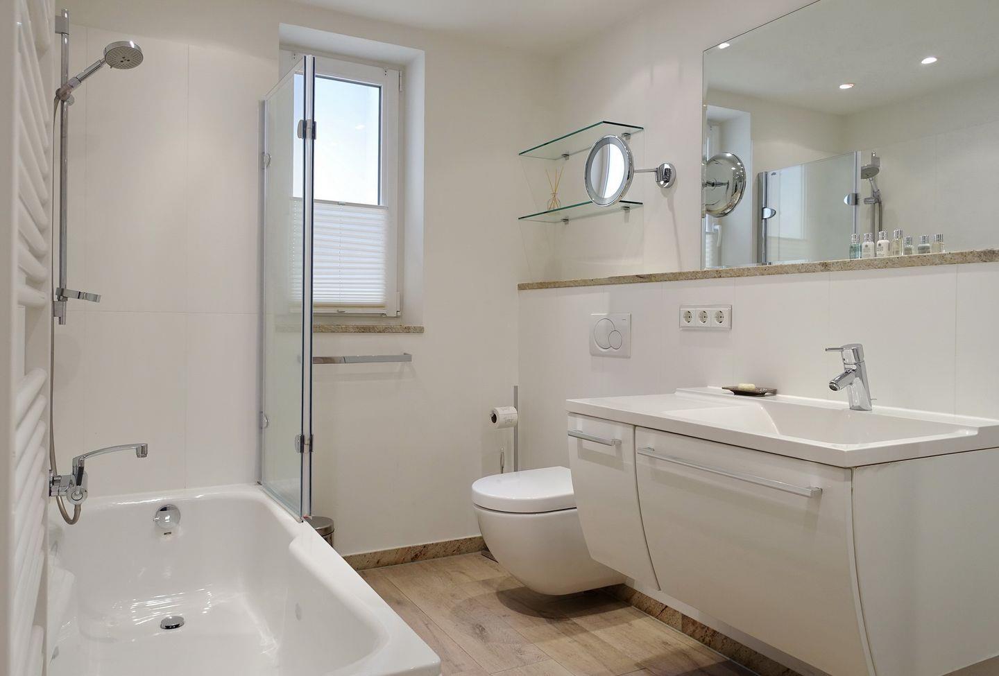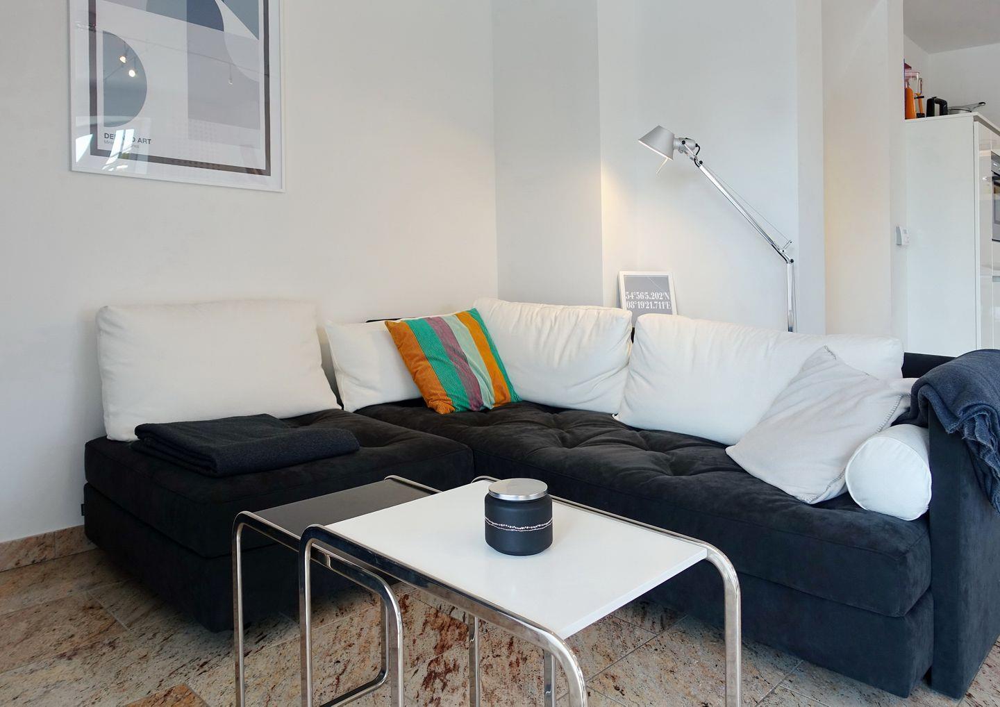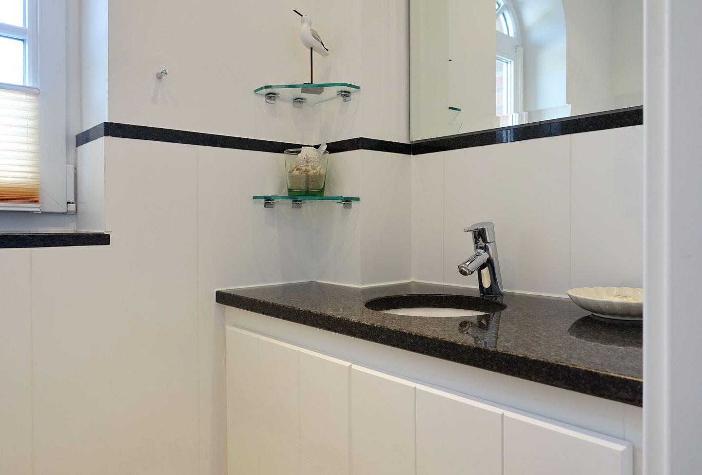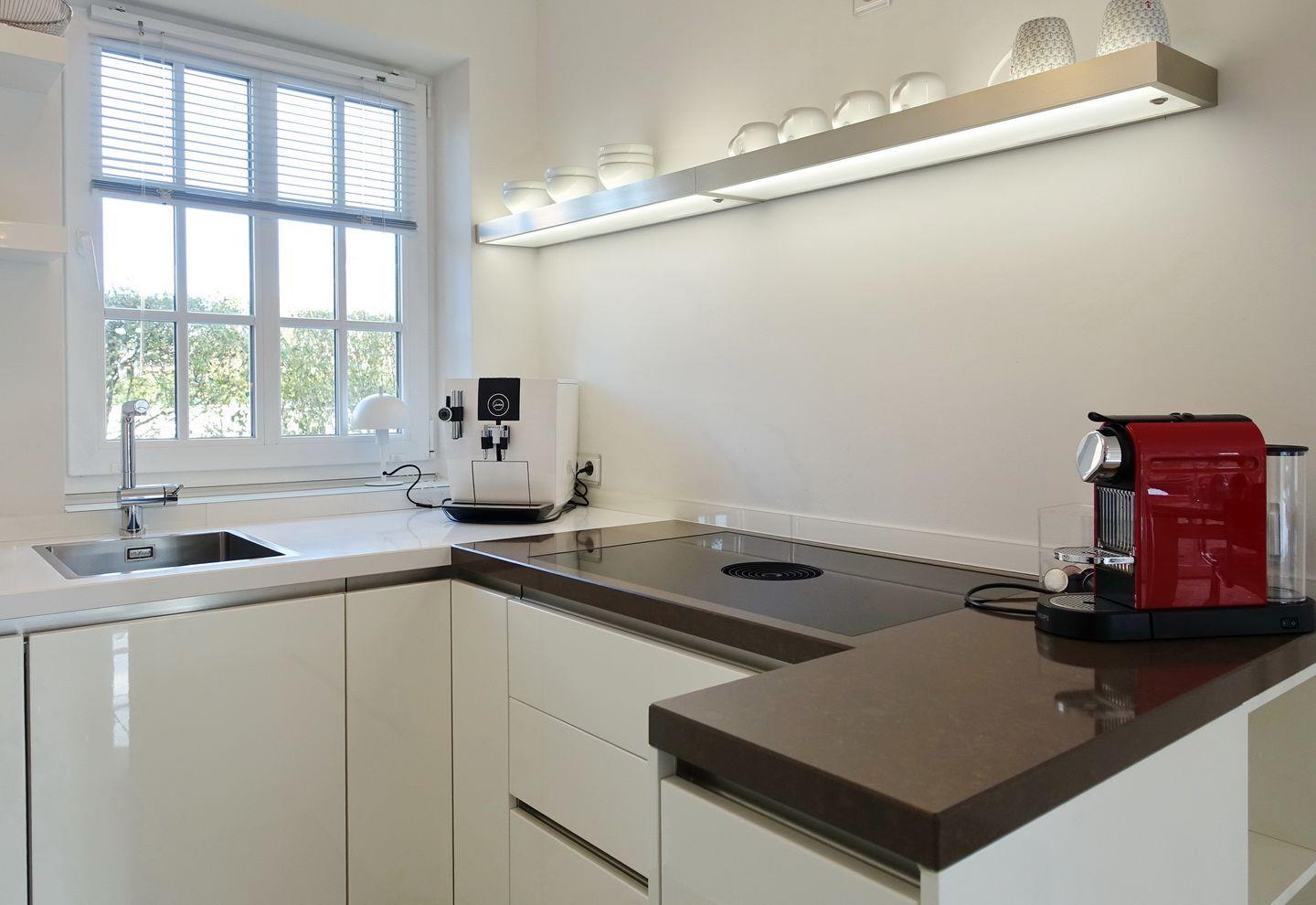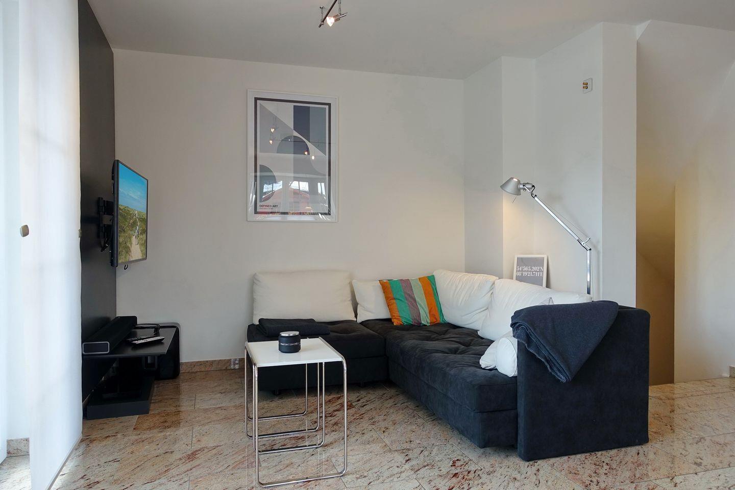 Erdgeschoss: Eleganter und sehr großzügiger Wohnraum, der durch Helligkeit, wertigen Granitboden (mit Fußbodenheizung) und geschmackvolle Möblierung besticht. Schöne Sitzecke im lichtdurchfluteten Erker. Flatscreen-TV mit Heimkinosystem, DVD-Player, Telefon, DSL-Anschluss, WLAN und Flatrate. Integrierte Küche mit Ceranherd, Backofen-Microwellenkombination, Geschirrspüler, Jura-Kaffeevollautomat und Nespresso-Maschine mit Starter-Kit an Kapseln. Gäste-WC. Sonnige Süd-Ost-Terrasse mit modernen Gartenmöbeln und Strandkorb (ca. von April - Oktober). Geschützter Parkplatz.