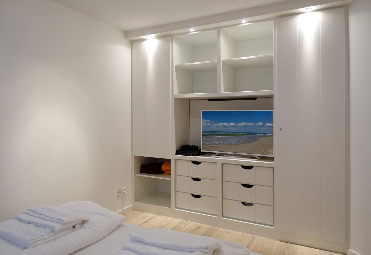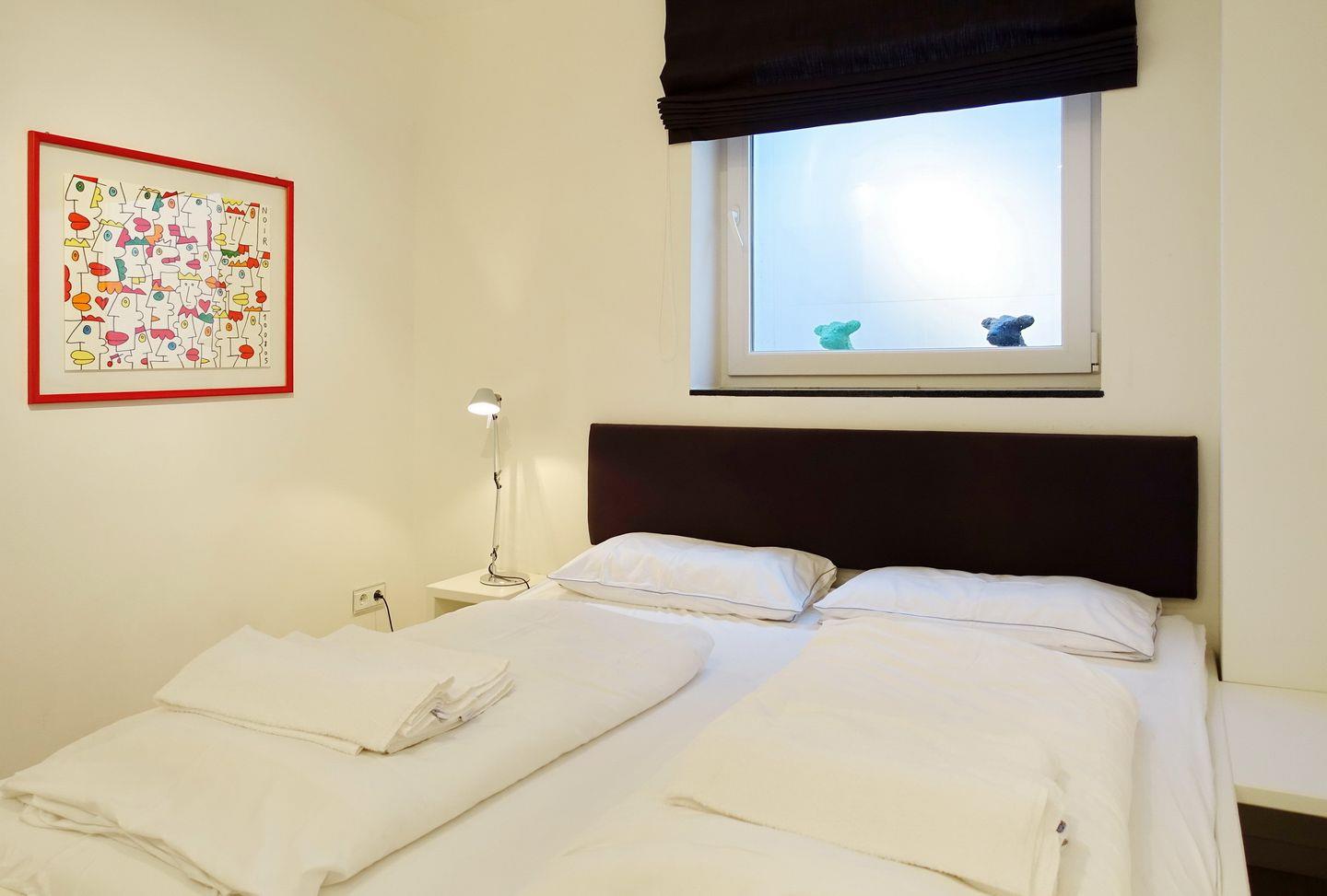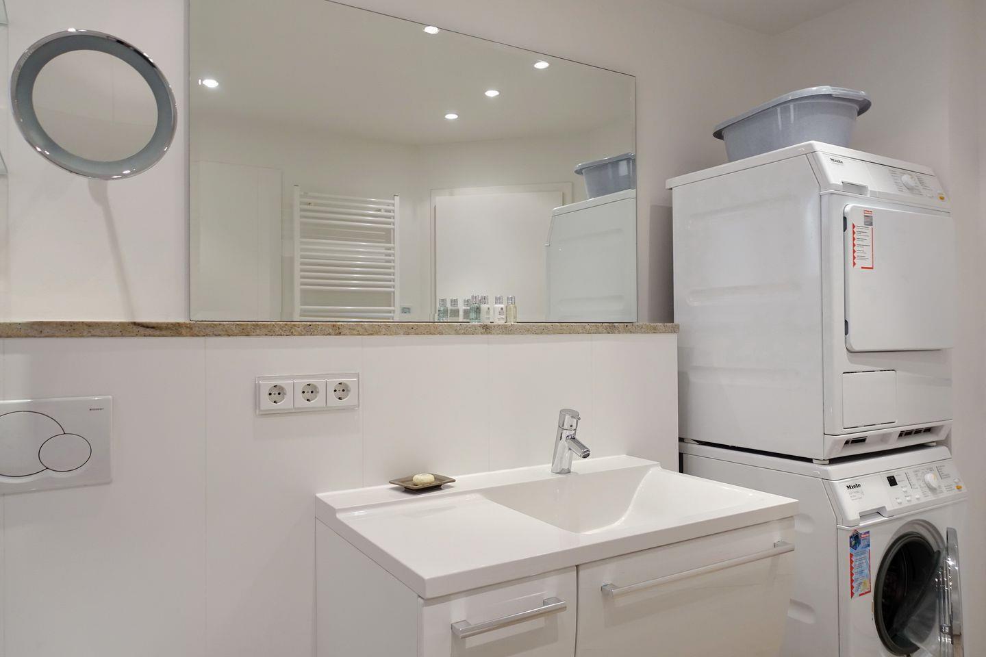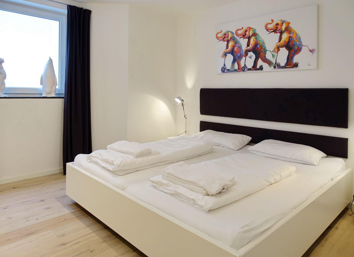 Souterrain: 1 großzügiger Raum mit Doppelbett (2x100x200cm) mit viel Schrankplatz und Flatscreen-TV. 1 weiterer Raum mit Doppelbett (2x90x200cm)), TV, Playstation 4. 1 großes und helles Wohlfühlbad mit Doppelwaschtisch, Wanne/Dusche/WC, Gira Unterputzradio und Waschmaschine/ Trockner. Zweites Bad mit Dusche, WC und Gira Unterputzradio. Im gesamten Souterrain hochwertiger Parkett mit Fußbodenheizung.