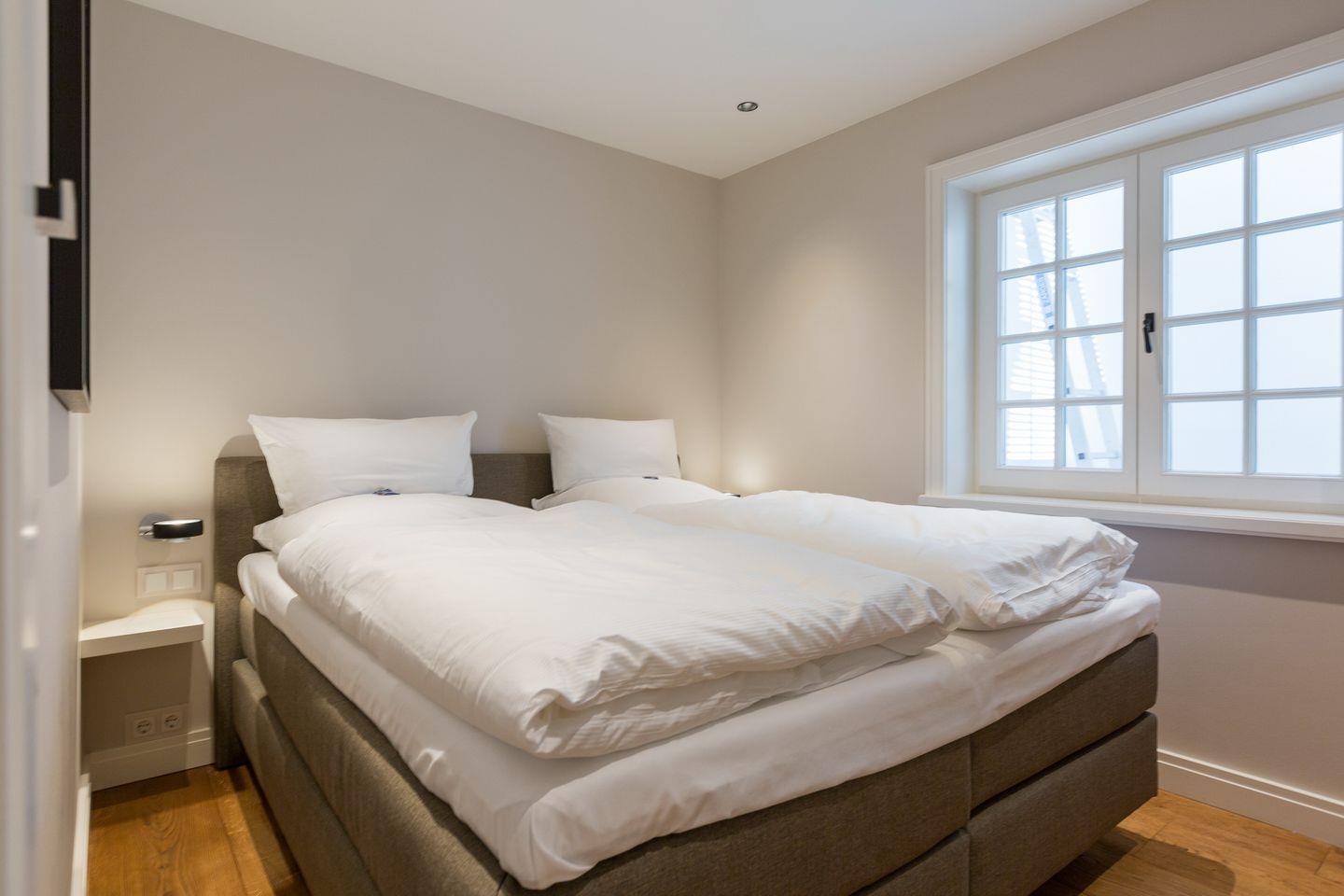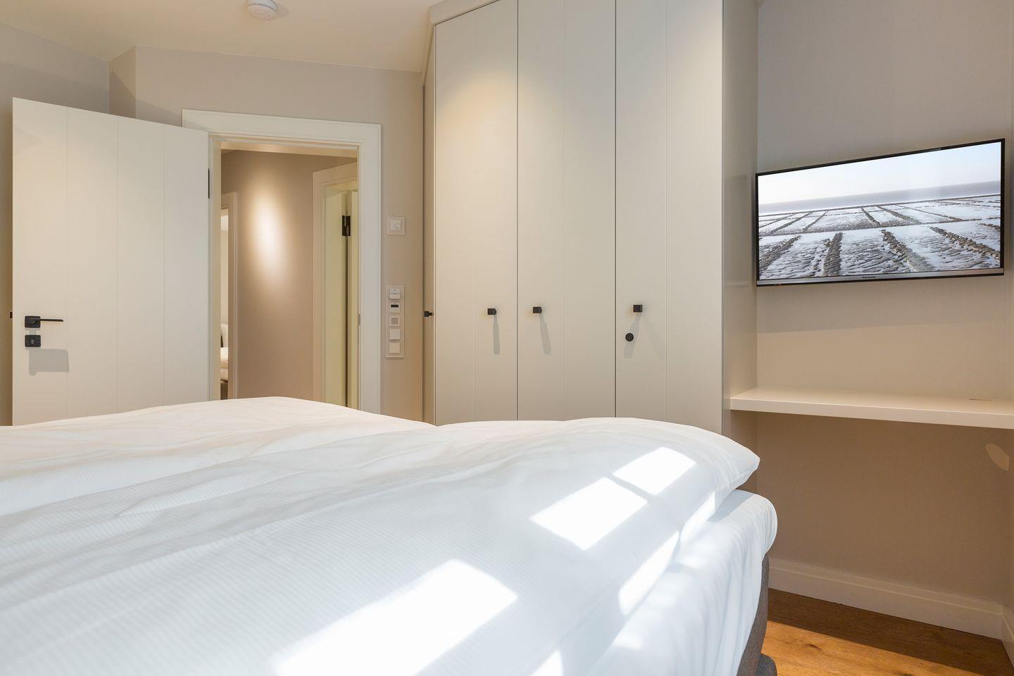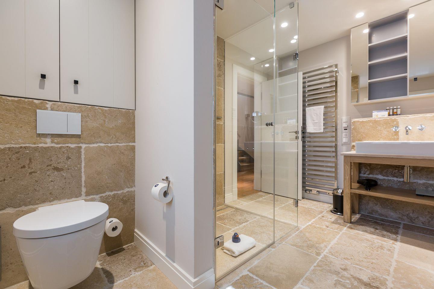 Toller Masterbedroom mit viel Einbauschrankplatz, Boxspringdoppelbett (2x2m) sowie Flat-TV. Benachbart finden Sie ein in edlem Naturstein ausgestattetes Bad mit großer Dusche, Doppelwaschtisch und WC.