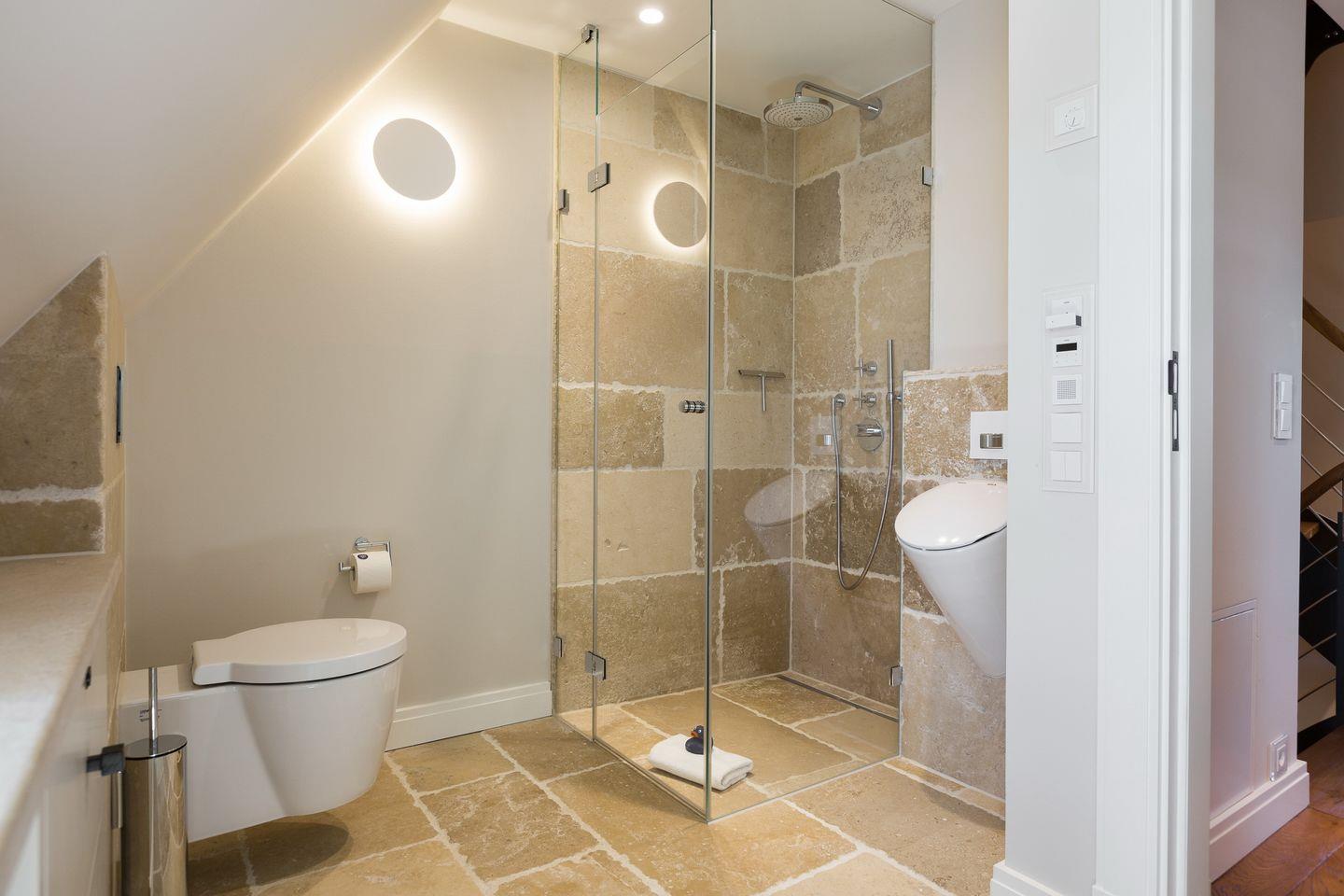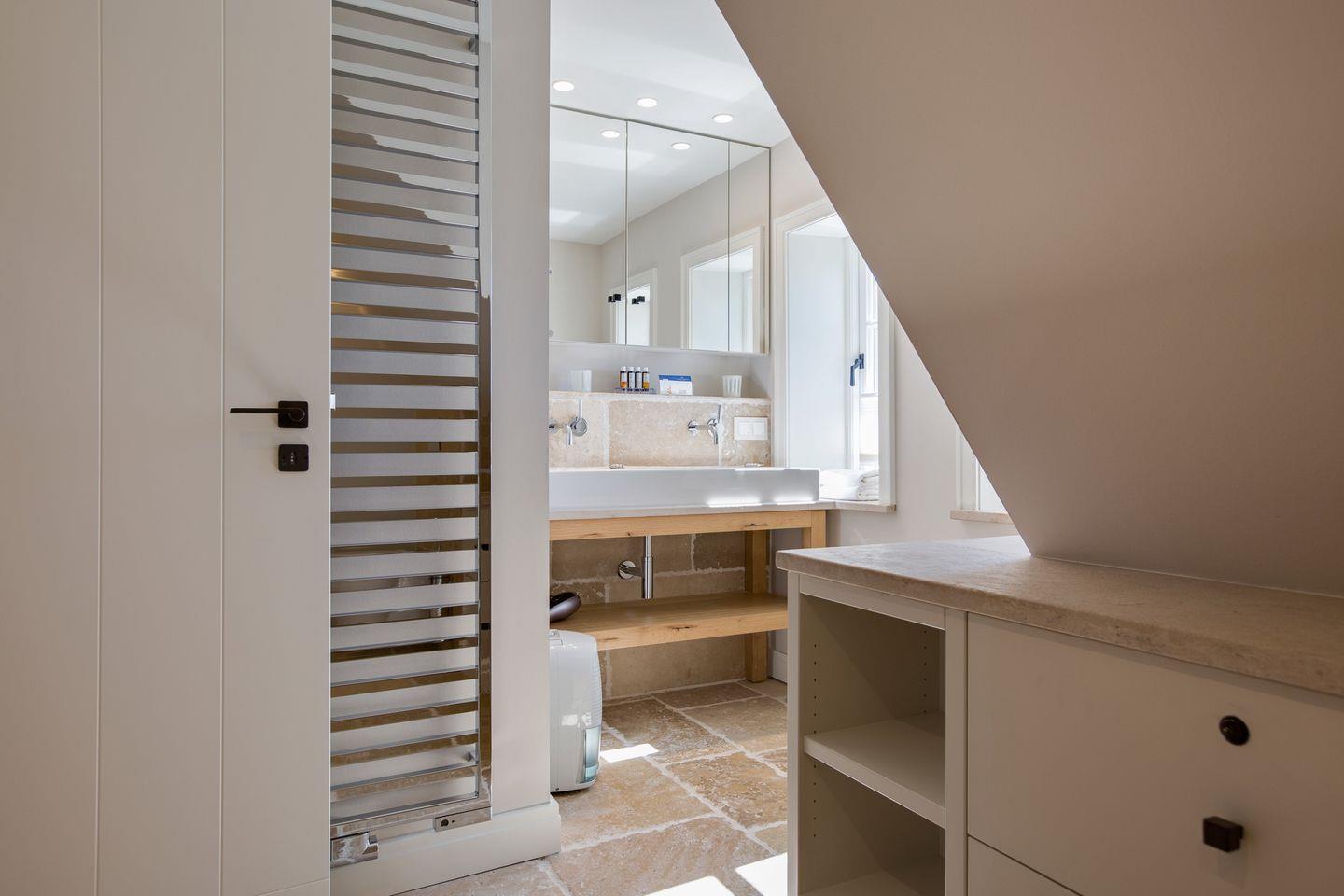 Einmalige Wellnessbäder mit einer traumhaften Sauna werden Sie verzaubern. Feinster Naturstein, wertige Armaturen, klare Linien, große Wohlfühlduschen - alleine um in den Genuss der feinen Bäder zu kommen, wäre Ihr Hausteil unter Reet eine Reise für sich wert :-).
