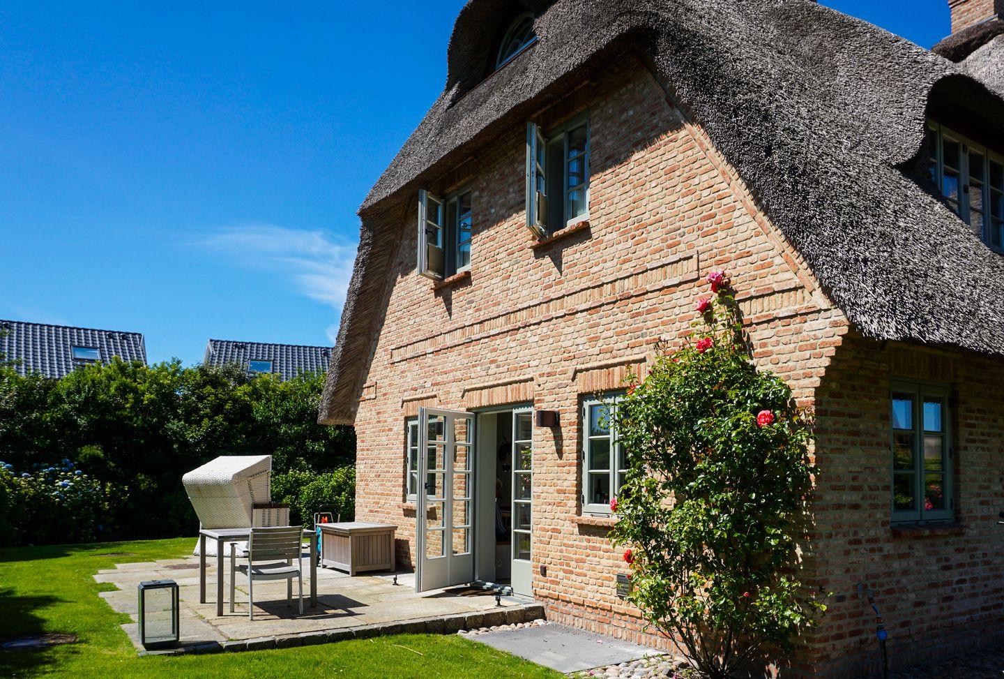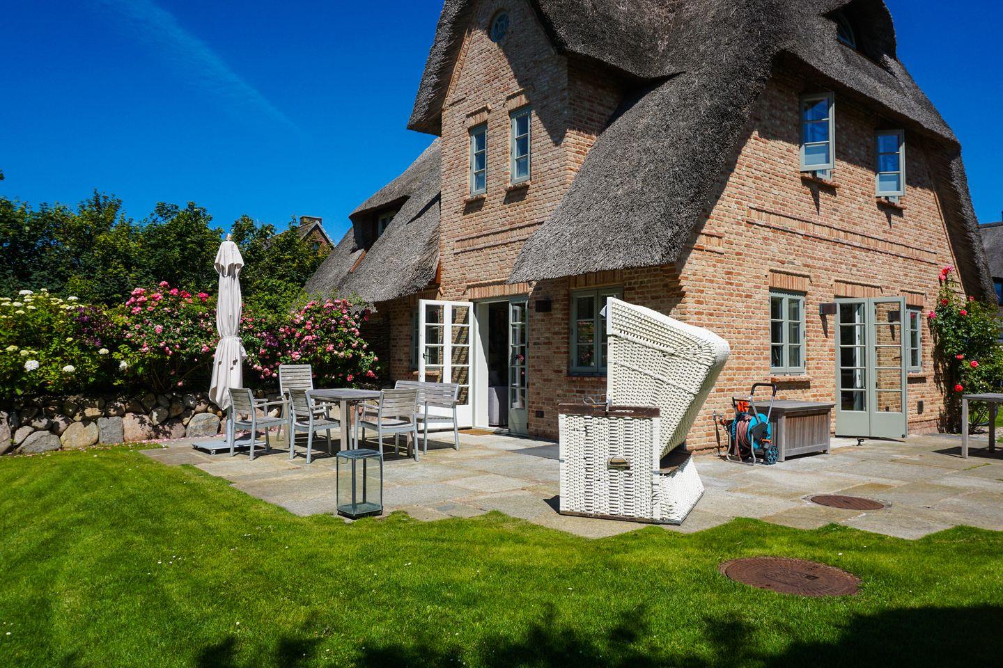In ruhiger Lage Wenningstedts gelegenes Luxushausteil unter Reet. Ca. 126 qm Nutzfläche empfangen bis zu 6 Gäste im Erd-, Unter- sowie Obergeschoss.