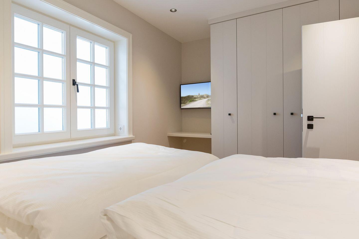 Sehr schöner Wellnessbereich mit großer, frontverglaster Sauna, XXL-Dusche und WC. Zwei wertig dekorierte Räume mit je einem Boxspring-Doppelbett (ca. 1,8x2m) sowie je Flat-TV. Kleine Waschküche mit Waschmaschine und Trockner.