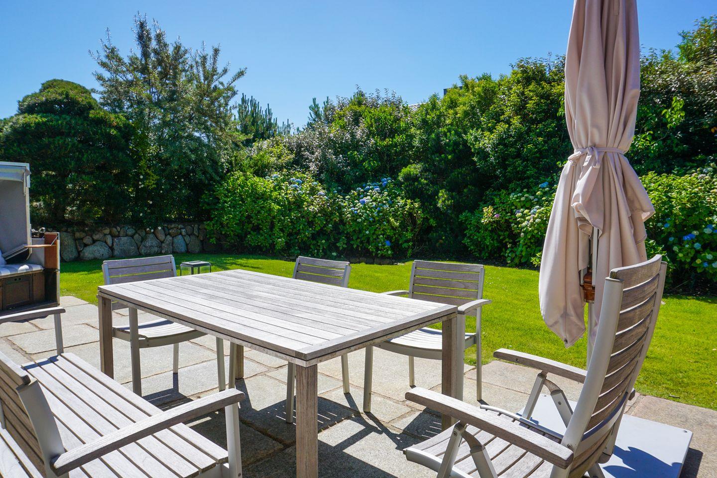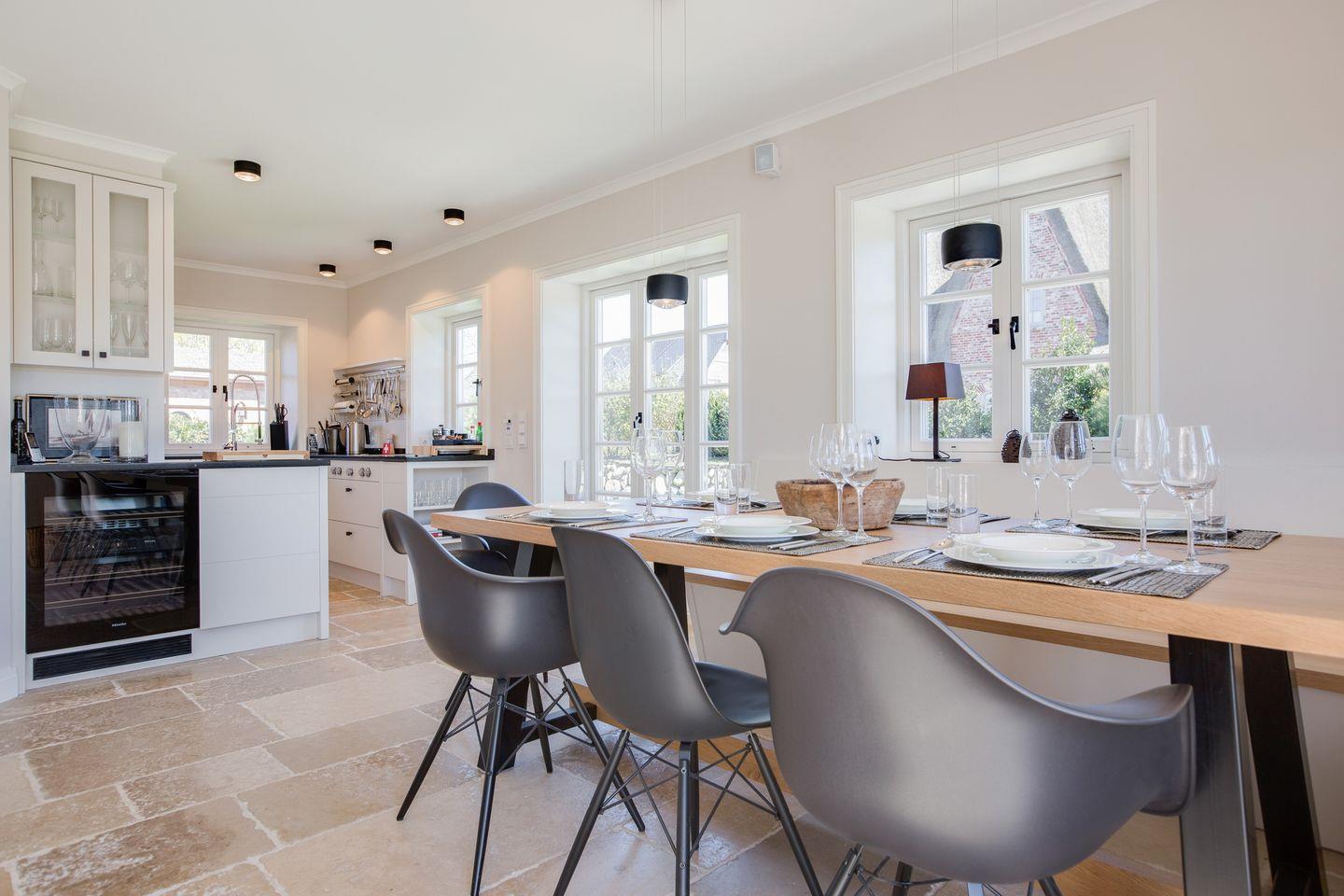 Lichtdurchfluteter, luxuriöser Wohnraum mit Gaskamin, Sitzecke, schöner Esstafel mit Eames-Plastic Chairs sowie Sitzbank. Integrierte Luxusküche mit BORA Induktionsherd, großer Kühlschrank mit Ice-Maker, kleine Vinothek, Nespresso. Kombinierte Mikrowelle mit Backofen und Dampfgarer. Sehr komplette Küchenausstattung. Kleine Diele mit Gäste-WC. Sehr schöner Terrassenbereich mit hochwertigem Gartenmobiliar und Strandkorb (ca. von April-Oktober). Sonnenkuhle sowie mit viel Liebe zum Detail angelegter Garten in Südausrichtung.
