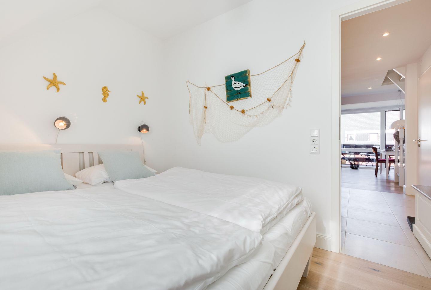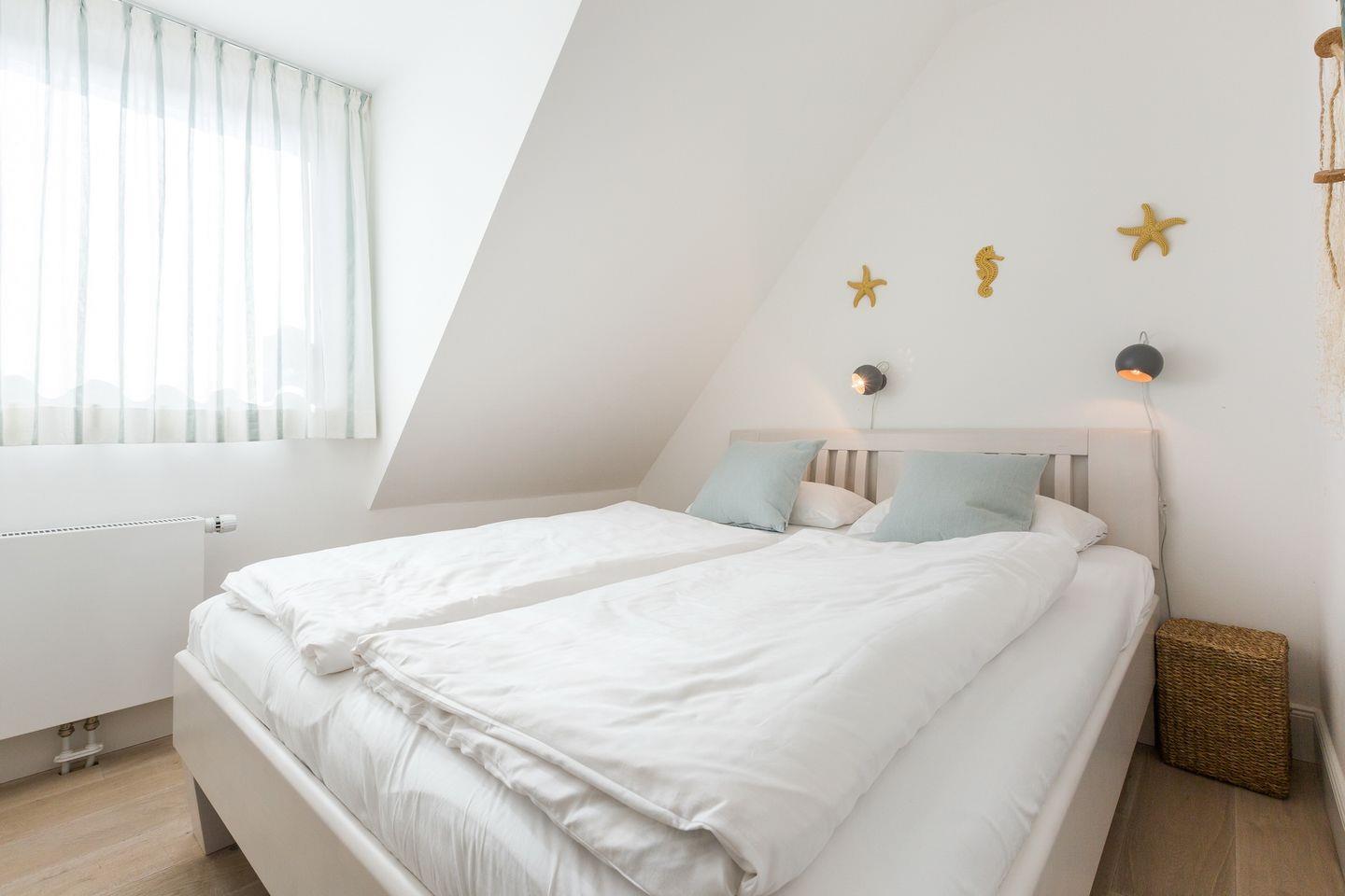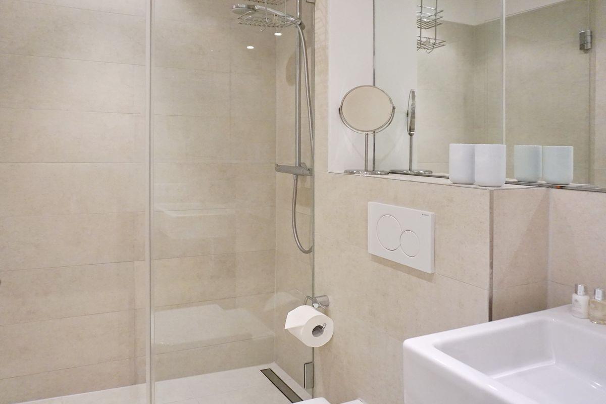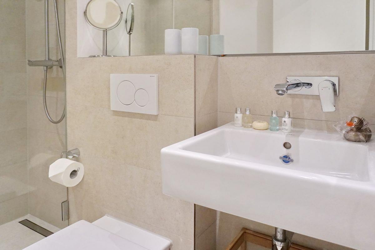 Auf gleicher Ebene des Appartements finden Sie Ihr Schlafzimmer mit Doppelbett (160x200cm) und viel Schrankplatz. Das moderne Badezimmer wurde frisch renoviert. Genießen Sie die große Regendusche und starten Sie entspannt in den Tag.