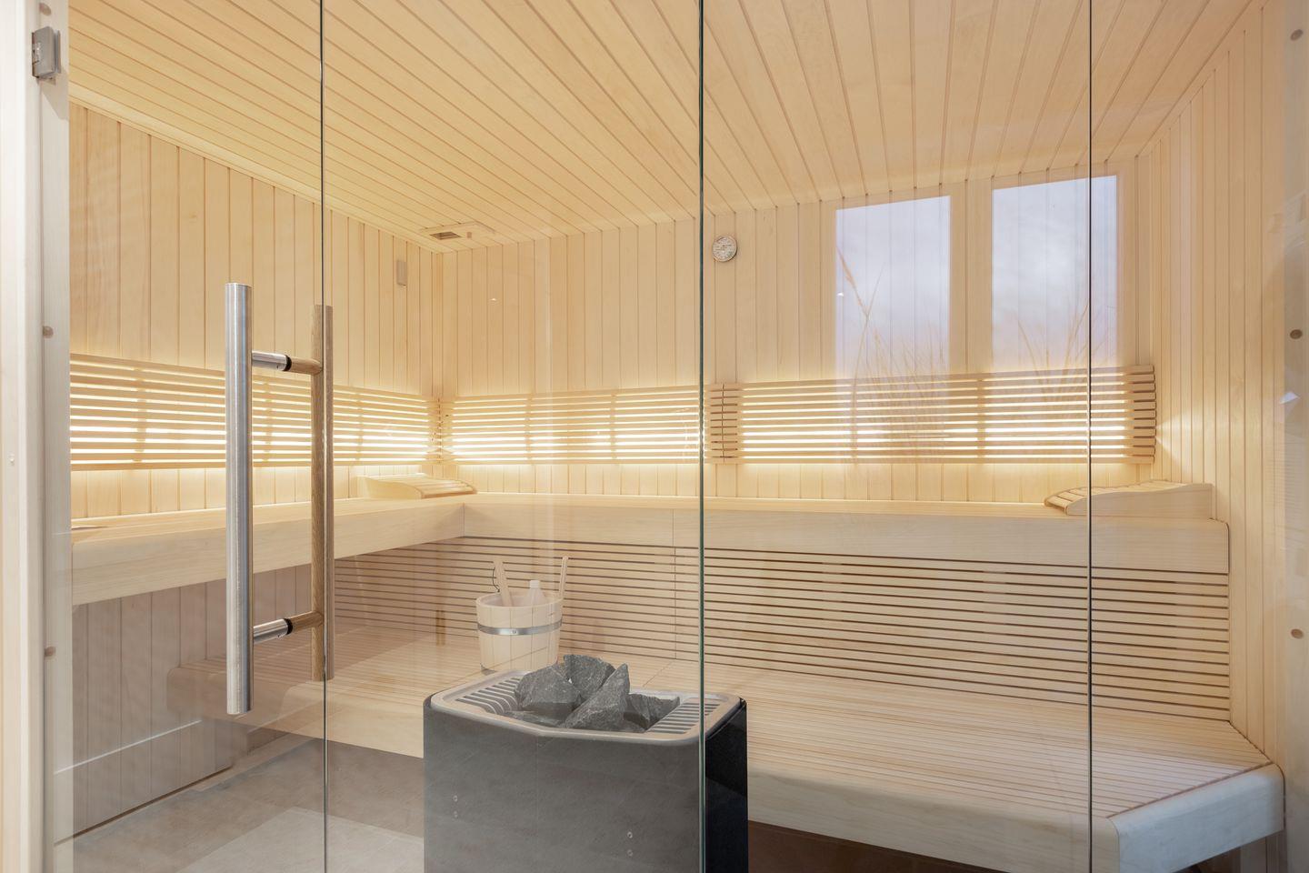 Das Untergeschoß bietet einen Raum mit einem Doppelbett (180x200cm) und TV. Hier erstreckt sich auch ein Wellnessbad mit großer Dusche und WC und der Saunabereich mit einem Fernseher.