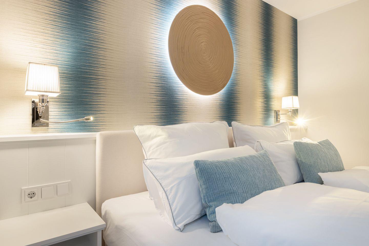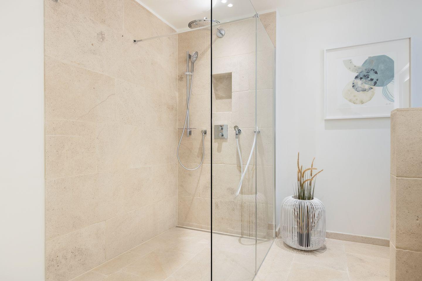 Im Obergeschoss befinden sich 2 Schlafzimmer mit eingebauten Kleiderschränken (integriertes Licht) und jeweils einem Bett (180x200cm) und TV. Auch sind 2 geräumige Duschbäder mit WC vorhanden, davon ist ein Duschbad en Suite.