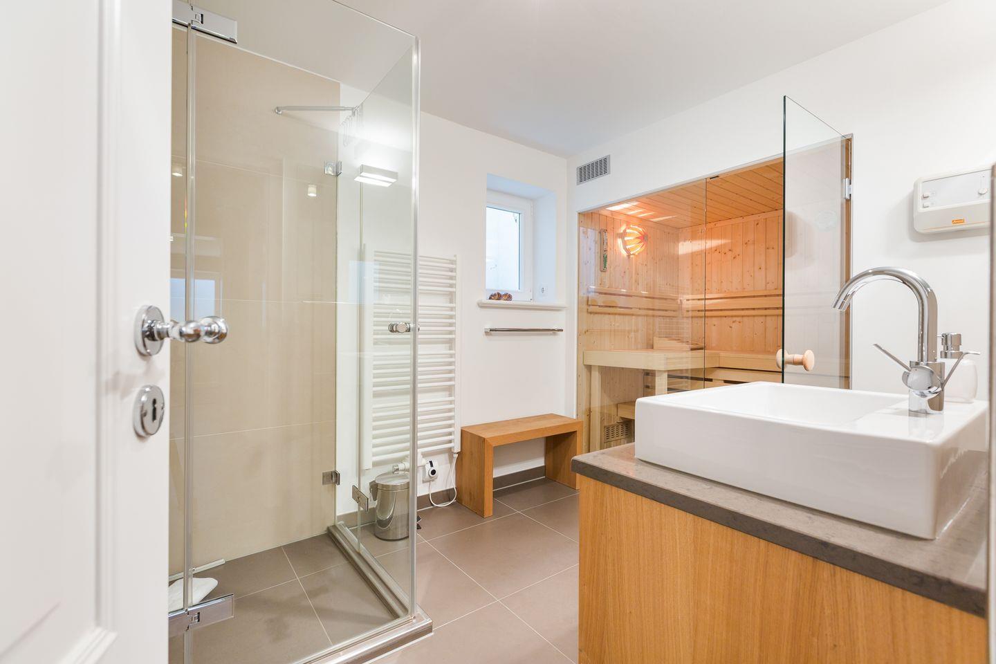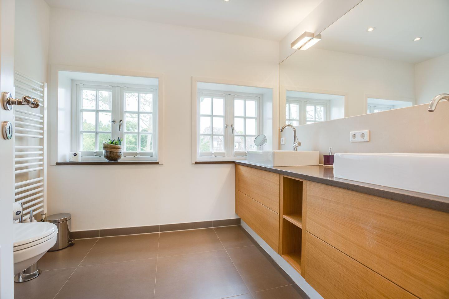 Beschwingt in den Tag, oder luxuriös in aller Ruhe den Tag beschließen, beides geht in Ihrem luxuriösen Bad mit schöner Dusche, Doppelwaschtisch und WC.