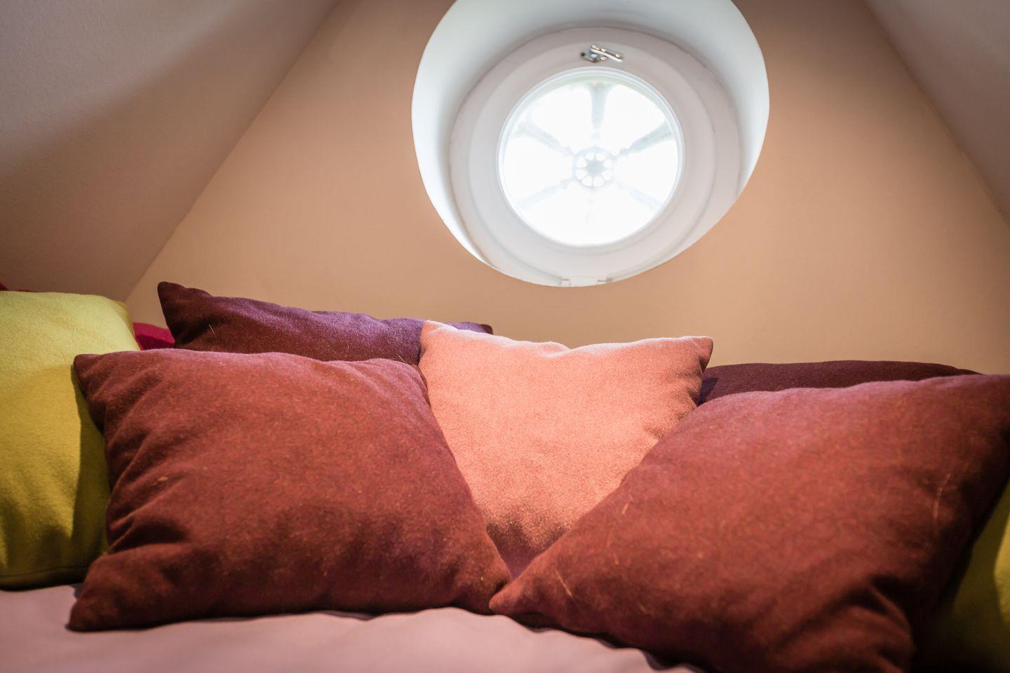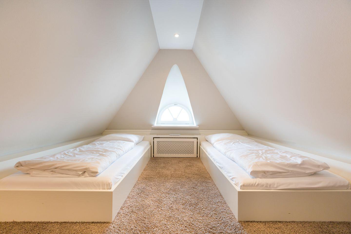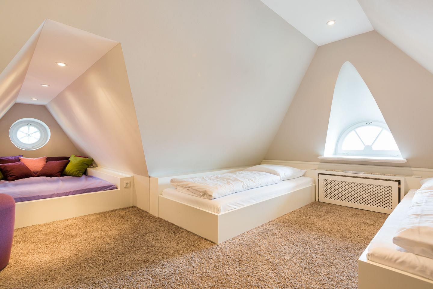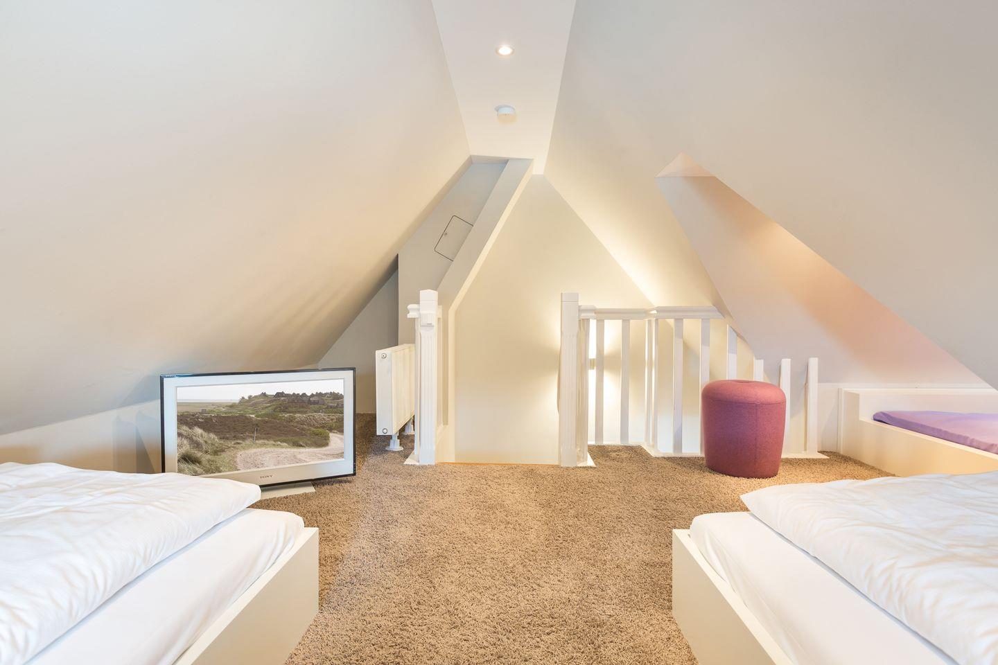 DG: Im Dachgeschoss finden Sie einen offenen Bereich mit zwei Einzelbetten (90x200cm), Flat-TV und einer kuscheligen Koje vor.