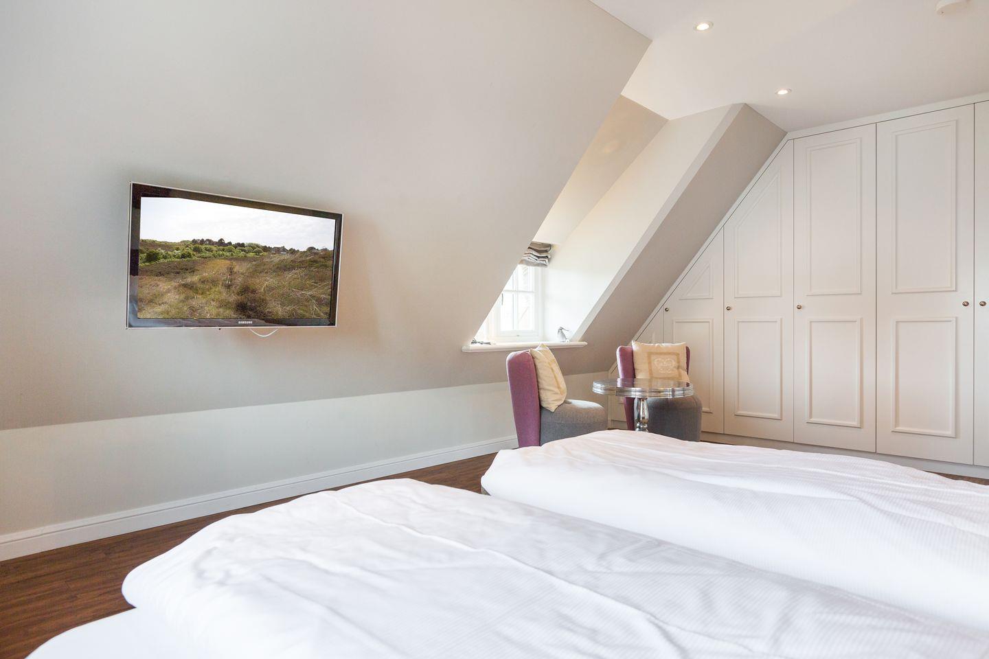 OG: Ihr Masterbedroom ist kuschelig und stylish zugleich. Ein Doppelbett (180x200cm-Matratze getrennt) sorgt für traumhaften Schlaf. Viel Schrankplatz und ein Flat-TV dürfen natürlich auch nicht fehlen. Benachbart findet sich ein weiterer Schlafraum mit Einzelbett (100x200cm) und Flat-TV - ideal als Kinderzimmer nutzbar. Denkbar wäre ebenfalls, dass sich in dieser Räumlichkeit temporär der schnarchende Masterbedroomschläfer einquartiert, sofern der Bordeaux am Abend etwas zu üppig ausfiel ;-).