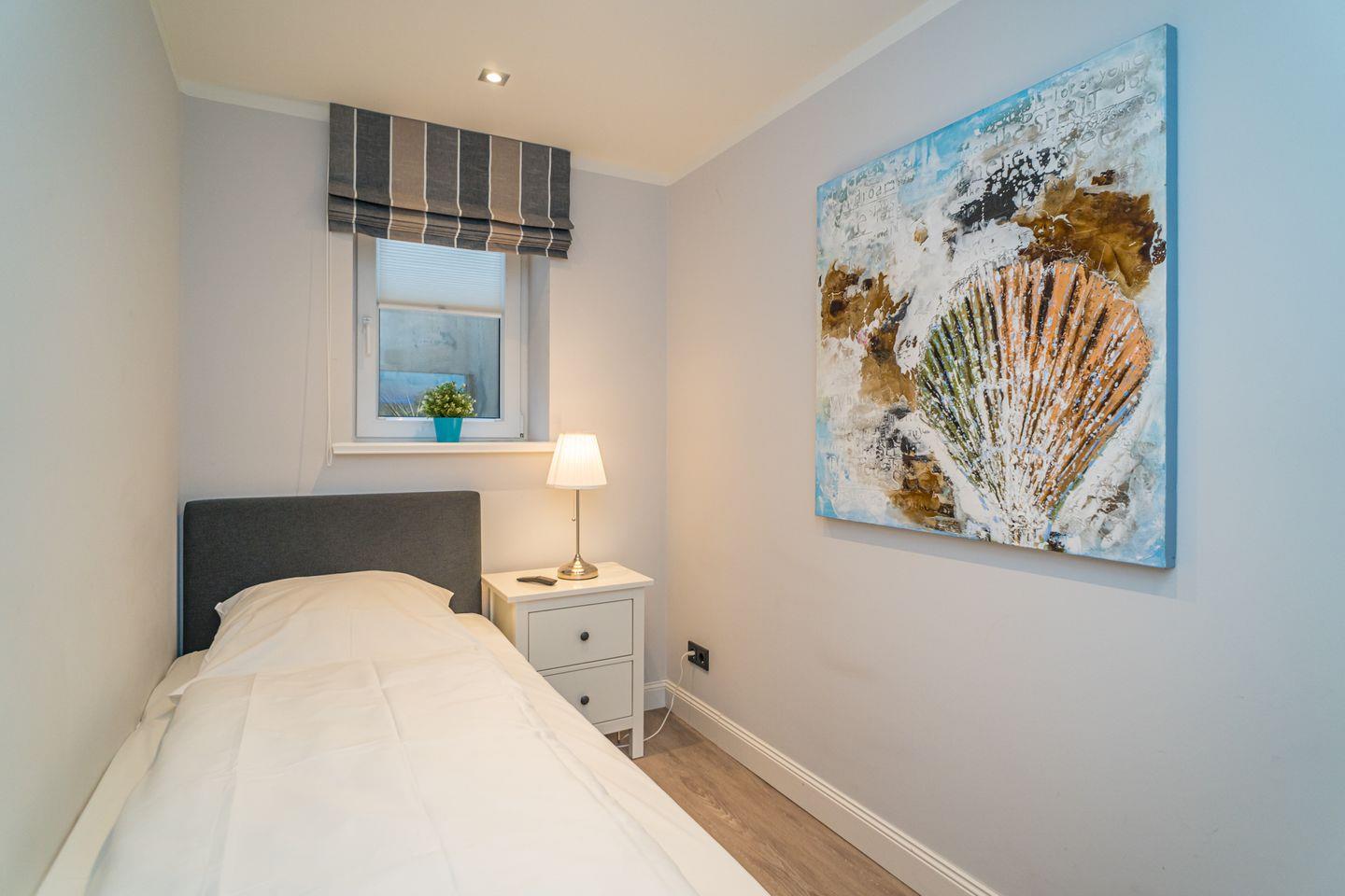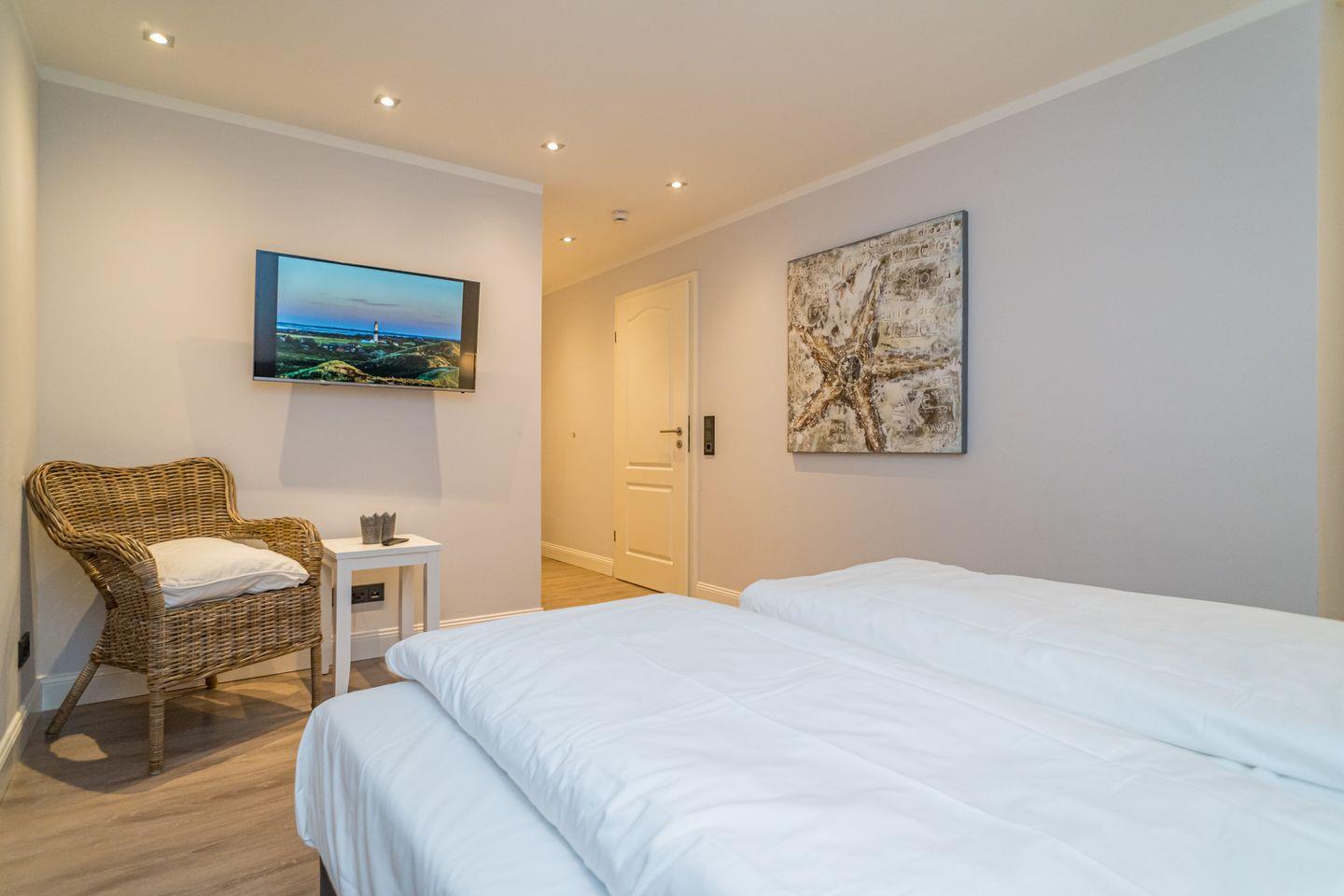 Insgesamt drei Schlafzimmer laden mit komfortablen Boxspringbetten zum wohligen Schlummern ein: eins im Erdgeschoss (Doppelbett) und zwei im Souterrain (begehbarer Kleiderschrank, Doppel- und Einzelbett). Zwei moderne Bäder mit bodengleicher Dusche und on-top noch einer Sauna runden das Appartement Lachmöwe ab.
