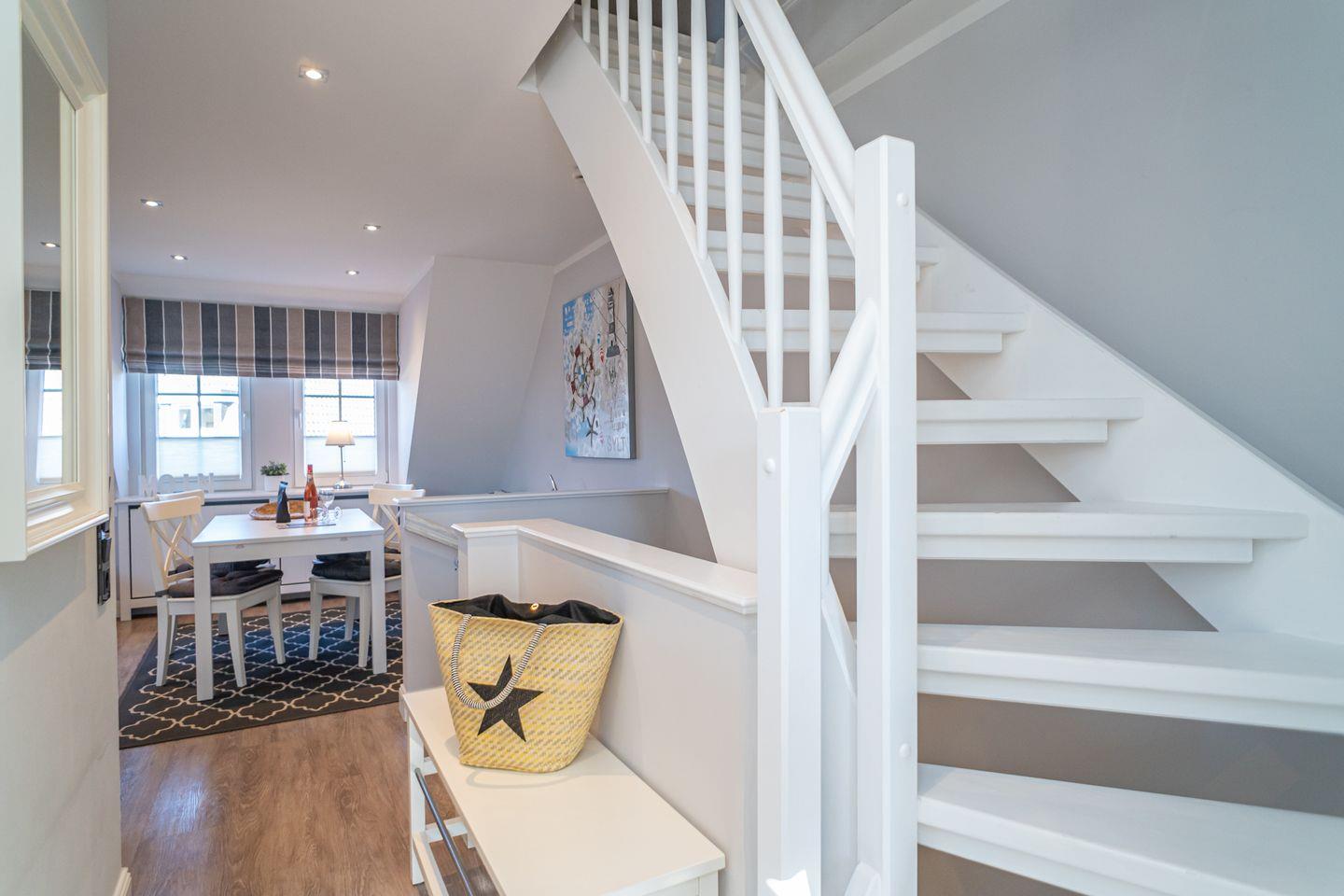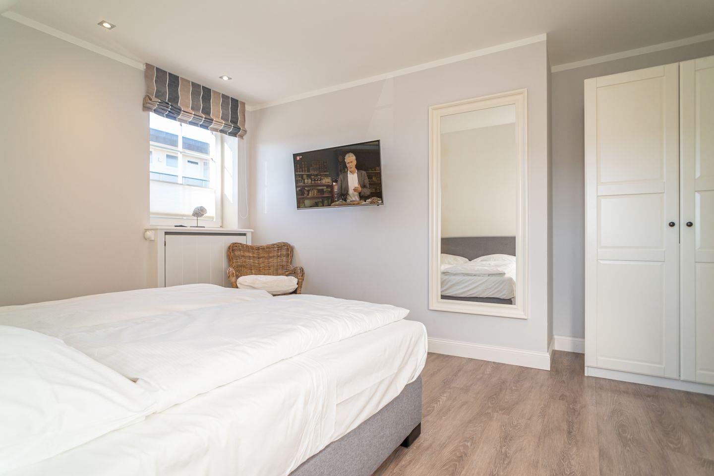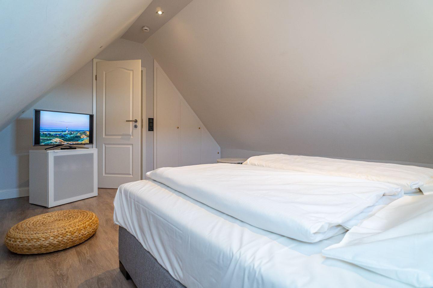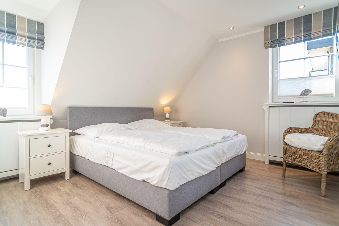 Die beiden Schlafzimmer befinden sich im Ober- bzw. Dachgeschoss und verfügen über komfortable Boxspringetten und schallisolierte Fenster. Ein modernes Bad mit bodengleicher Dusche machen das Urlaubsglück perfekt. Gästen des Appartements Dünenglück steht darüber hinaus ein Gartenplatz mit Strandkorb und Gartenmöbeln auf dem Grundstück zur Verfügung.