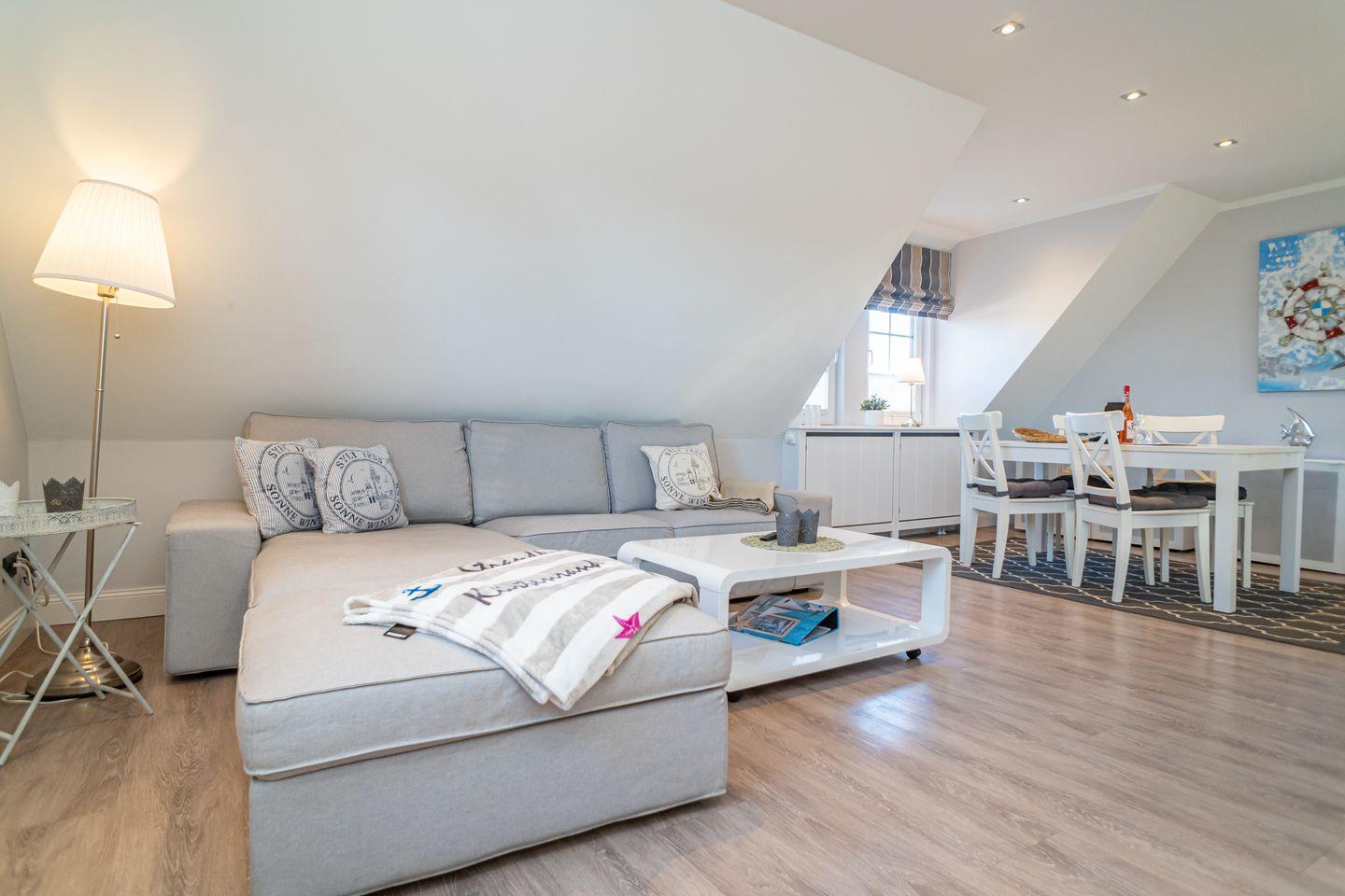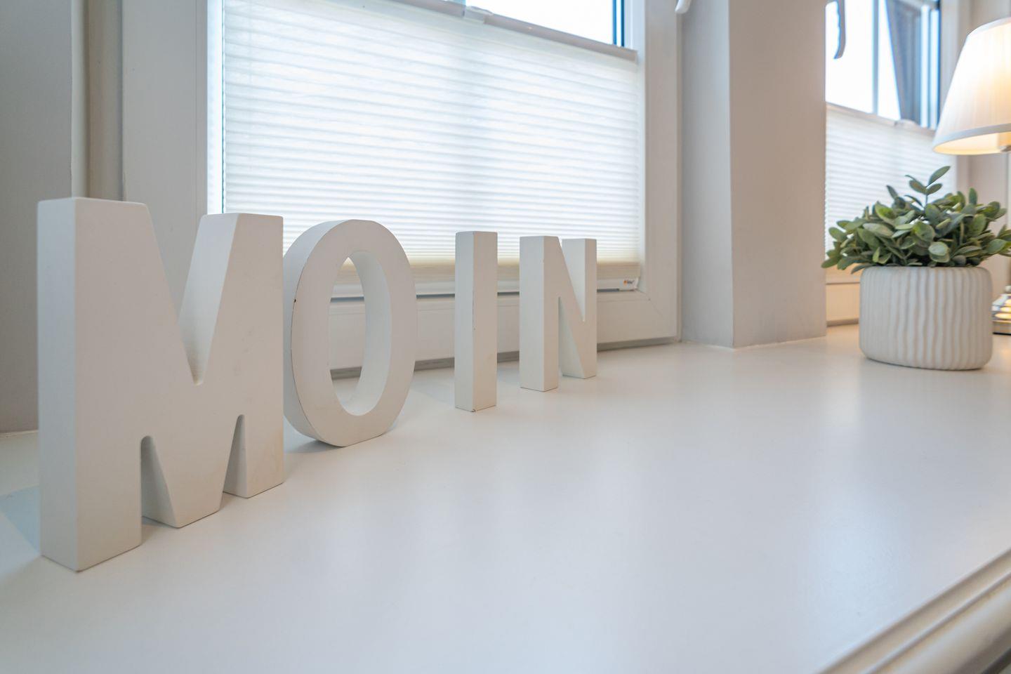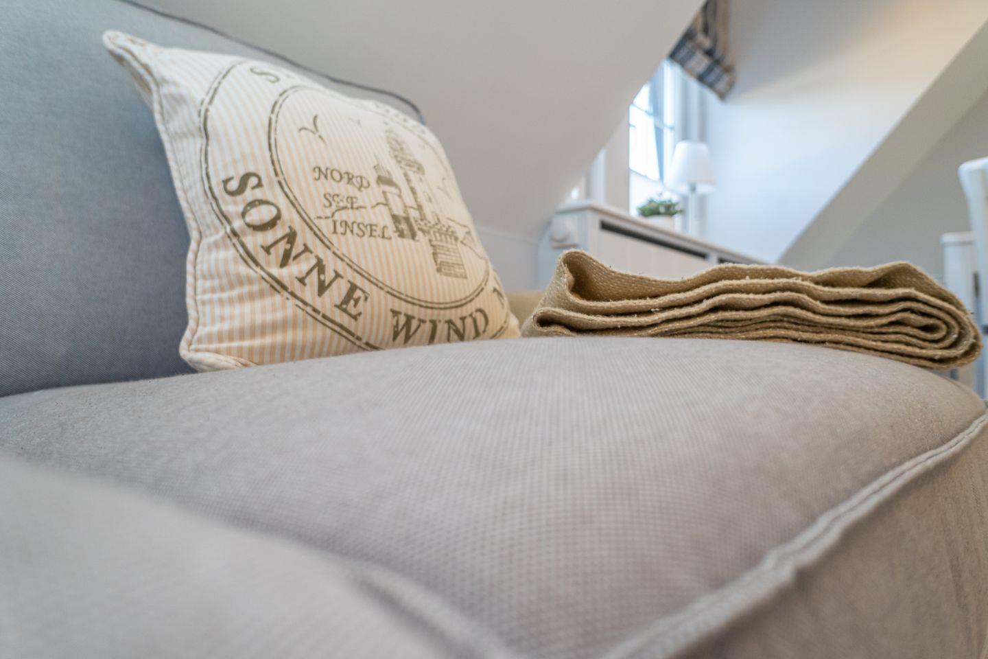 Die gekreideten Töne der Eichendielen ziehen sich durch alle Räumen und sorgen so für eine warme Atmosphäre. Helle Holzarbeiten und stilsichere Farbgestaltung verschaffen dabei eine behagliche Gemütlichkeit, die den nordischen Charakter dieses Appartements im Sylter Strandhaus Look prägt.