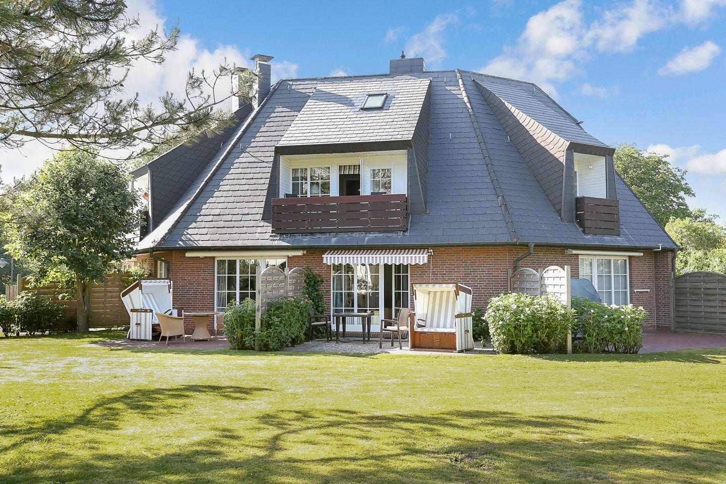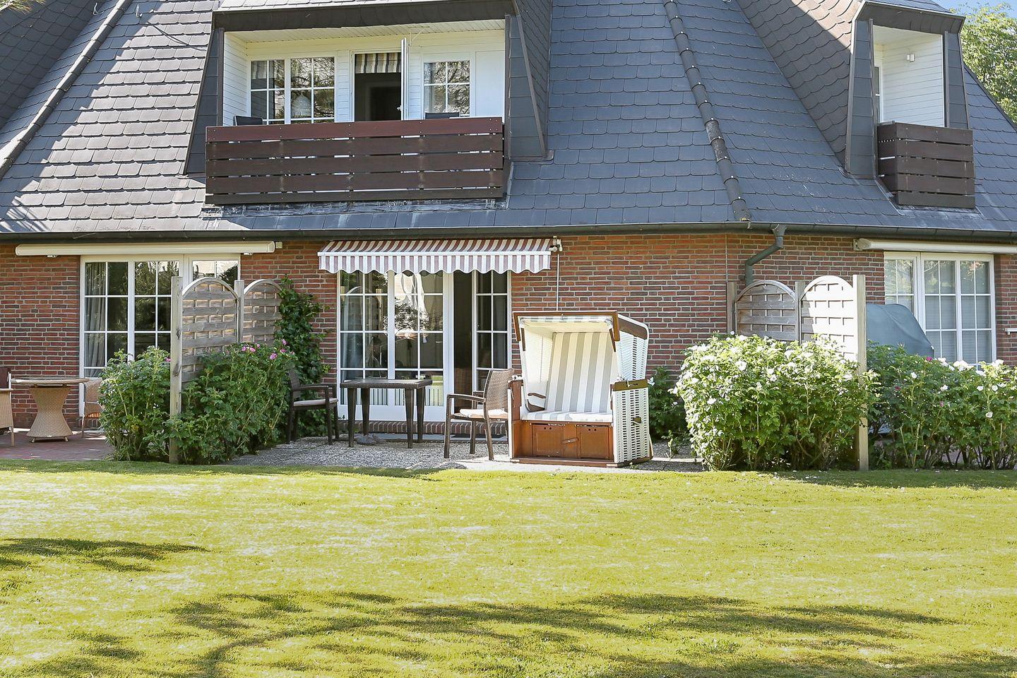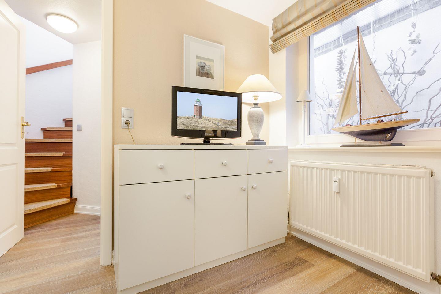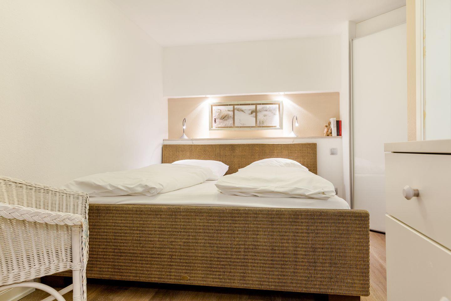 Die Küchenzeile ist in den Wohnbereich integriert und voll ausgestattet. Ein Highlight ist die großzügige, möblierte Terrasse mit dem sylt-typischen Strandkorb. Im Untergeschoss erwartet Sie ein weiterer Raum mit Doppelbett sowie ein Badezimmer mit Dusche und WC.