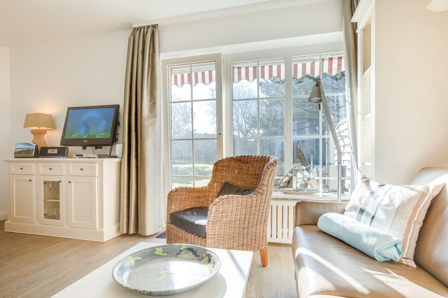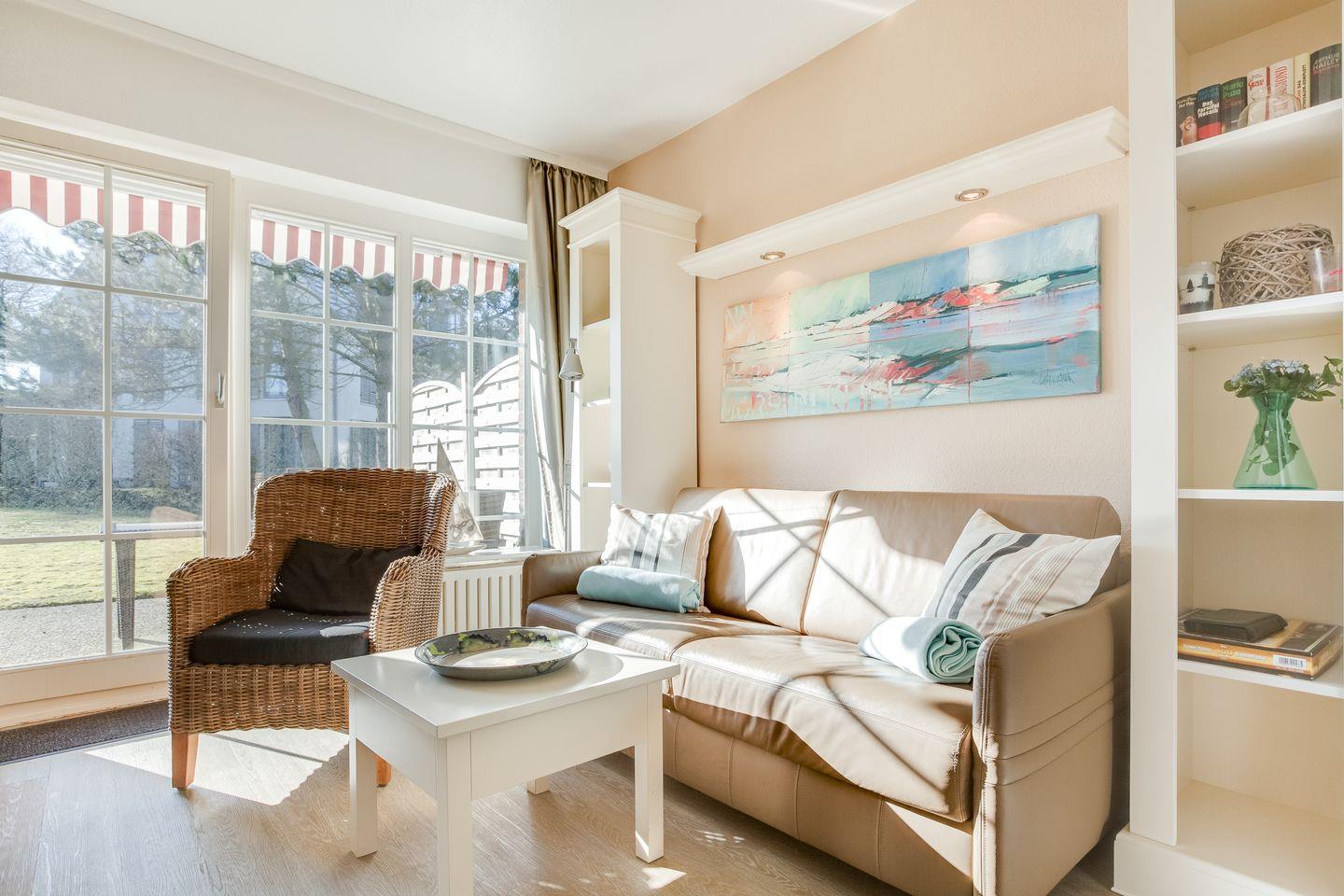 Im Erdgeschoss des Domizils finden Sie einen hellen, gemütlich eingerichteten Wohnraum mit Couchbereich und einem kleinen Esstisch. Durch die bodentiefen Fenster zur Terrasse fällt viel Tageslicht in die Wohnung.