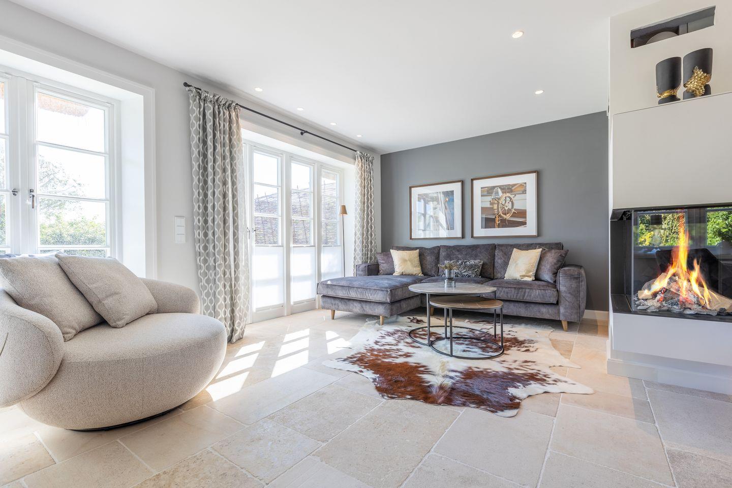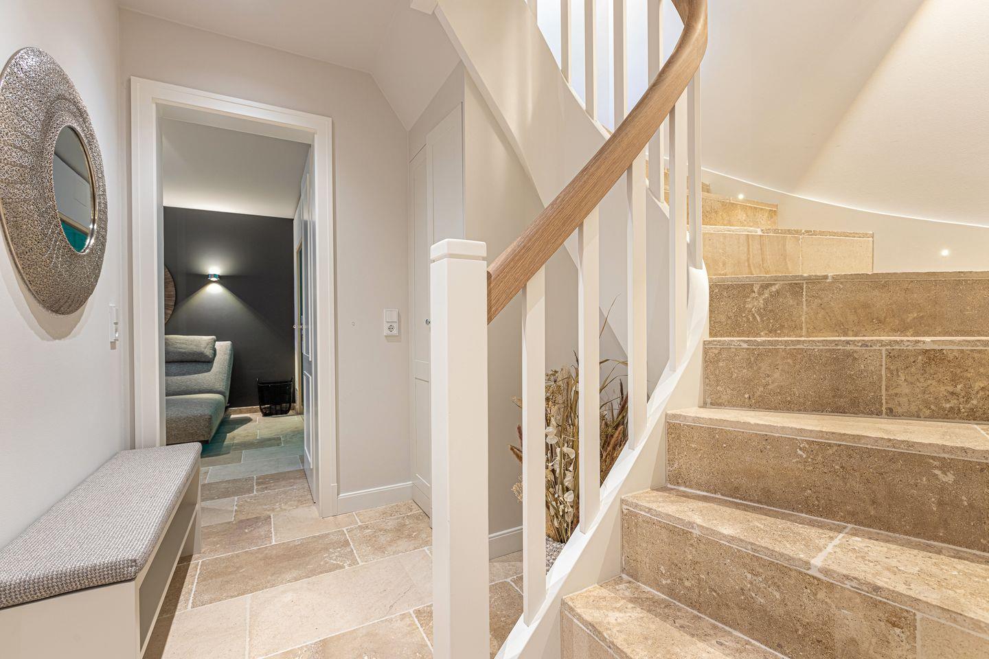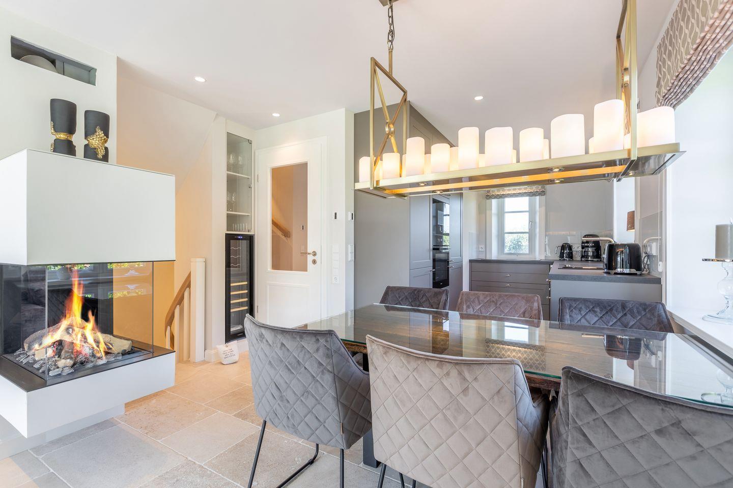 EG: Wohnbereich mit TV und Sonoro Sound System und einem Gaskamin, der Esstisch bietet 6 Personen Platz, die Küche ist sehr gut ausgestattet mit einem Kühlschrank inklusive Eiswürfelbereiter, Induktionskochfeld, Mikrowellen-Backofenkombination, Filter- und Nespressokaffeemaschine und Geschirrspülmaschine, die Terrasse ( Südausrichtung mit Garten ) hat einen Strandkorb, einen Tisch und Stühle, im Erdgeschoß befindet sich noch ein Gäste-WC