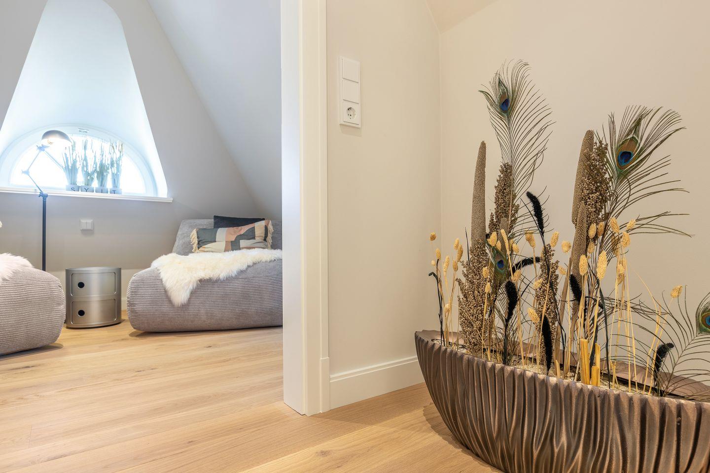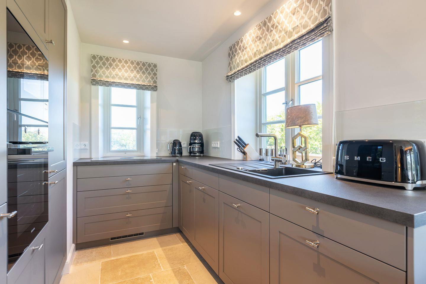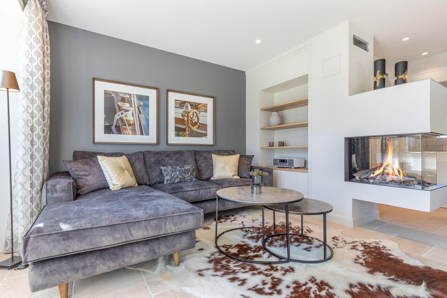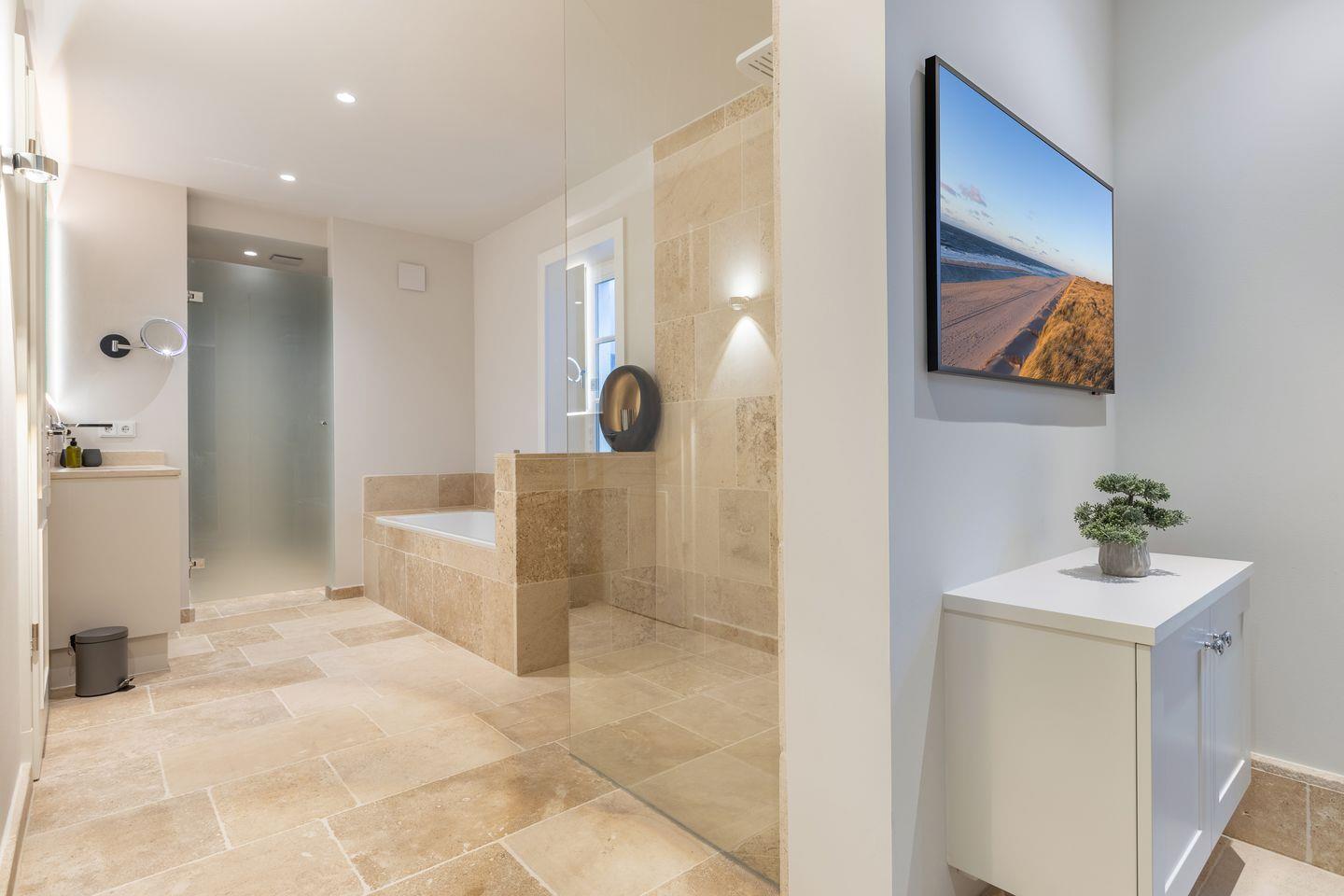 EG: Wohnbereich mit TV und Sonoro Sound System und einem Gaskamin, der Esstisch bietet 6 Personen Platz, die Küche ist sehr gut ausgestattet mit einem Kühlschrank inklusive Eiswürfelbereiter, Induktionskochfeld, Mikrowellen-Backofenkombination, Filter- und Nespressokaffeemaschine und Geschirrspülmaschine, die Terrasse ( Südausrichtung mit Garten ) hat einen Strandkorb, einen Tisch und Stühle, im Erdgeschoß befindet sich noch ein Gäste-WC