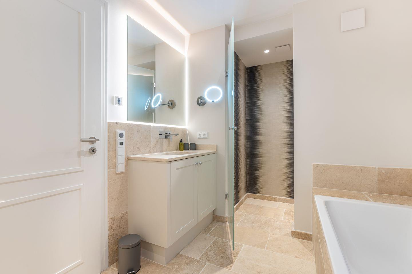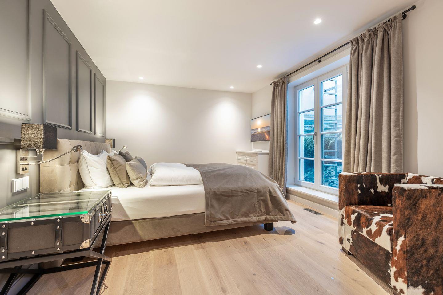 UG: ein Schlafzimmer mit Doppelbett (180 x 200 cm) und TV, ein großzügiger Wellness- /Badbereich mit Sauna, Ruheliegen, großer Dusche (Schwallbrause und Kneippschlauch), Badewanne und WC. Hauswirtschaftsraum mit Waschmaschine und Trockner.