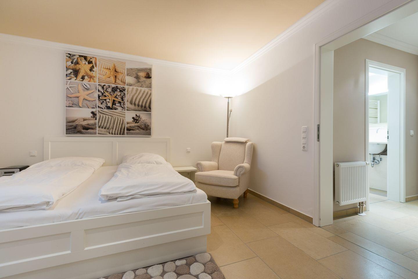 UG: Ein großzügig geschnittener Raum mit Doppelbett (ca. 1,8x2m) und viel Schrankplatz, Flatscreen-TV, CD-Player + Radio. Schönes Bad mit Badewanne/WC. Waschmaschine im separaten Hauswirtschaftsraum.