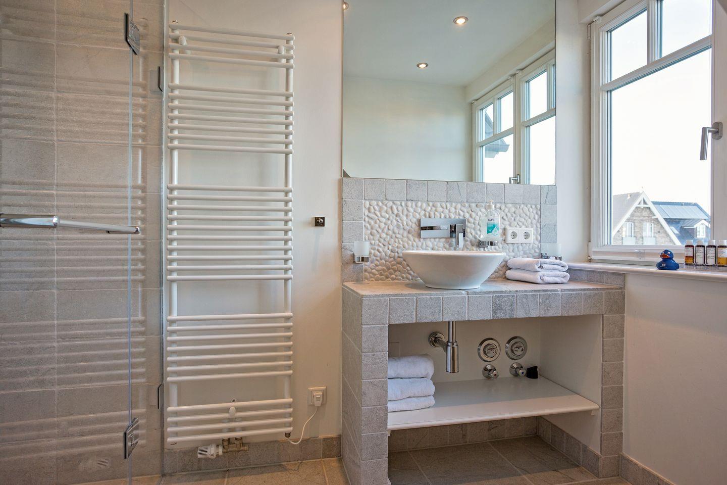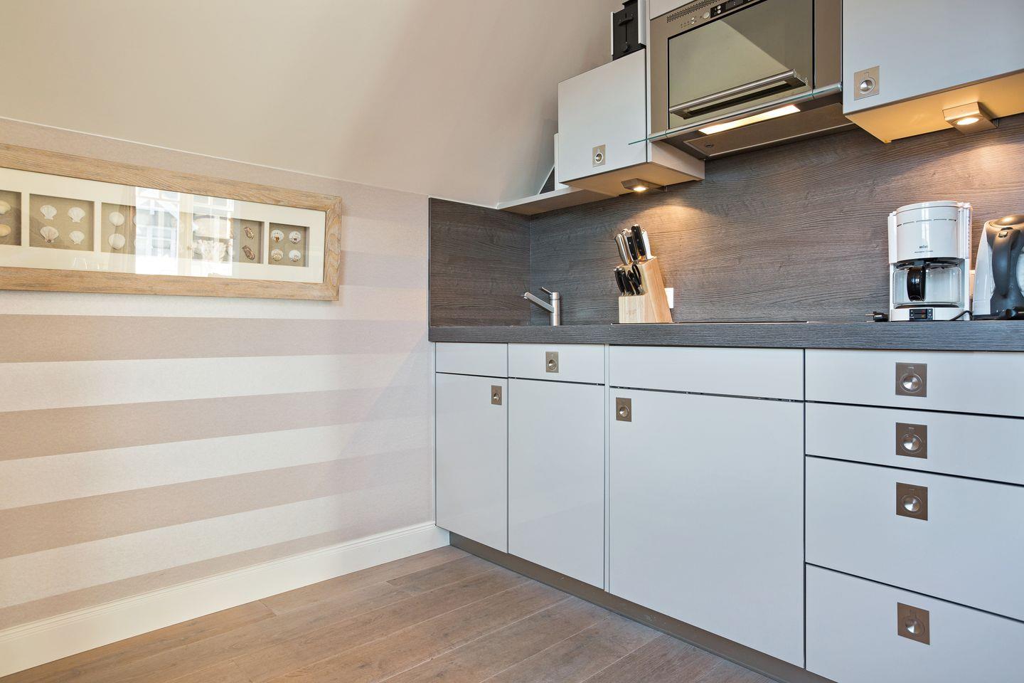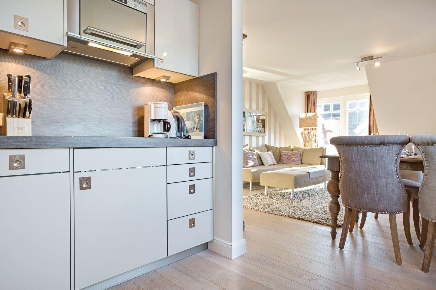 Vom Wohnraum aus erreichen Sie den möblierten Balkon, auf dem Sie im Sommer ein leckeres Abendessen genießen können, das Sie in der top-ausgestatteten Küche des Appartements zubereitet haben. Die Wohnung besticht durch eine außergewöhnliche und moderne Ausstattung, die Ihren Sylt-Aufenthalt zu etwas ganz Besonderem macht. Die Wohnung verfügt über ein helles Tageslichtbad mit Dusche und WC.