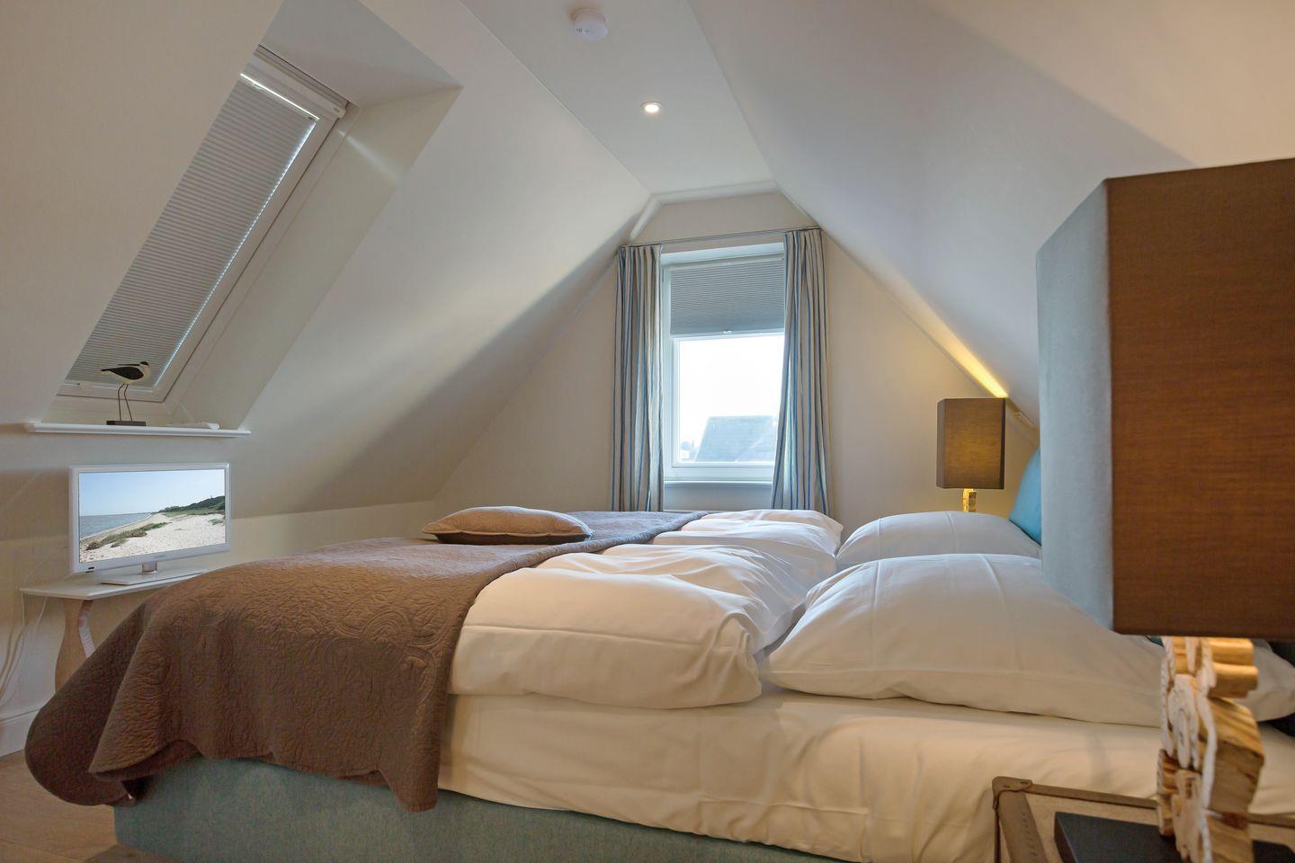 Dachgeschoss: Raum mit Doppel-Boxspringbett 82x90x200cm) und Flatscreen-TV