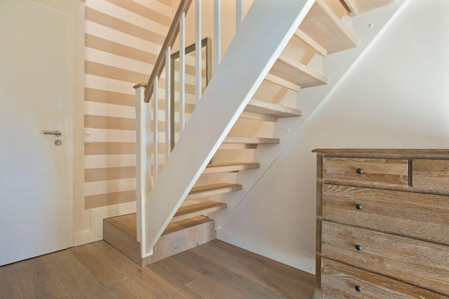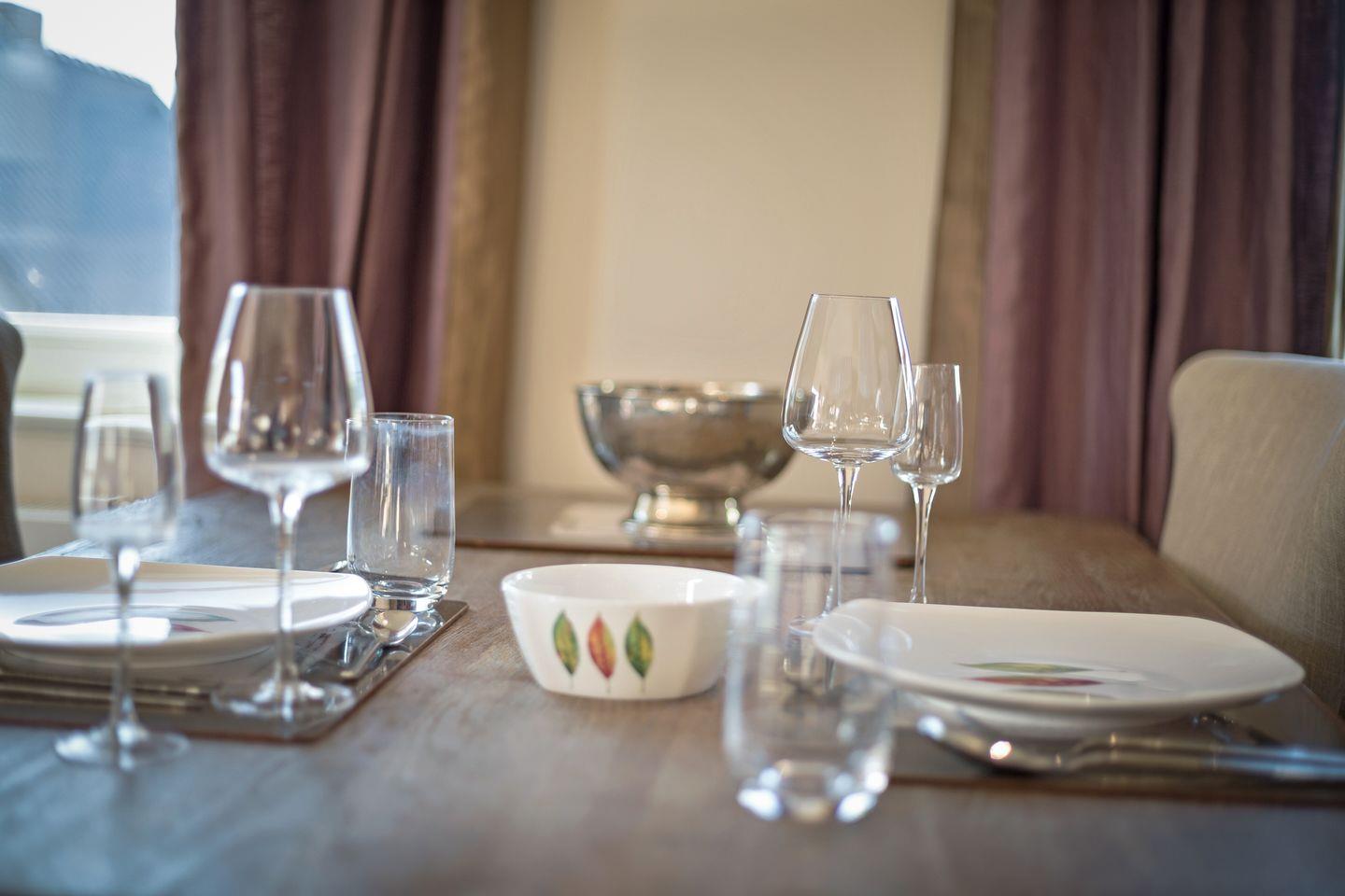 Obergeschoss: Wohnraum mit Sofaecke, Essbereich und Flatscreen-TV, W-LAN, möblierter Balkon, Küchenzeile mit Espressomaschine, Induktionsherd, Mikrowelle und Spülmaschine, Tageslichtbad mit Dusche, WC, Föhn und Handtuchtrockner