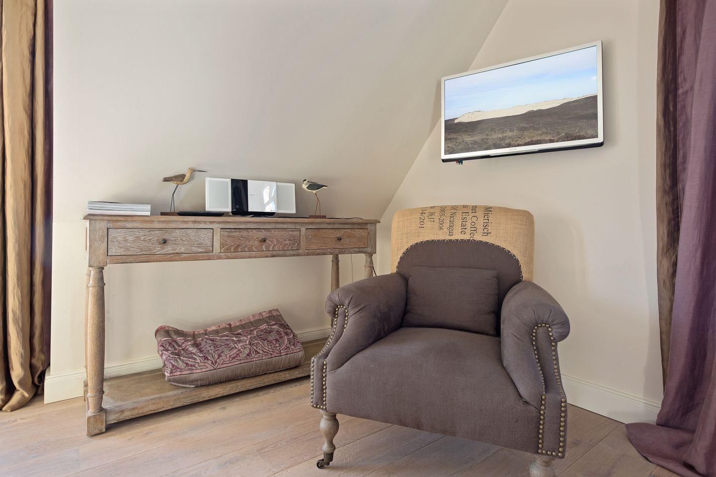 Im Dachgeschoss finden Sie ein gemütliches Schlafzimmer mit Boxspringbett und Flatscreen-TV. Hier werden Ihre Urlaubsträume wahr und Sie werden sich sicher wohlfühlen.