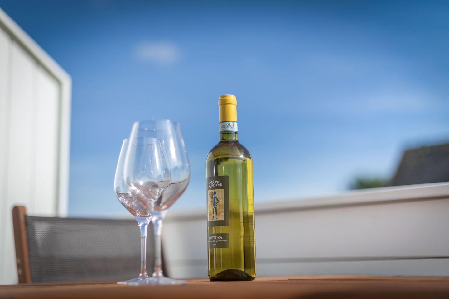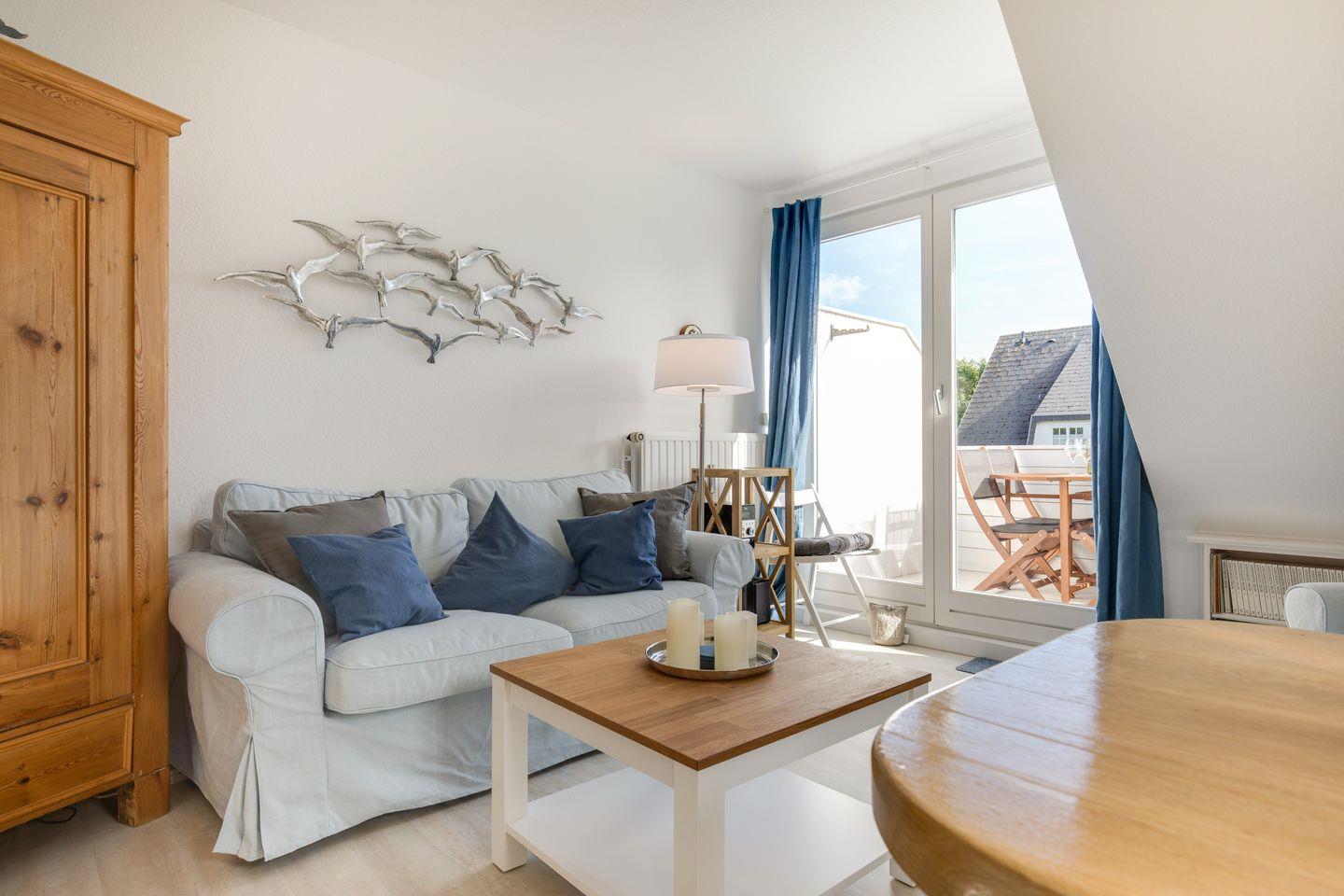 Obergeschoss: Wohnraum mit Smart-TV, Radio und W-LAN, integrierte Küchenzeile mit Geschirrspüler, Backofen und Induktionsherd, ein Schlafraum mit Einzelbett (100x200cm) und einem praktischen Ausziehbett, Duschbad, Balkon mit Gartenmöbeln von April bis Oktober