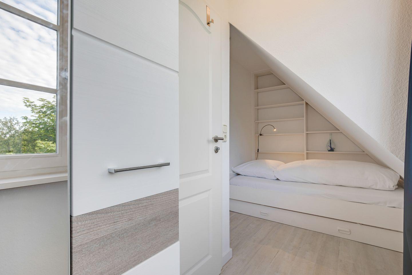 Im gleichen Geschoss wie die Wohnküche befindet sich ein Tageslichtbad mit Dusche und ein kleines Schlafzimmer mit einem gemütlichen Einzelbett und einem zusätzlichen Ausziehbett in einer Nische. Im Dachgeschoss finden Sie dann ein weiteres Schlafzimmer mit einem großzügigen Doppelbett.