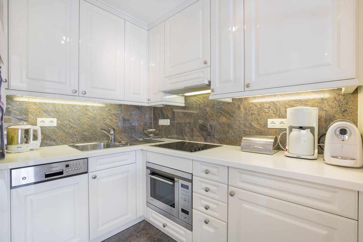OG: Sehr geschmackvoll und hochwertig eingerichteter, heller Wohnraum mit Flat-TV, Hifi-Anlage und Telefon. Gemütliche Sitzecke. Optisch durch hochwertige Tischlerarbeiten getrennte Küche mit Geschirrspüler und Backofen-Microwellenkombination. Safe. Wohlfühlbad mit Dusche und WC sowie Waschmaschine und Trockner. Sehr schöner, großzügiger Süd-Balkon mit Gartenmöbeln (ca. von April - Oktober).